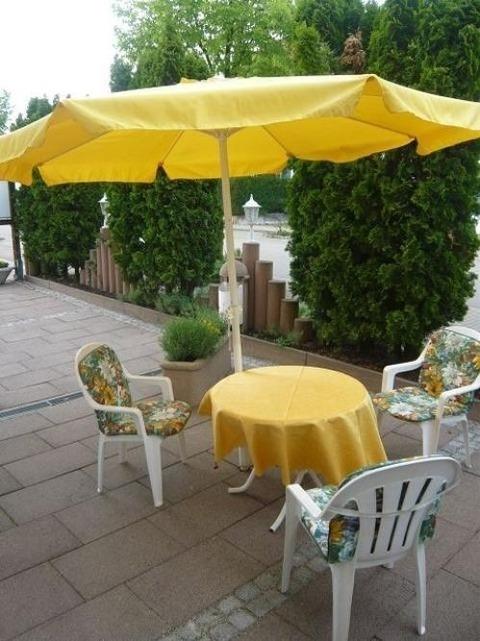 Ein möblierter Sitzplatz -im Sommer überdacht-steht unseren Gästen zur Verfügung.