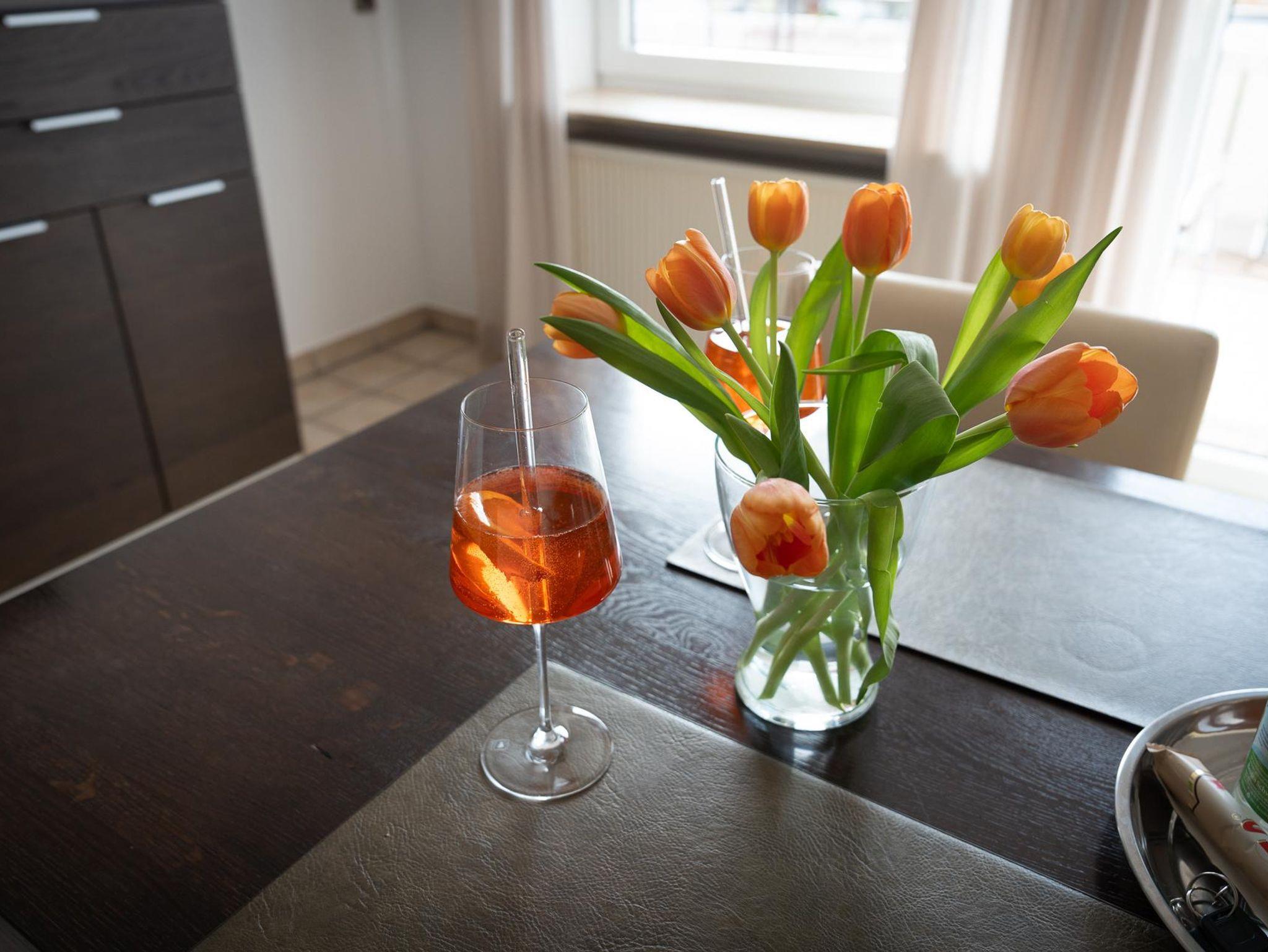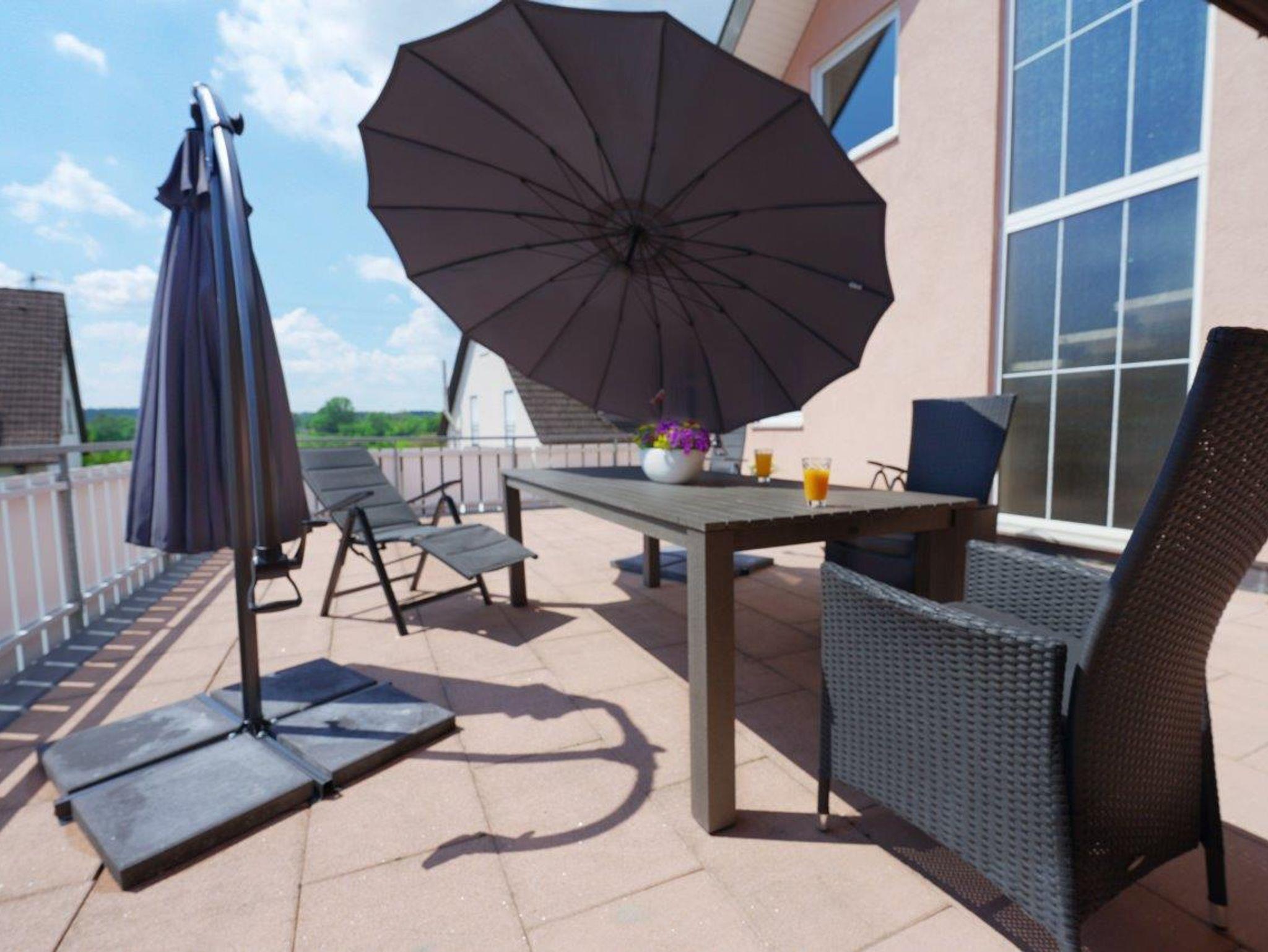 Sie betreten die Wohnung über eine kleine Diele und kommen in die Küche mit Essecke. Das Wohnzimmer hat einen Ausgang auf die Terrasse. Dort laden gemütliche Gartenmöbel zum Verweilen ein.