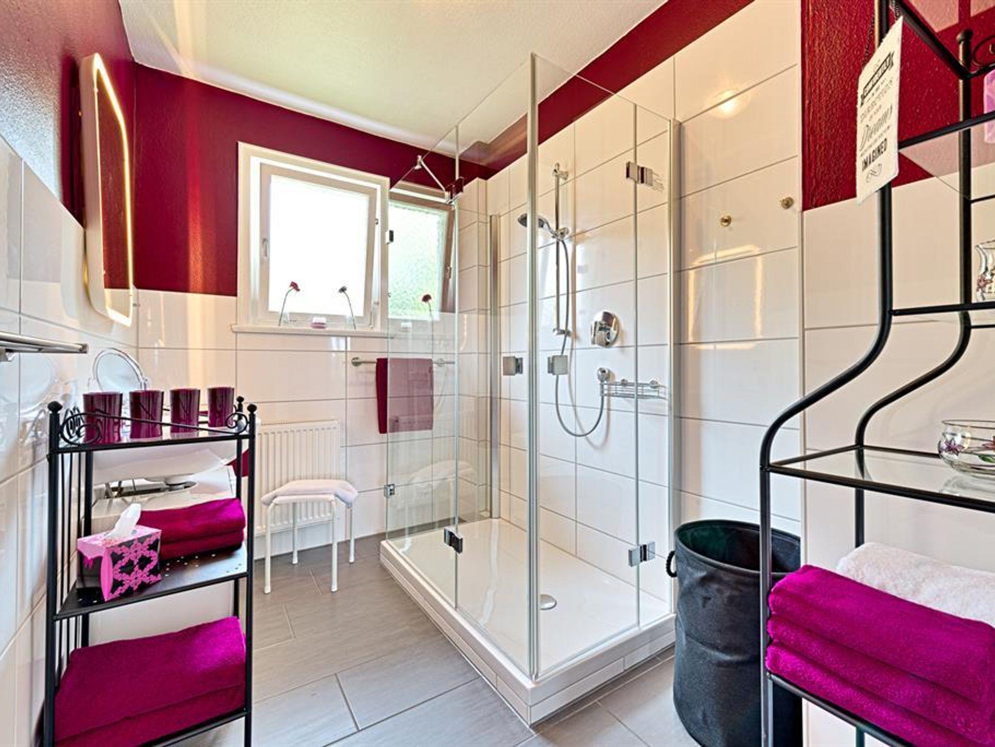 Das ebenfalls neu renovierte Bad verwöhnt mit extra großem Duschbereich.