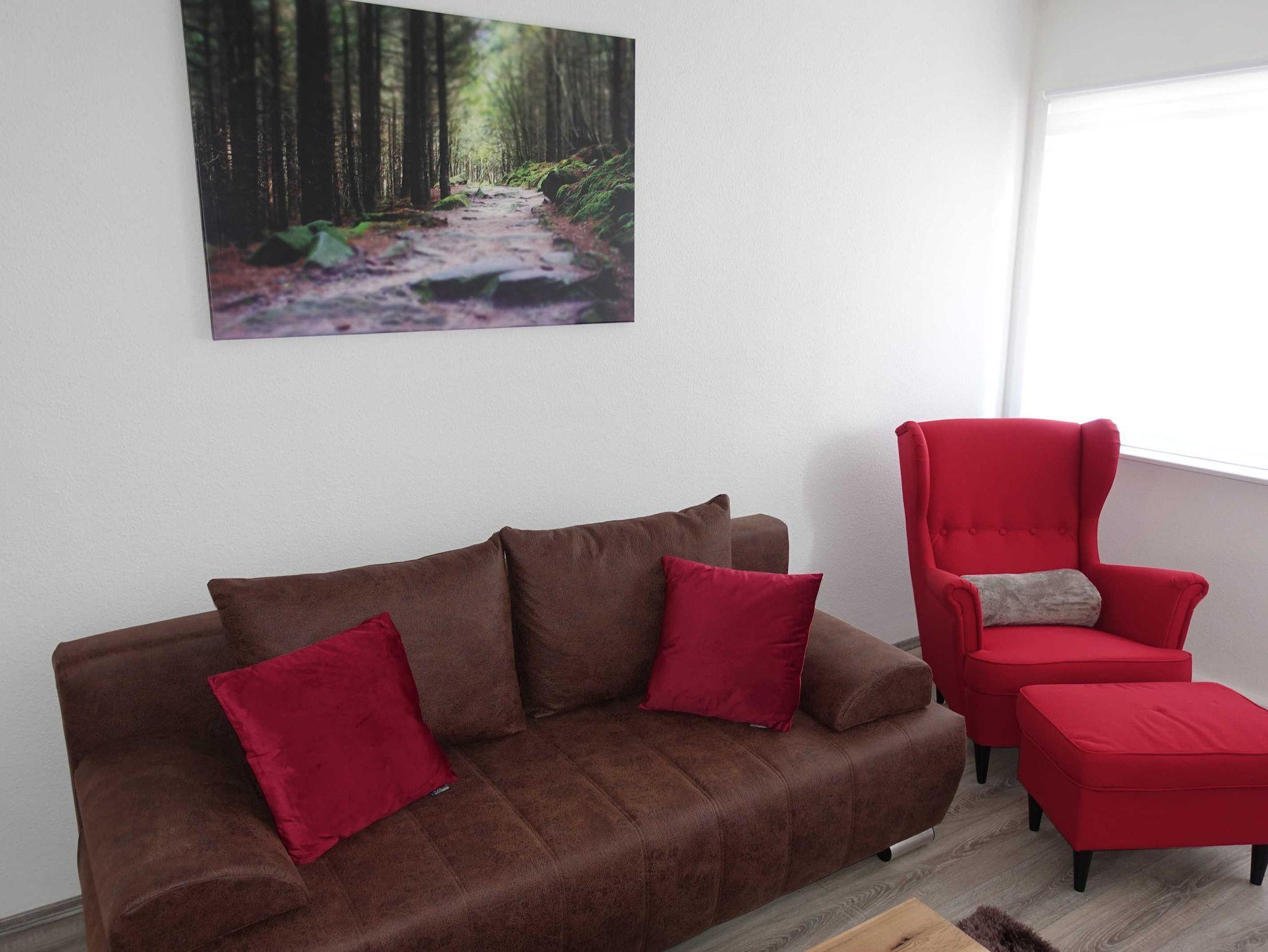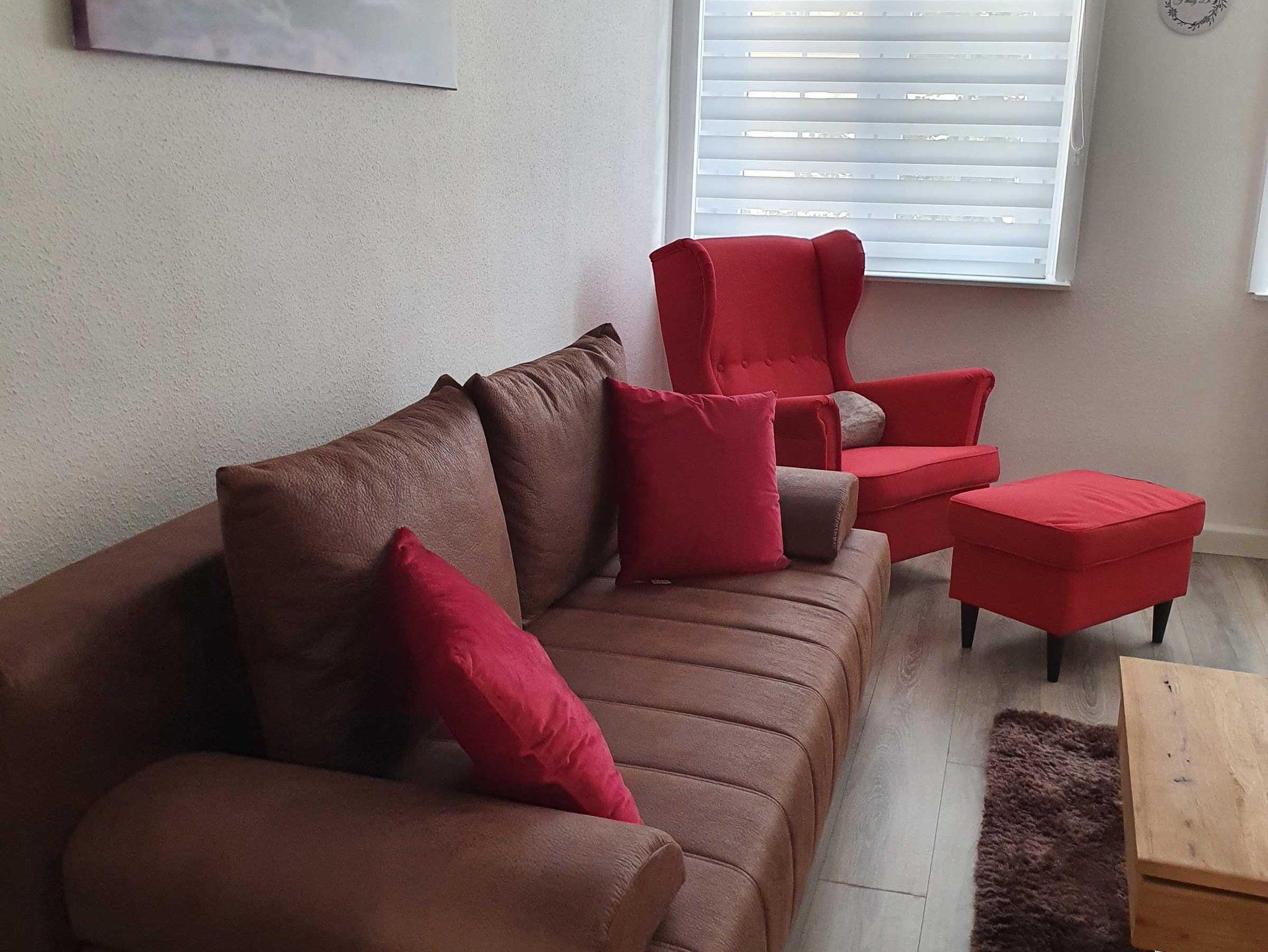 Der Wohnbereich verfügt über ein Sofa, einen Ohrensessel sowie einen Flachbildfernseher. Sie genießen die Programmvielfalt von MagentaTV der Deutschen Telekom.