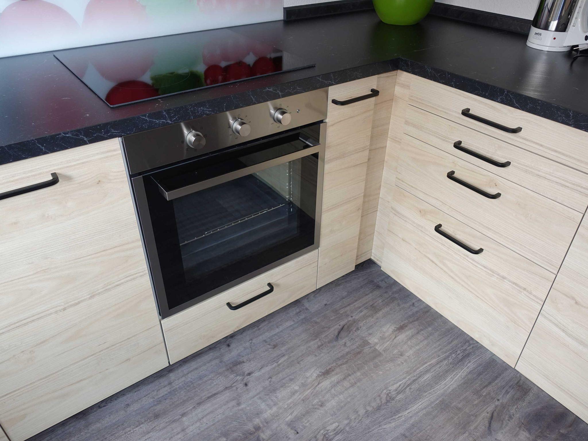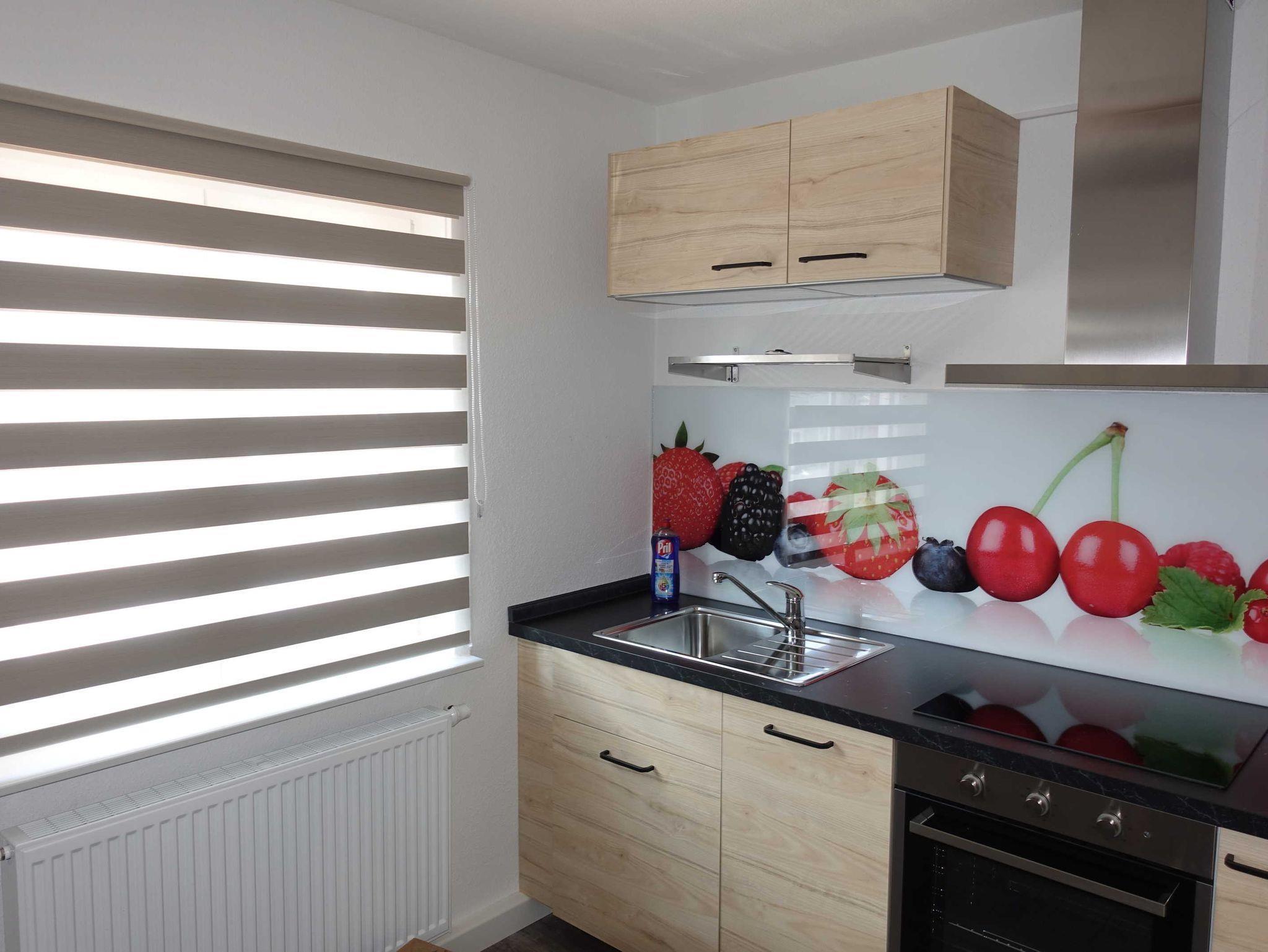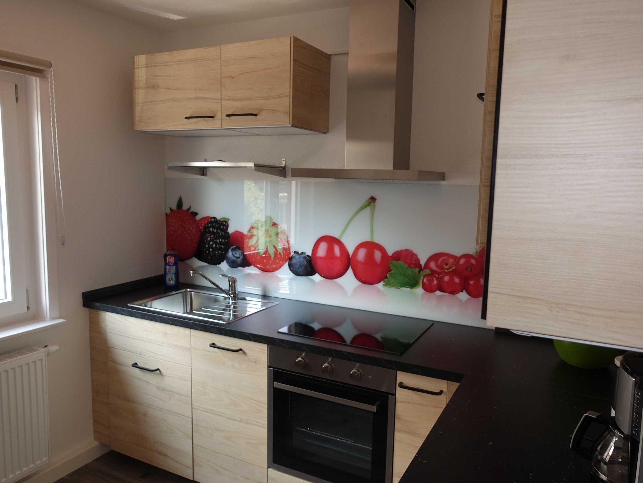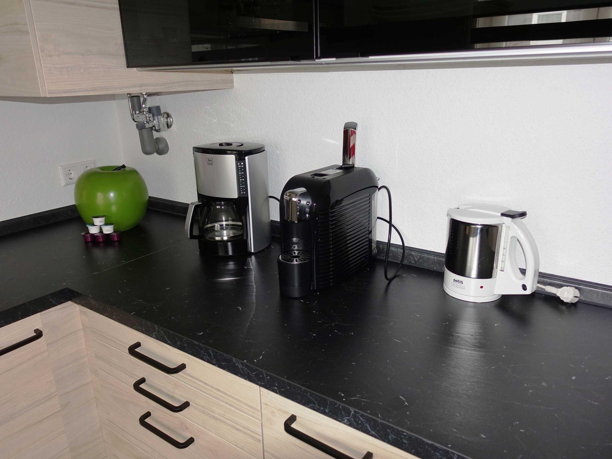 Die Küche verfügt über ein großes Glaskeramik-Kochfeld, einen Backofen, Kühlschrank, Spülmaschine, Kaffeemaschine, Wasserkocher und einen Frühstückstisch.