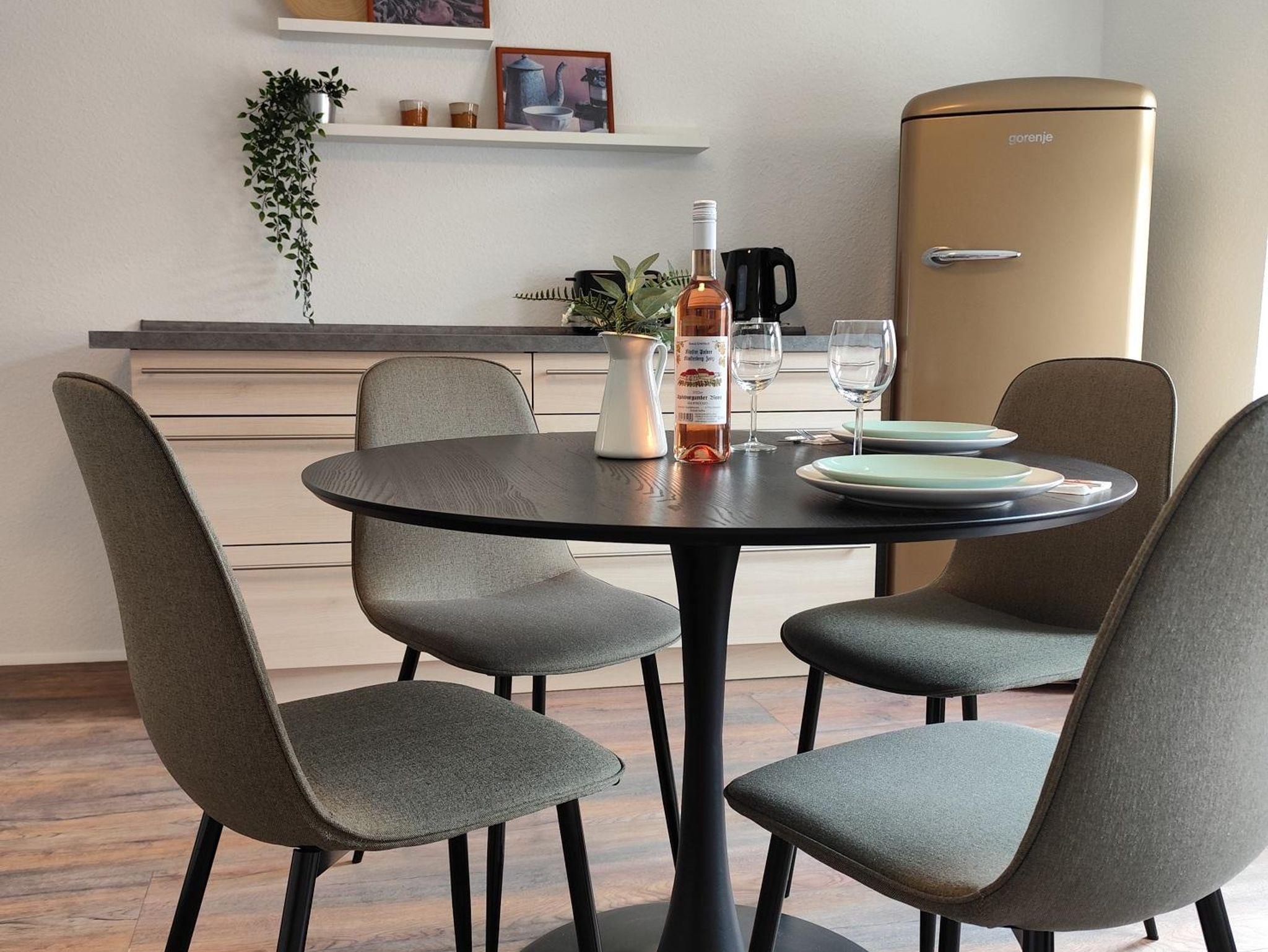 Die einladende und voll ausgestattete Küche ist das Herzstück der Wohnung. Hier erwartet Sie nicht nur modernste Ausstattung, sondern auch ausreichend Platz, um köstliche Mahlzeiten zuzubereiten. Der große Esstisch lädt dazu ein, gemeinsame Momente zu genießen, sei es beim Frühstück vor einem Tag voller Unternehmungen oder beim Abendessen nach einer Erkundungstour durch die malerische Umgebung.