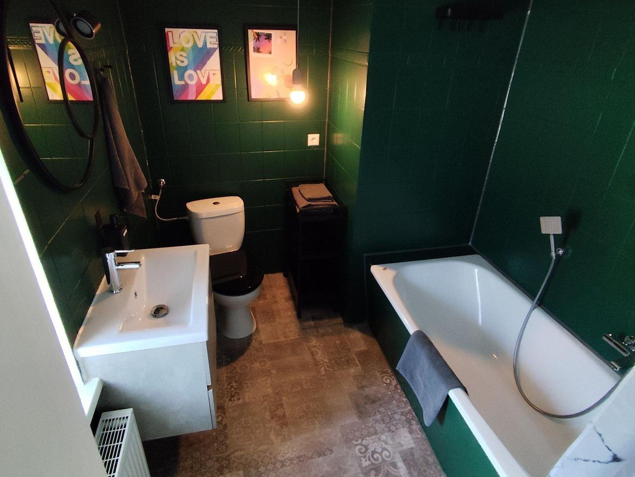 Das Badezimmer wartet nicht nur mit einer Dusche auf, sondern auch mit einer Badewanne zum Entspannen. Außerdem finden Sie hier einen Föhn und Handtücher.