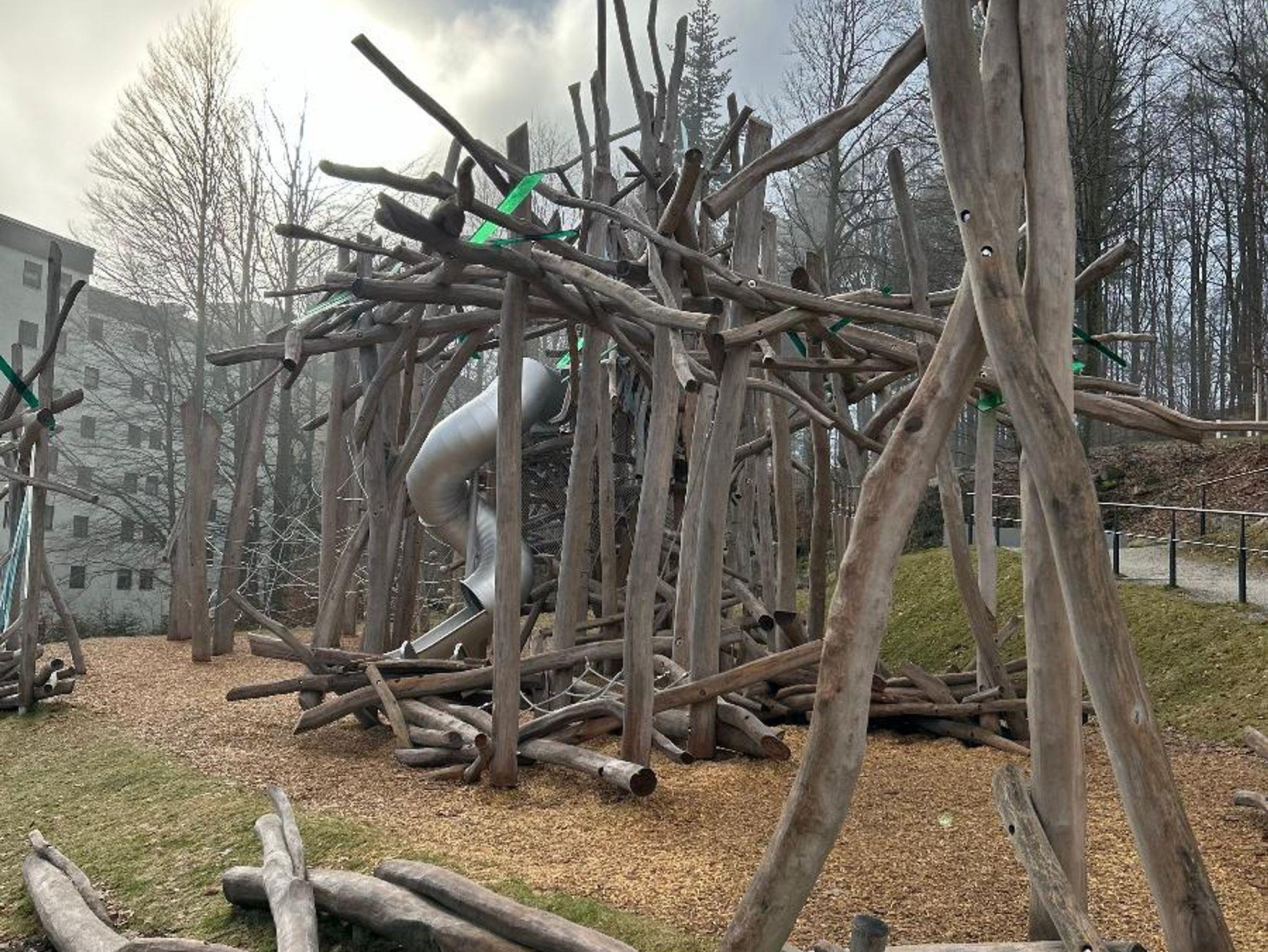 Direkt neben der Ferienanlage befindet sich ein großer Kletterspielplatz mit einzigartiger Kletterwolke und ein Bewegungsparcours. Ideal für Familien mit Kindern.