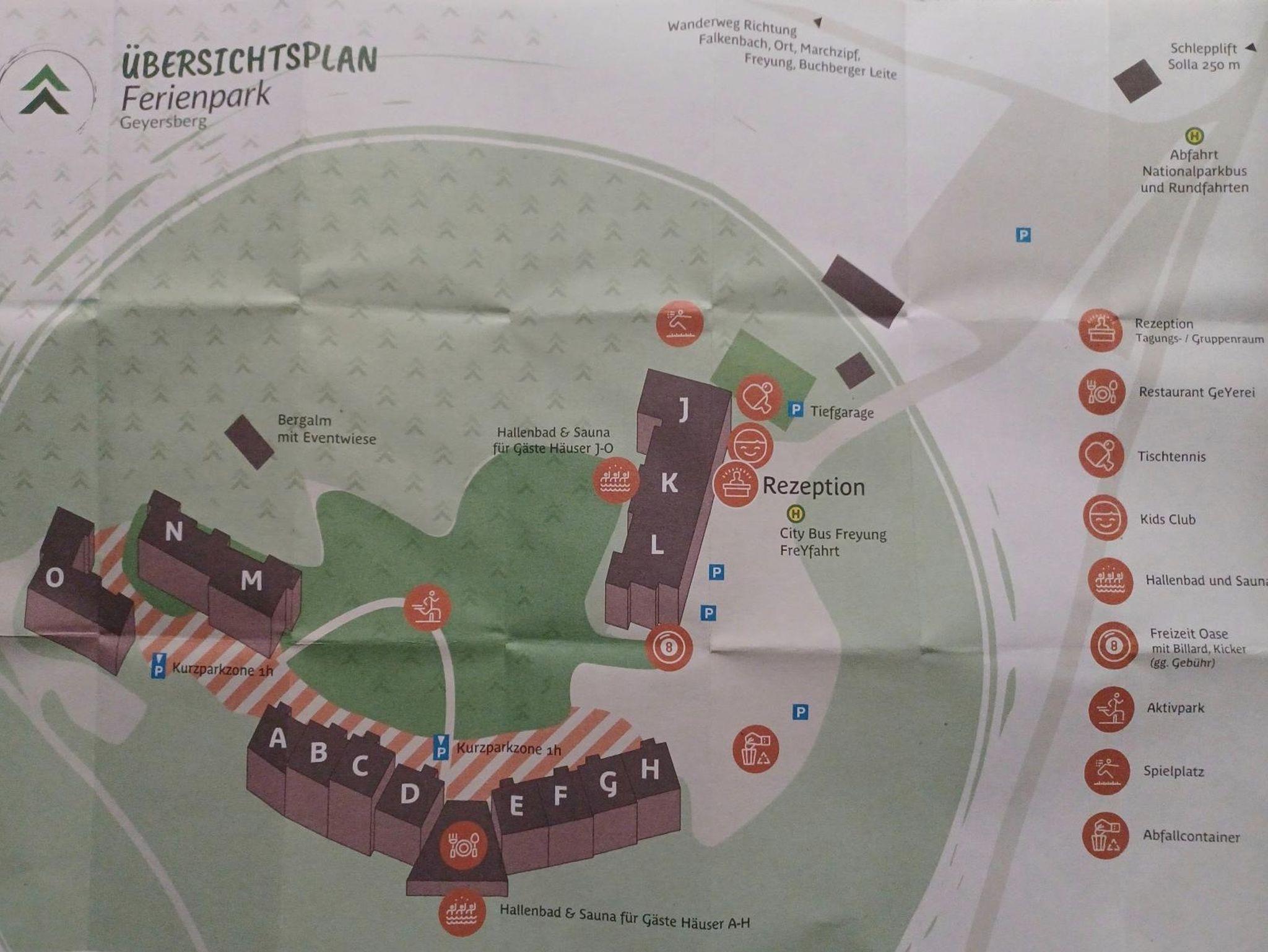 Der Ferienpark bietet: kostenloses Hallenbad, Sauna, Kinderspielplatz, Aktiv-Kletterpark-Nutzung, Spielzimmer mit Billard, Dart, Kicker, Flipper (gegen Gebühr), Aufzug und kostenlose Parkplätze vor dem Haus. Auf dem schön angelegten ehemaligen Landesgartenschau Gelände im Jahr 2023 können ausgedehnte Spaziergänge unternommen werden (Eintritt frei).