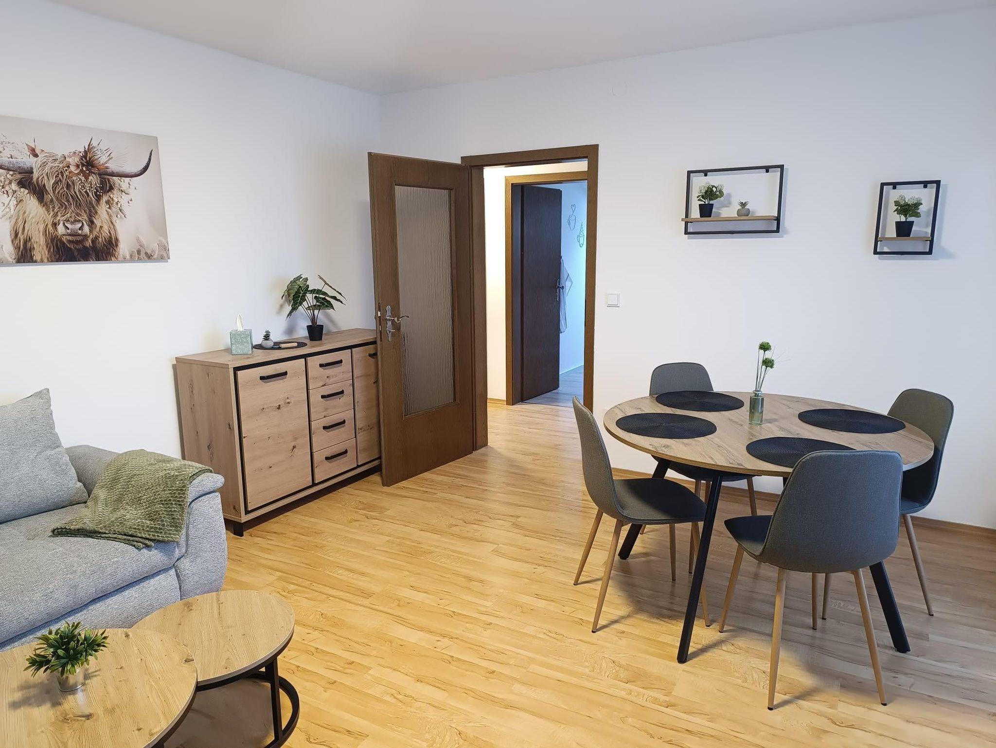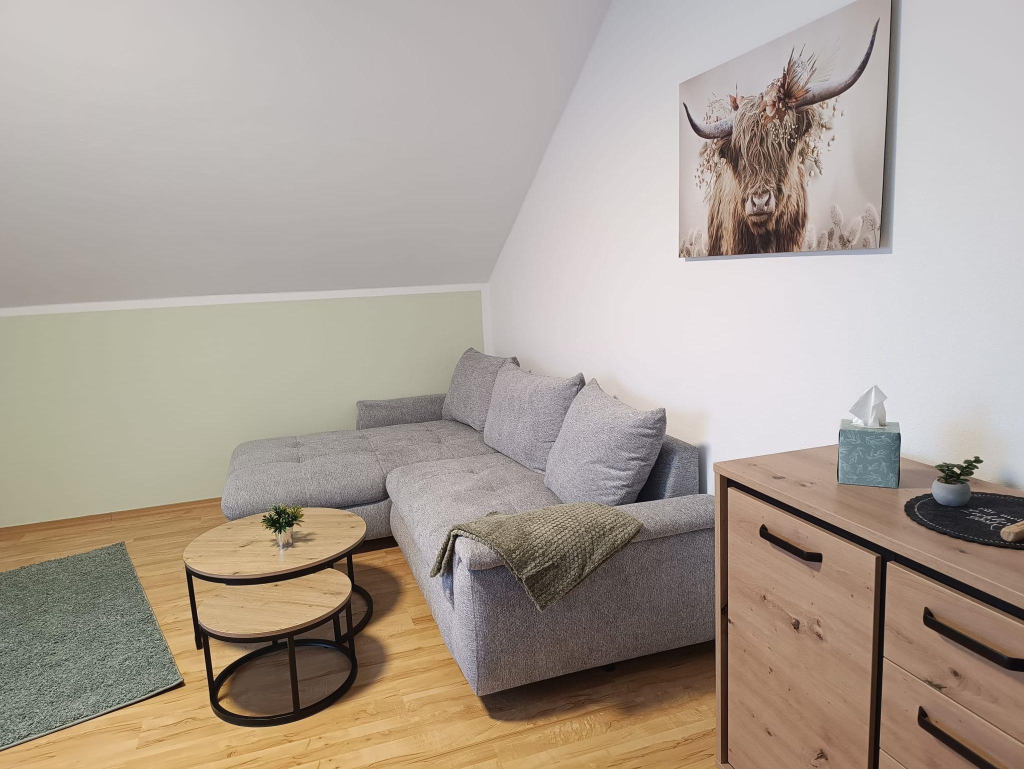 Unsere gemütlich eingerichtete Ferienwohnung mit 55 m² Wohnfläche befindet sich im 1. Stock und bietet Platz für 2-4 Personen. Die komplett ausgestattete Küche mit Kühlschrank, Herd, Backofen, Wasserkocher, Toaster, Kaffeemaschine und einer Grundausstattung an Geschirr, Gläser und Besteck lässt keine Wünsche offen. Im Wohnbereich befindet sich ein Esstisch, eine Schlafcouch, ein TV mit SAT-Empfang und Zugang zum Balkon mit einem herrlichen Blick ins Grüne. Die Ferienwohnung verfügt über ein Schlafzimmer mit einem Doppelbett. Weitere Gäste finden auf dem bequemen Schlafsofa im Wohnbereich Platz. Das Badezimmer bietet eine Dusche und ein WC. Bettwäsche, Handtücher, kostenfreie WLAN-Nutzung, Parkplatz und Endreinigung sind im Preis enthalten. Bitte beachten Sie, dass Haustiere nur nach Absprache erlaubt sind.