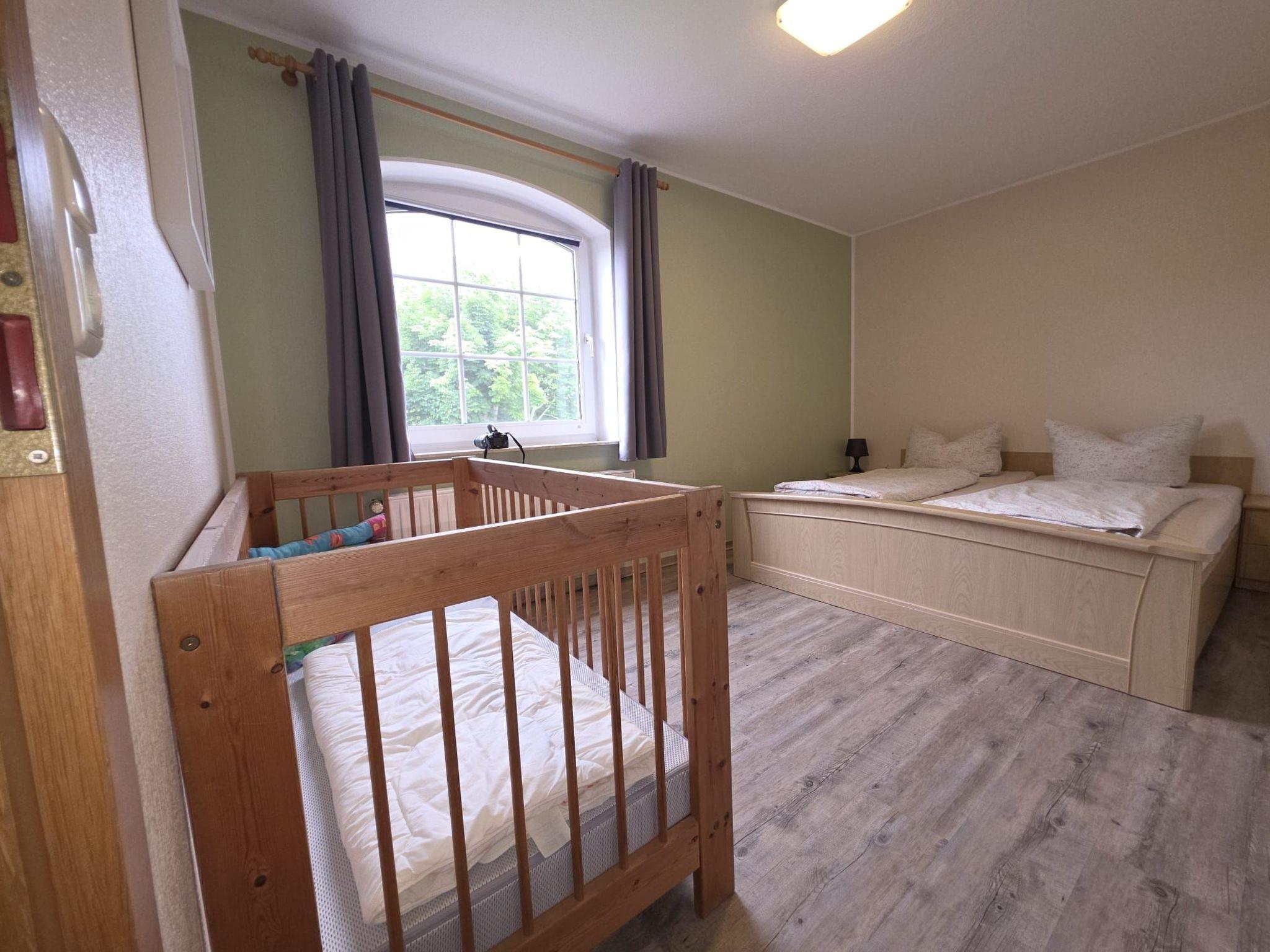 Two bedrooms, each with a double bed and wardrobe, complete the non-smoking flat. On request, we can equip one bedroom with a cot and changing table.