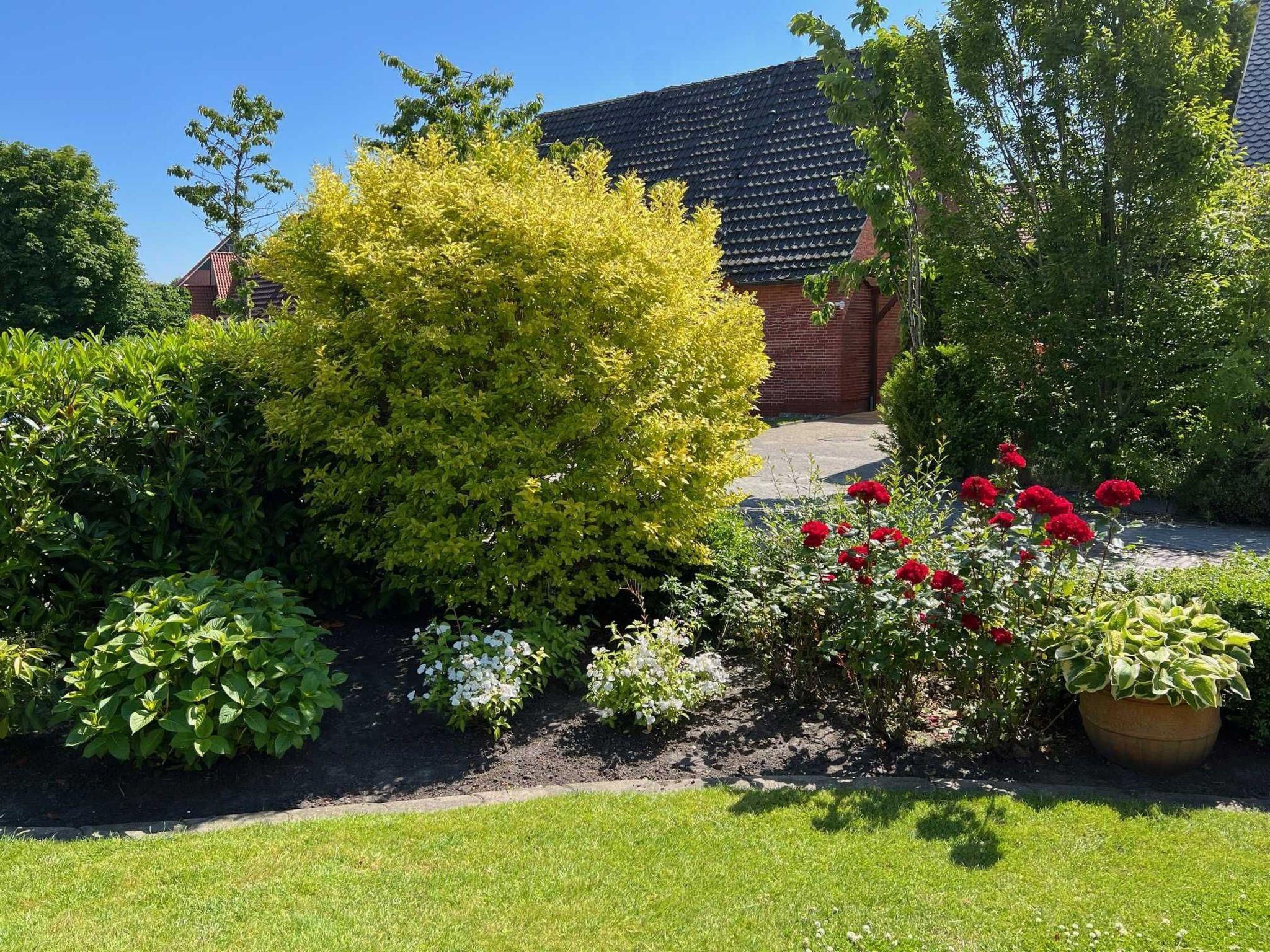 The outdoor area of the holiday flat has a garden for communal use with covered outdoor seating and beach chairs, inviting you to linger outdoors. The e-bike parking space in the garage also offers the opportunity to park your own or borrowed bikes safely and dryly. So nothing stands in the way of an exploratory tour on two wheels.
