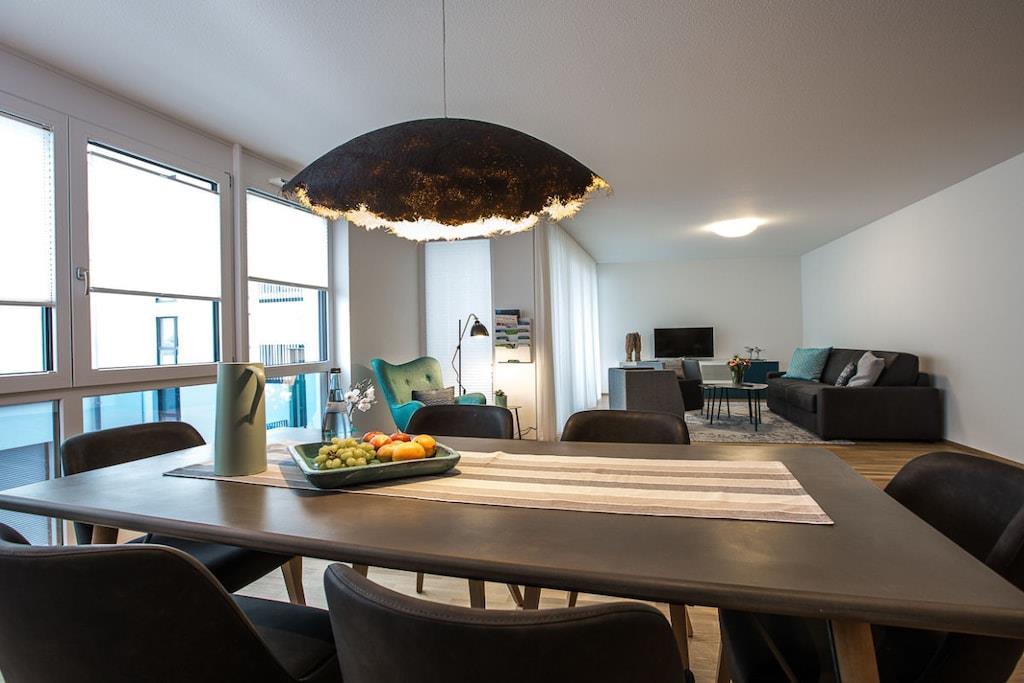 Die Ferienwohnung verfügt über eine gehobene Ausstattung, bietet zwei Schlafzimmer und eine separate Schlafcouch und somit Platz für bis zu 6 Erwachsene. Weitere Features: - 1 Schlafzimmer mit 200 er Boxspringbett mit Komfortmatratze - 1 Schlafzimmer mit 160 er Boxspringbett mit Komfortmatratze - komfortable Schlafcoach bietet zusätzlich für 2 Personen eine Schlafmöglichkeit. - Kinderreisebett auf Anfrage verfügbar, ebenso Kinderstuhl und Babybadewanne - sehr großes Badezimmer mit Badewanne und separater Duschkabine, Doppel-Waschtisch und Toilette - separates Gäste WC - großzügige Garderobe im Flurbereich - offenes Wohn- und Esszimmer mit umfangreichem Küchenequipment, und einem Esstisch für 6 Personen - Nespresso Kaffeemaschine - 3 moderne Smart- TVs mit High-Speed W-LAN - großzügiger Balkon mit Platz für bis zu 6 Personen - eigener Tiefgaragenstellplatz und Fahrradkeller direkt im Haus. - Waschmöglichkeiten auf Anfrage, Bügelbrett etc. sind vorhanden. Alle Räume (bis auf das Bad) sind mit Eichenholzparkett und einer Fußbodenheizung ausgestattet Bis zum See sind es nur 600 m, die Region lässt sich von hier aus perfekt erkunden.