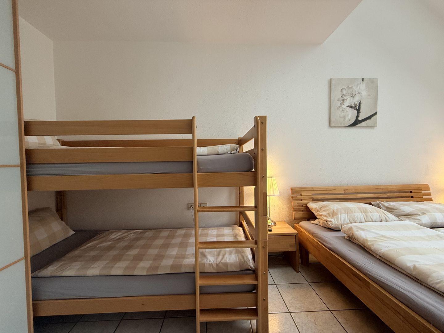 Die Wohnung verfügt über zwei Schlafzimmer. Eines ist mit einem großen Doppelbett ausgestattet, das zweite bietet ebenfalls ein Doppelbett sowie ein Stockbett für zwei Kinder. In beiden Schlafzimmern steht Ihnen ein Fernseher zur Verfügung. Der offene Wohnbereich mit gemütlicher Sitzecke lädt zum Entspannen ein. Die angrenzende Küche mit Essbereich ist voll ausgestattet mit Herd, Backofen, Kühlschrank, Geschirrspüler und Kaffeemaschine, sodass Sie sich bequem selbst versorgen können. Ein modernes Badezimmer mit Dusche sowie ein überdachter Balkon runden das Angebot ab und sorgen für ein angenehmes Wohngefühl.