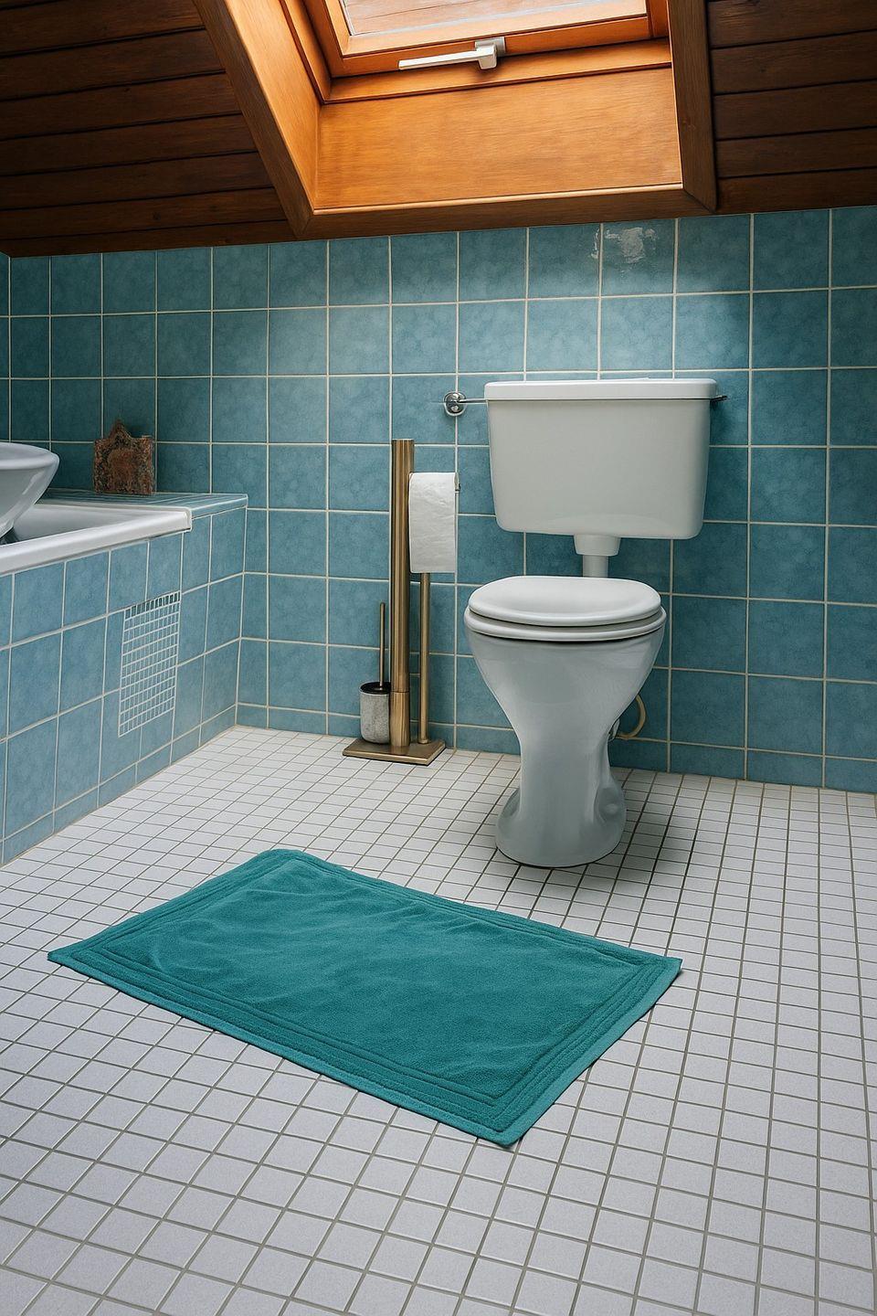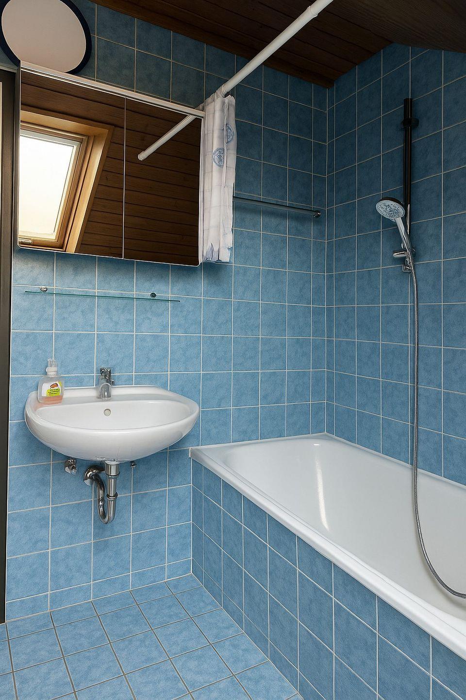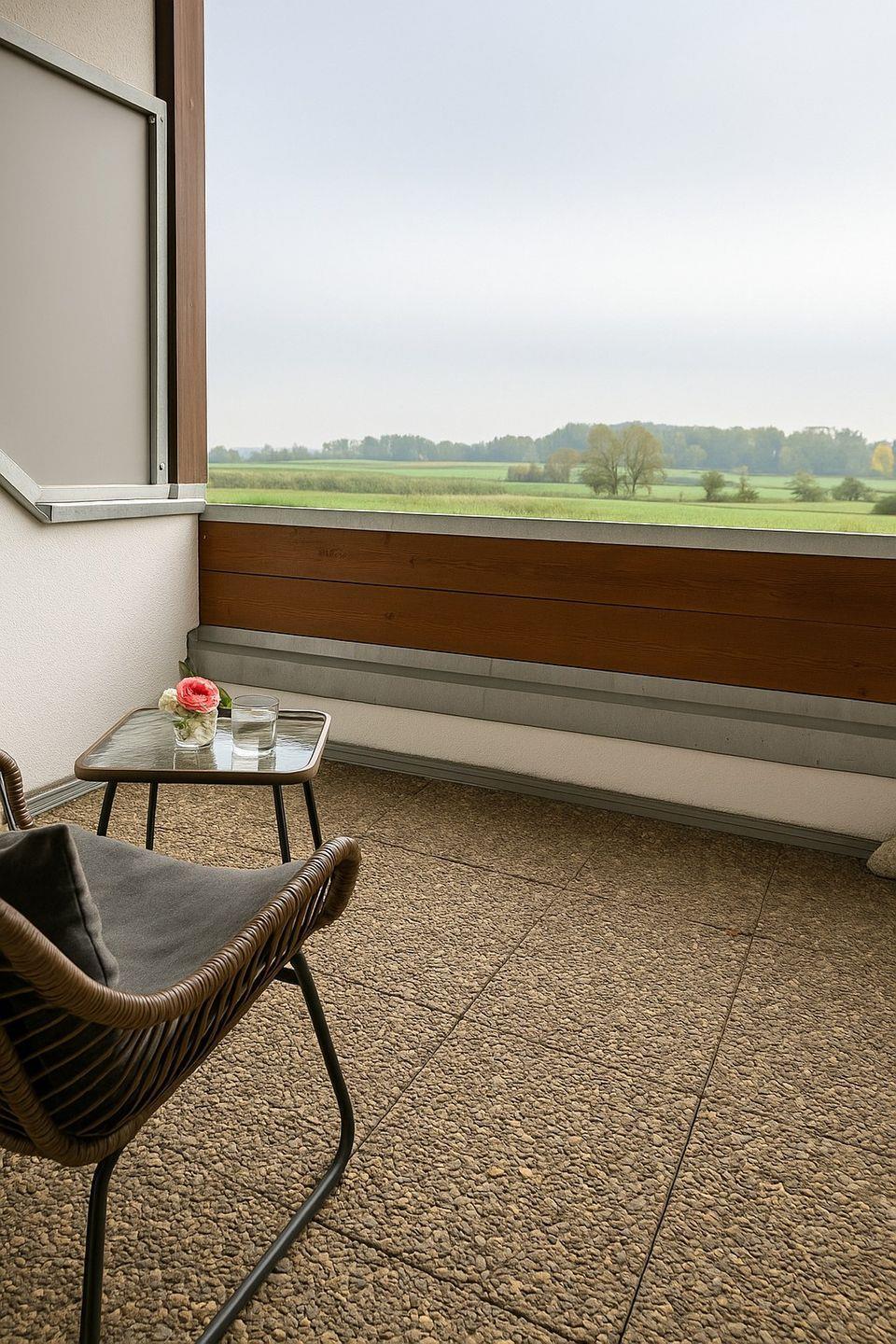 Das Badezimmer ist hell und gepflegt und verfügt über eine Badewanne mit Duschmöglichkeit, ein Waschbecken, Spiegel und WC. Ein besonderes Highlight ist der kleine, überdachte Balkon mit Sitzgelegenheit und Blick über Felder und Wiesen – ideal für den Morgenkaffee oder zum Entspannen am Abend.