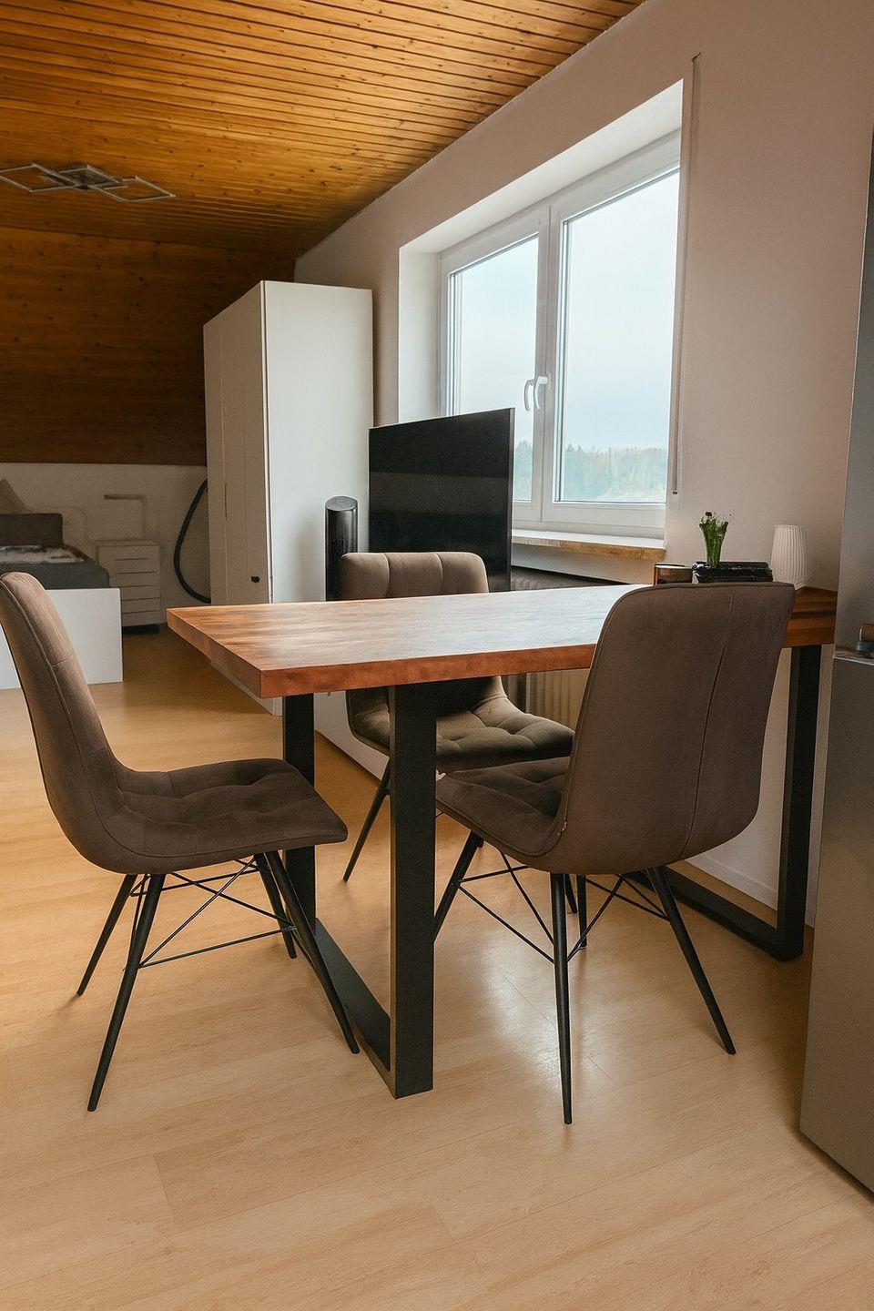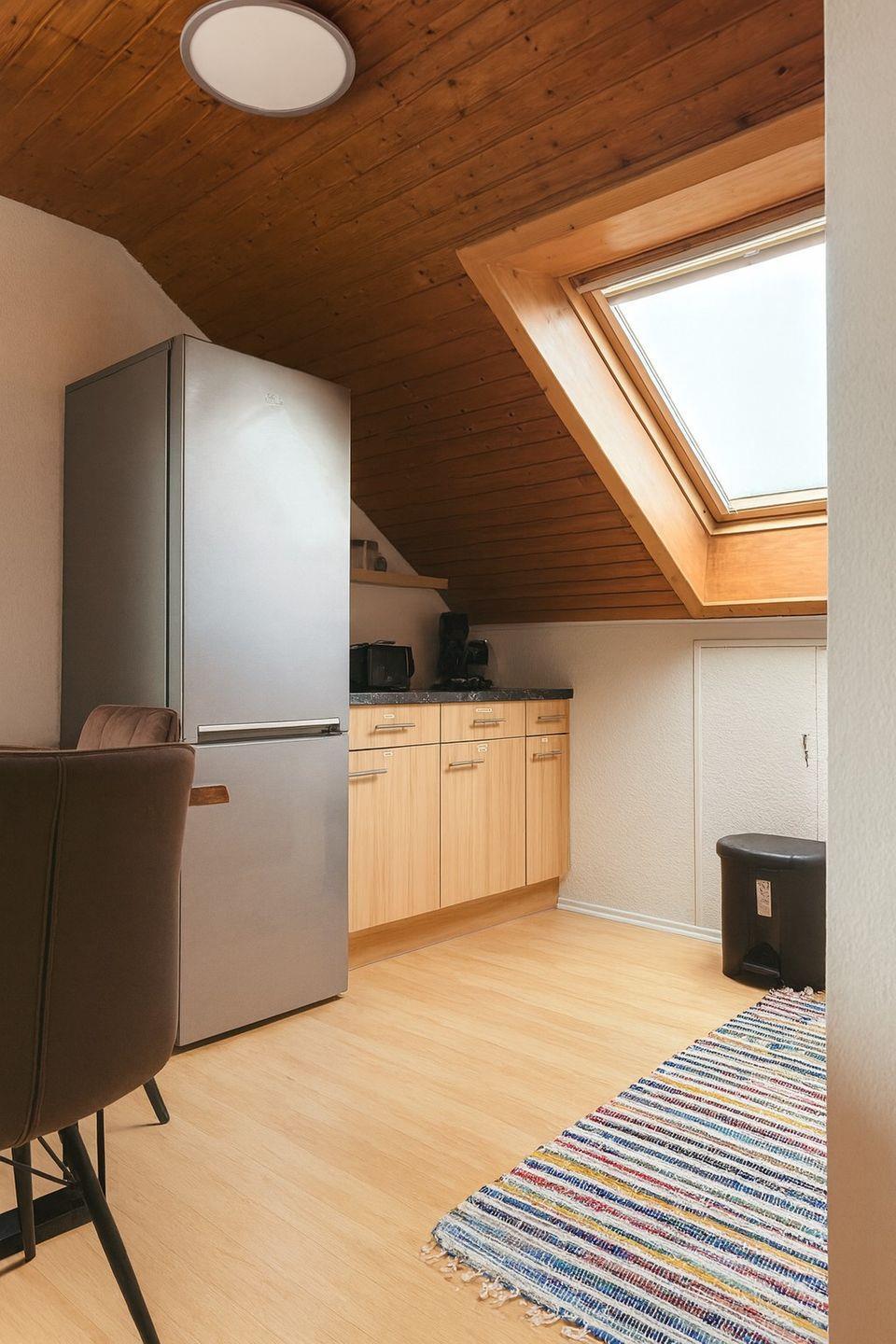 Die moderne Küche ist vollständig ausgestattet mit Kühlschrank, Herd, Backofen, Kaffeemaschine, Toaster und Wasserkocher. Am großen Esstisch unter dem Dachfenster genießen Sie Ihr Frühstück oder Abendessen mit viel Tageslicht und schönem Ausblick.