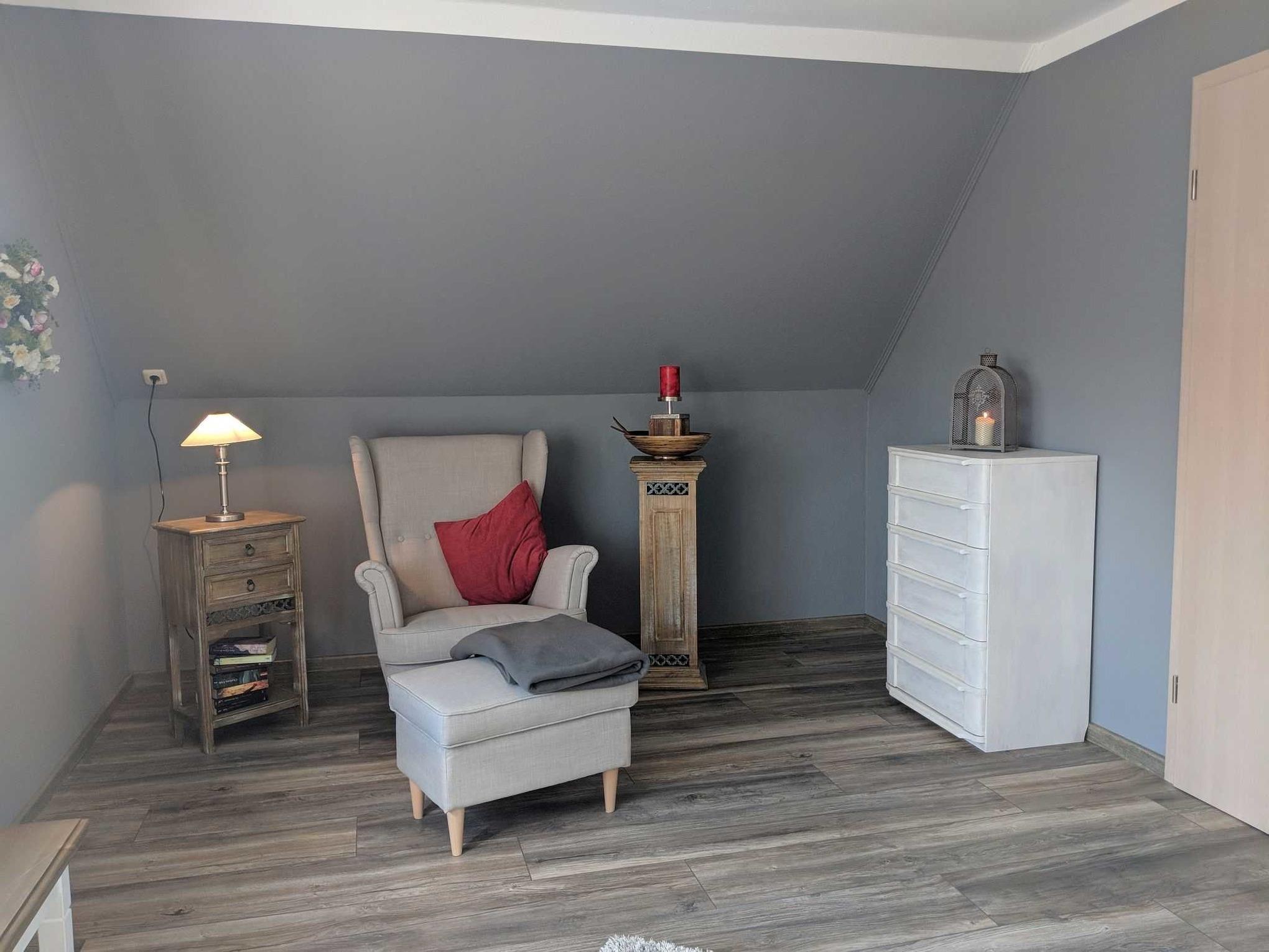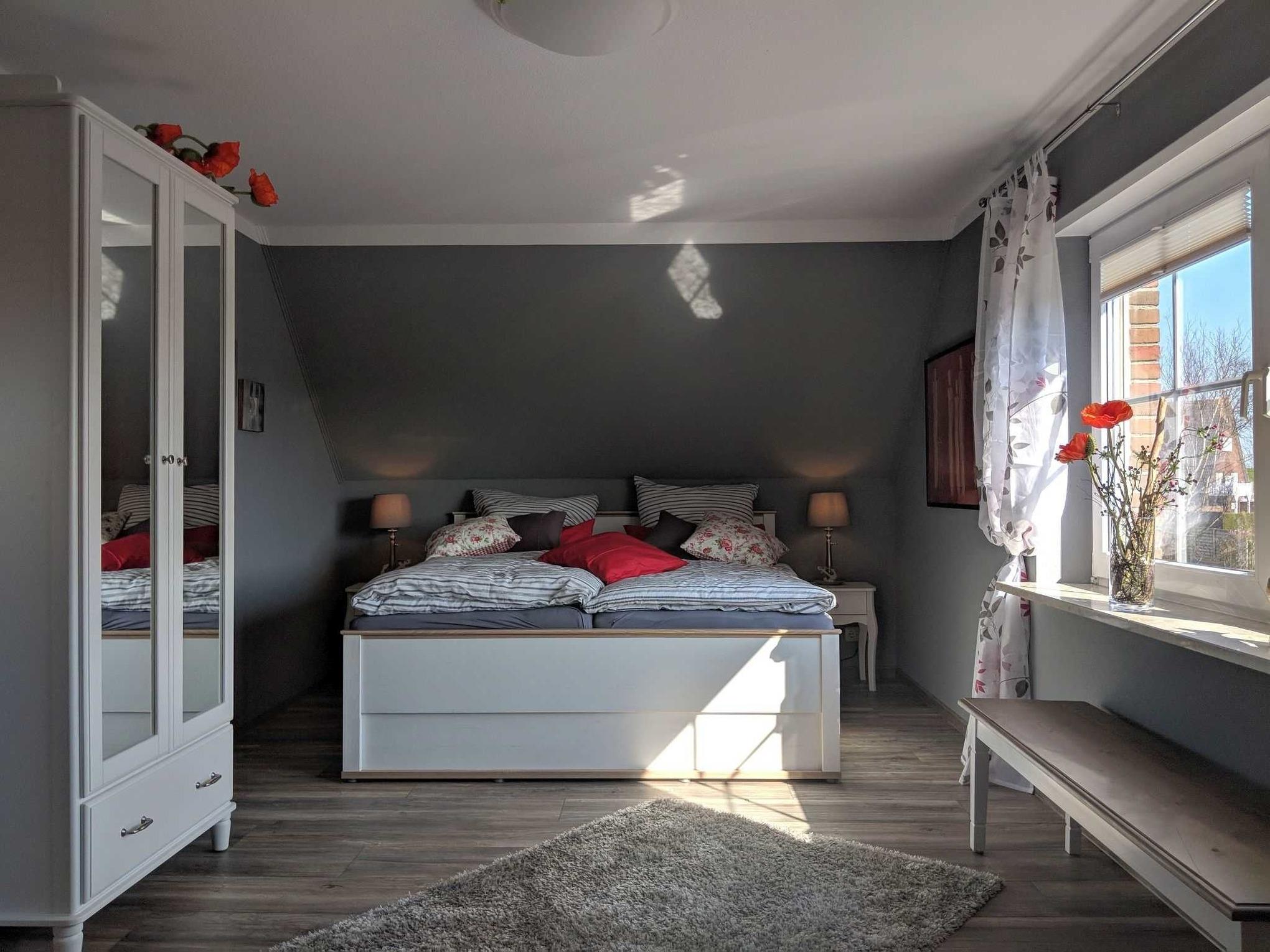Das Ferienhaus bietet bis zu 6 Personen in drei Schlafzimmern Platz. Zwei Schlafzimmer sind mit hochwertigen Doppelbetten ausgestattet. Im dritten Schlafzimmer befindet sich ein Etagenbett in den Maßen 90x200cm. Ein Kinderreisebett sowie ein Hochstuhl steht für die kleinsten Gäste kostenfrei zur Verfügung. Im kernsanierten Badezimmer erwartet Sie eine geräumige Dusche und genügend Ablagemöglichkeiten für Ihre Kosmetikartikel. Ein weiteres WC im Erdgeschoss sowie die bereitgestellte Wachmaschine und ein Wäschetrockner runden Ihren Urlaubskomfort ab. Im gesamten Haus befinden sich elektrische Außenrolladen an den Fenstern.