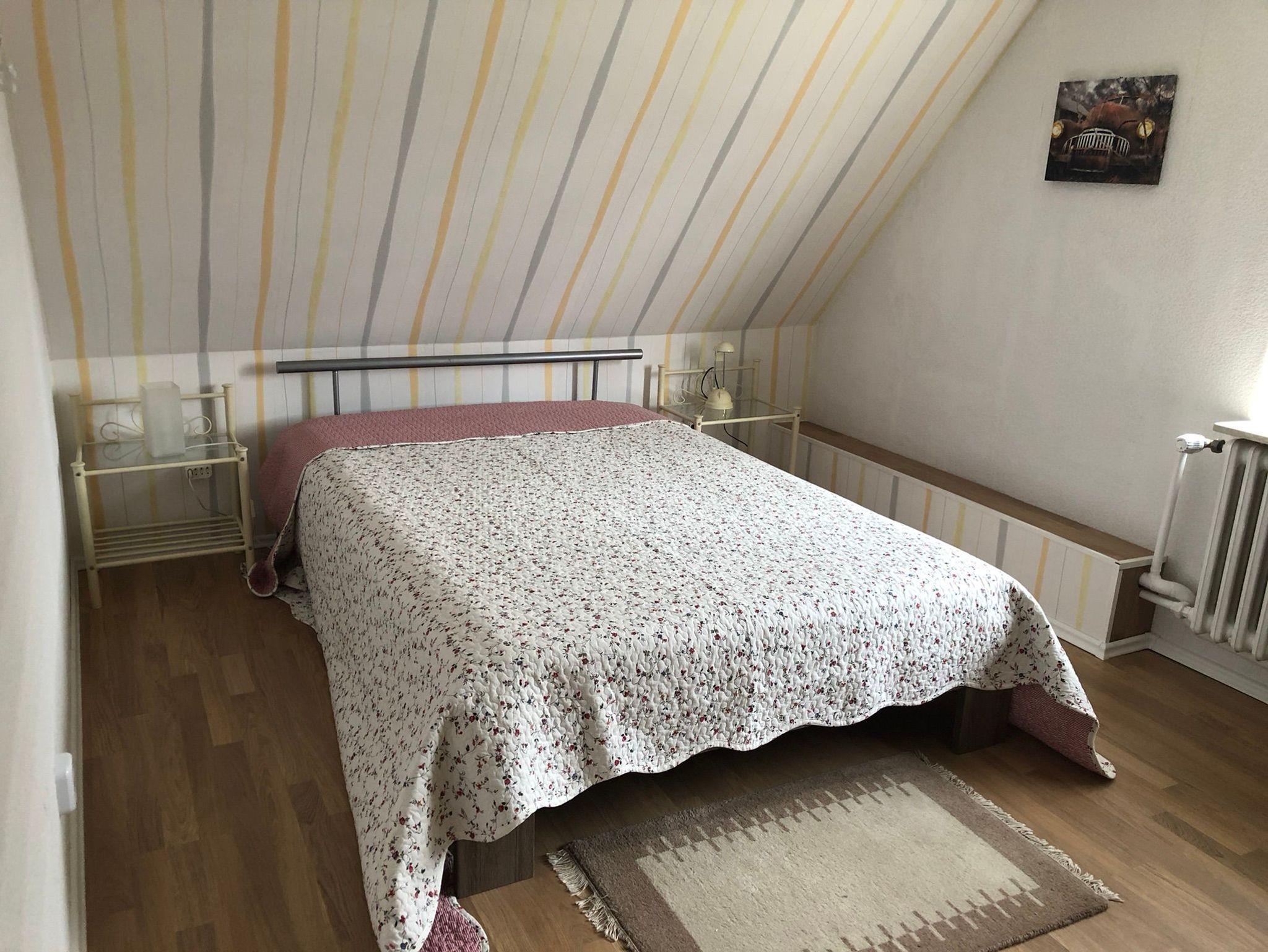 Im hellen Flurbereich führt eine neue Holztreppe zum Obergeschoss. Hier befinden sich ein weiteres Schlafzimmer mit französischem Doppelbett (140 x 200 cm) und einem zusätzlichen Schlafsofa sowie ein kleiner Raum mit Kleiderschrank, Kommode und kleinem Schreibtisch.