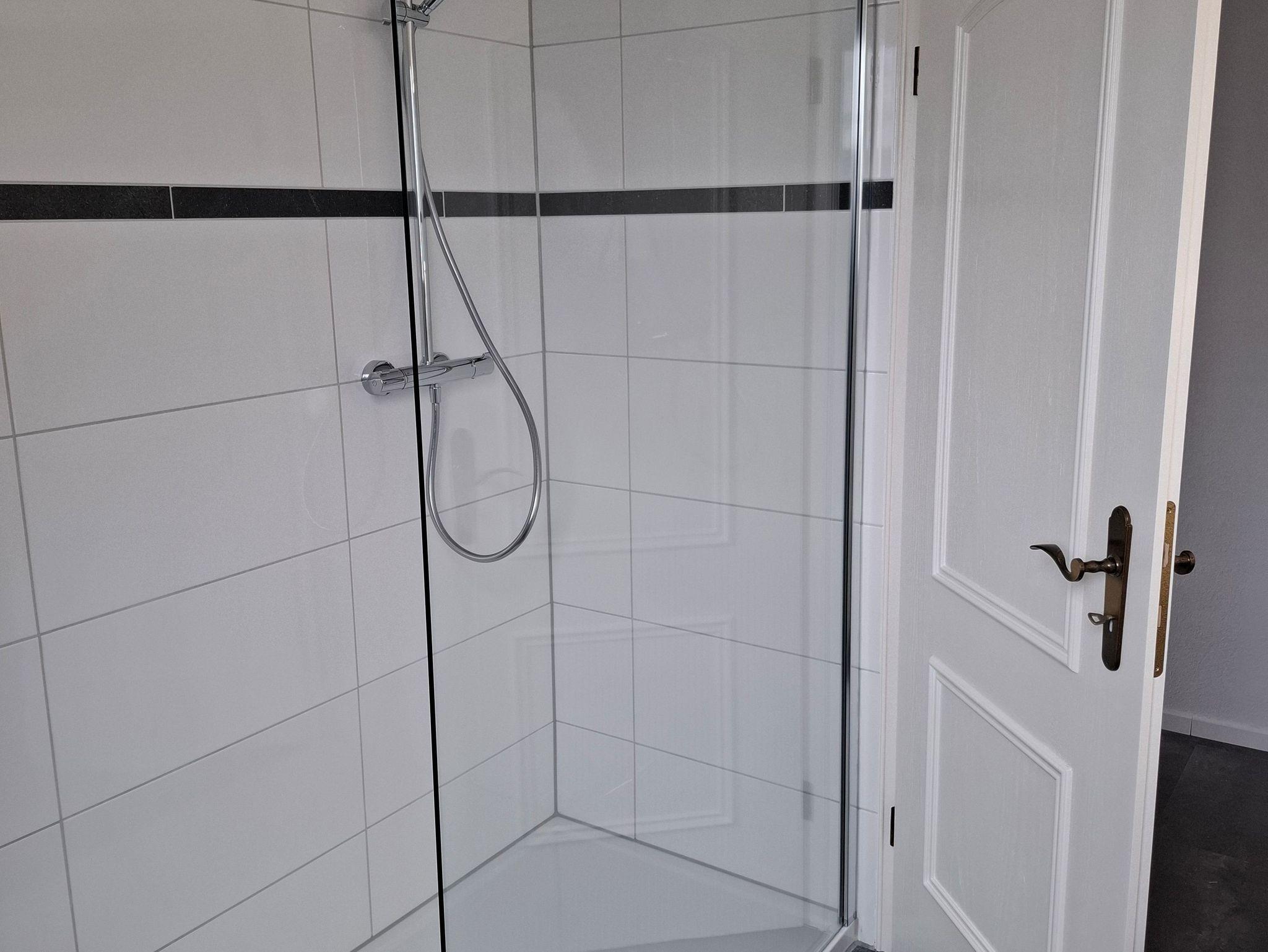 Modernes Bad mit bodentiefer Dusche, Fußbodenheizung, Waschmaschine, beleuchtetem Spiegel, Kosmetikspiegel, Fön