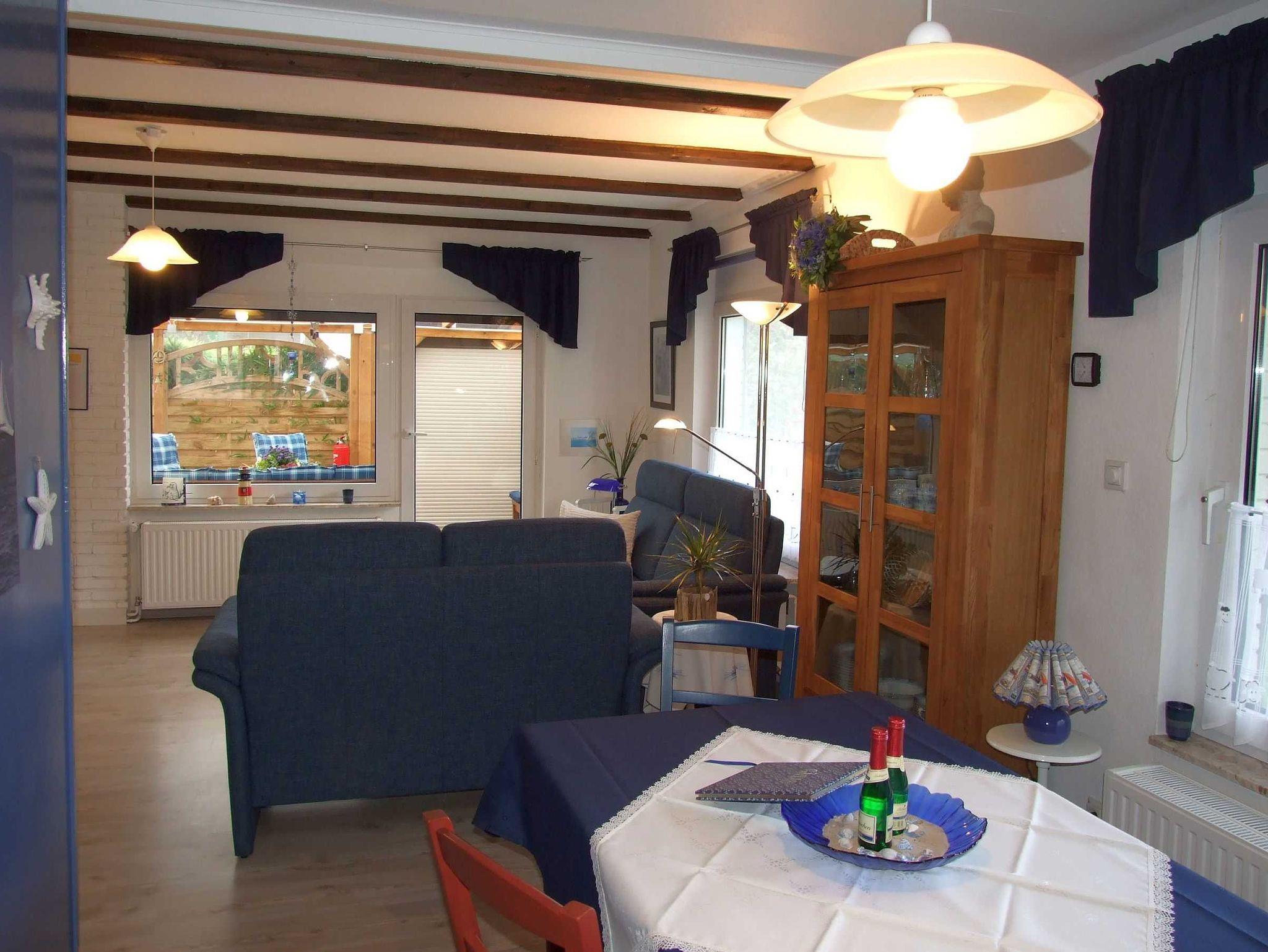 Maritim eingerichtetes Ferienhaus zur Alleinnutzung für bis zu 4 Personen in ruhiger Lage. Eingefriedetes Grundstück mit PKW-Stellplatz. Kombi. Wohn-/Esszimmer und überdachter Terrasse. Schlafzimmer mit Doppelbett und ein Schlafzimmer mit 2 Einzelbetten. Kompl. eingerichtete Küche. Alles ist ebenerdig und mit einem großen, ruhigen Garten.