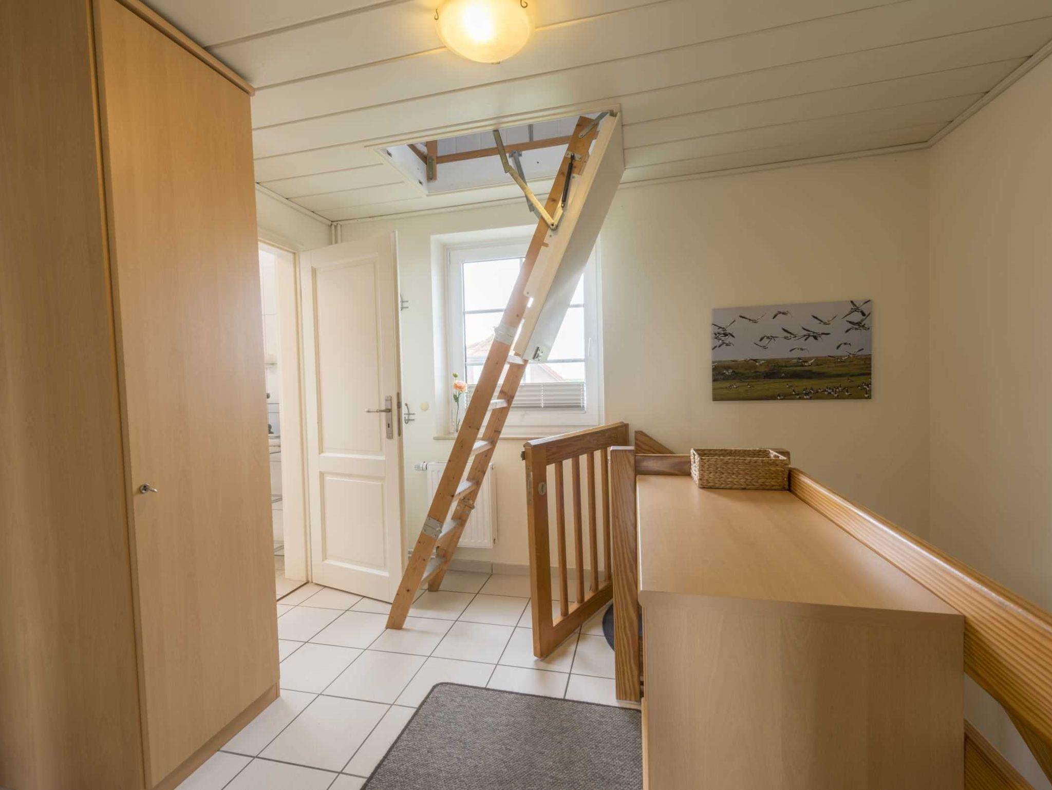 Obergeschoss mit Balkon für 2-5 Personen inkl. Gartenmöbel, Liegewiese, Strandkorb und Sandkiste. Wohn-/Schlafraum, Schlafraum, Küchenzeile, Dusche/WC. Sat-TV, Telefon, Kinderbett und Kinderhochstuhl.