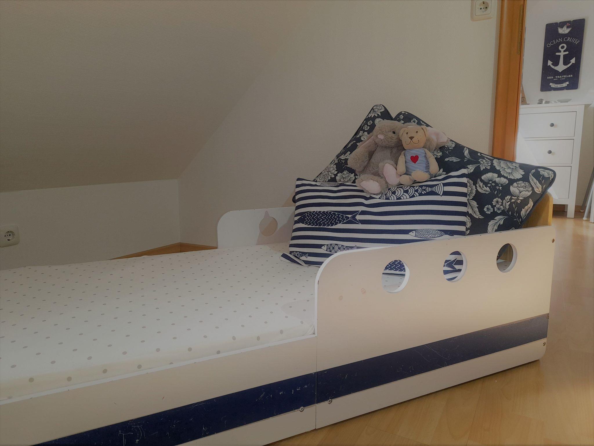 Das im Obergeschoss befindliche geräumige Schlafzimmer ist mit einem großen Doppelbett, hochwertigen Matratzen (Emma), großem Kleiderschrank und einem Kleinkinderbett (Boot) ausgestattet. An jeder Bettseite befindet sich ein Nachttisch mit Beleuchtung. Darüber hinaus gibt es bei Bedarf ein Babyreisebett (0+) zur kostenfreien Nutzung. Das Doppelbett ist bei Anreise bezogen, auf Wunsch auch gerne das Kleinkinderbett.