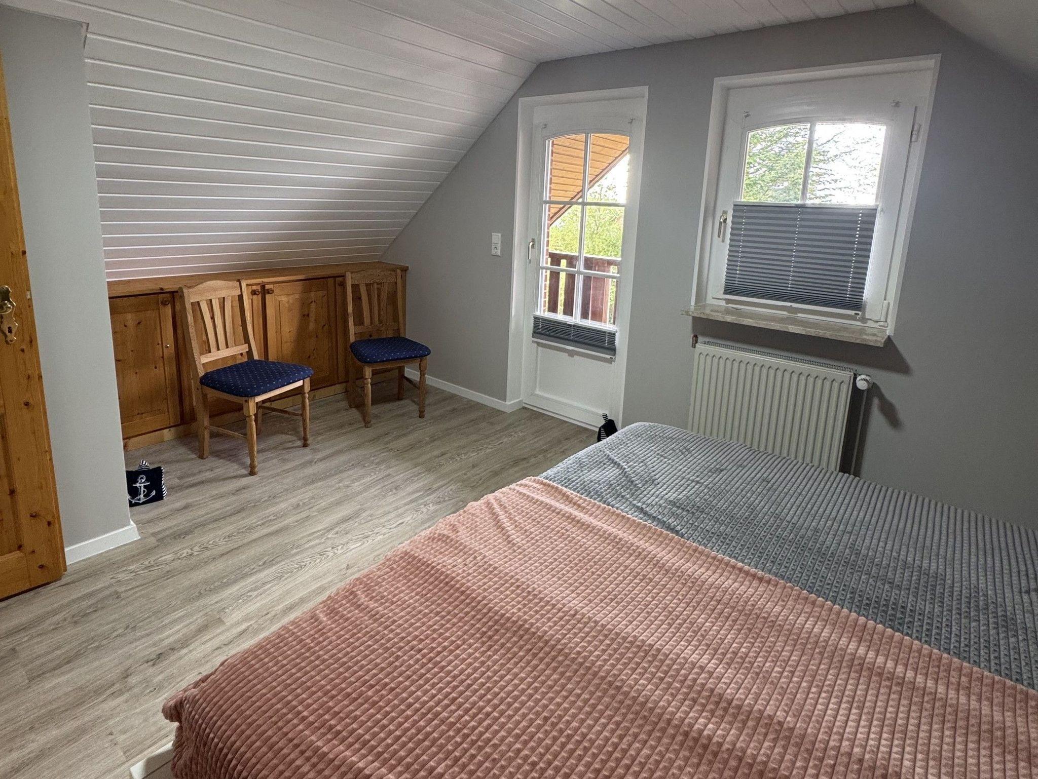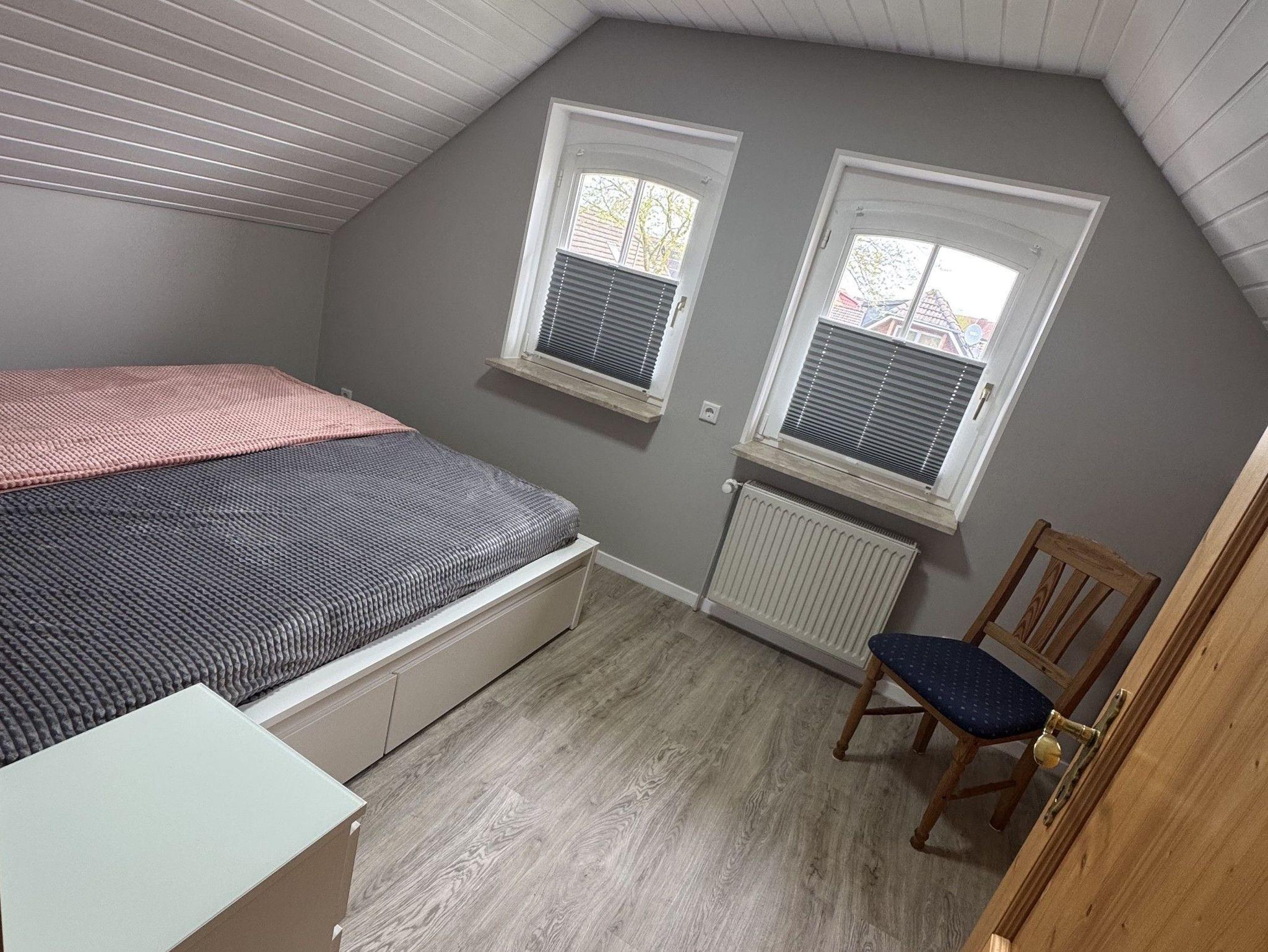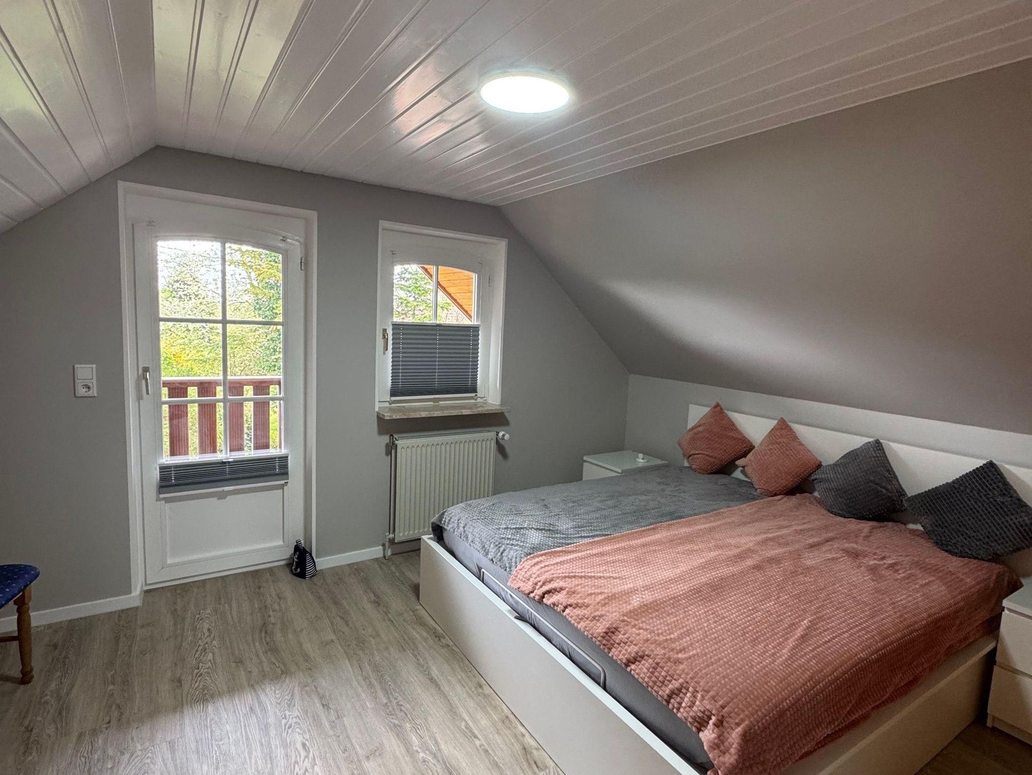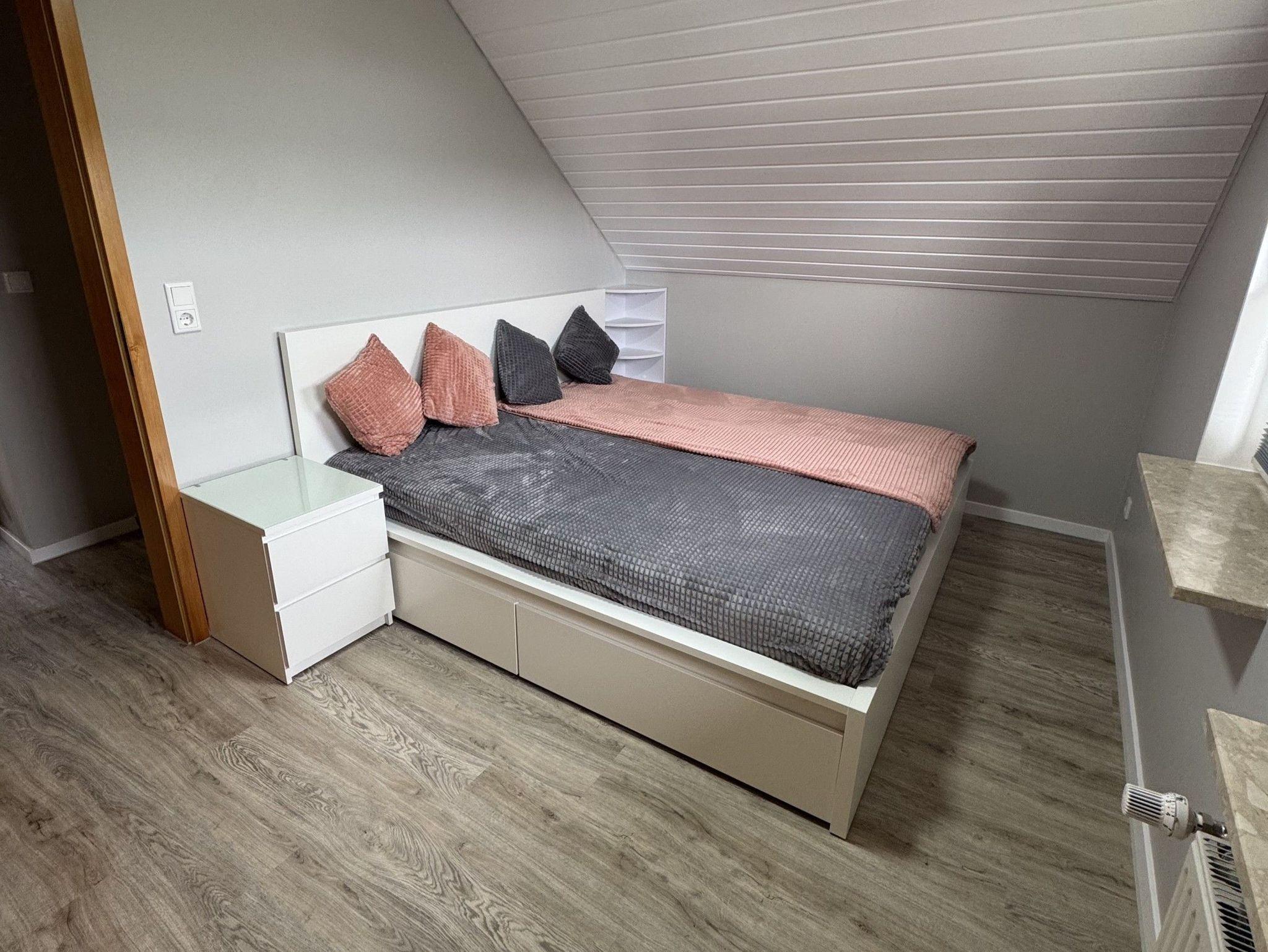 Im Obergeschoss wartet ein großzügiges Schlafzimmer mit massiven Einbauschrank, 1,80 m Doppelbett und Zugang zum Balkon auf Sie. Hier können Sie Ihren ersten Morgenkaffee mit Blick in den Garten genießen. Gegenüber befindet sich ein weiteres Schlafzimmer mit ebenfalls großem Einbauschrank und 1,80 m Doppelbett.