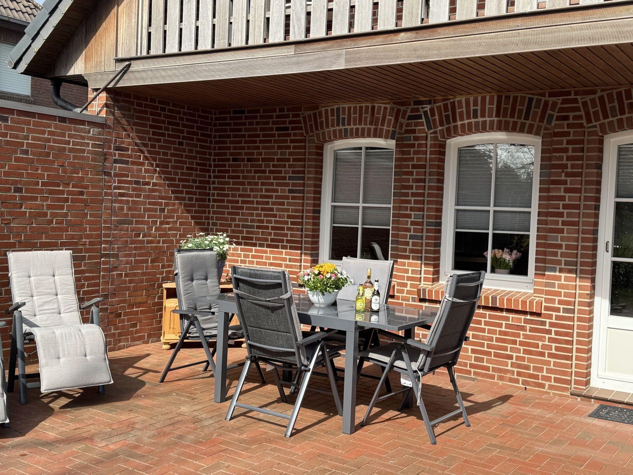 Vom Wohnzimmer aus gelangen Sie auf sie große, windgeschützte Terrasse perfekt für laue Sommerabende.