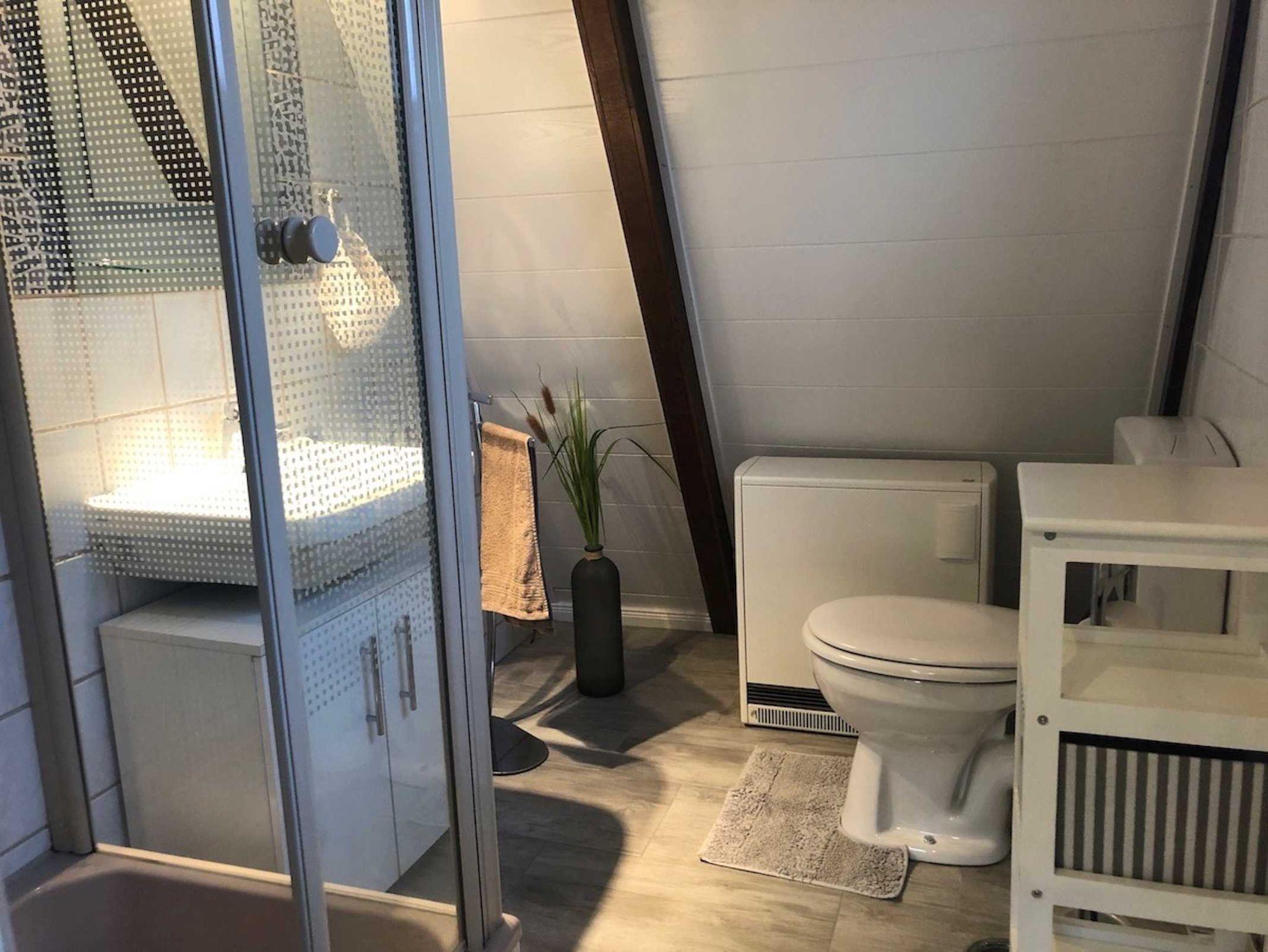 Bad mit Dusche, Waschbecken, WC und Haartrockner. Separater kleiner Abstellraum. Wäscheständer vorhanden.