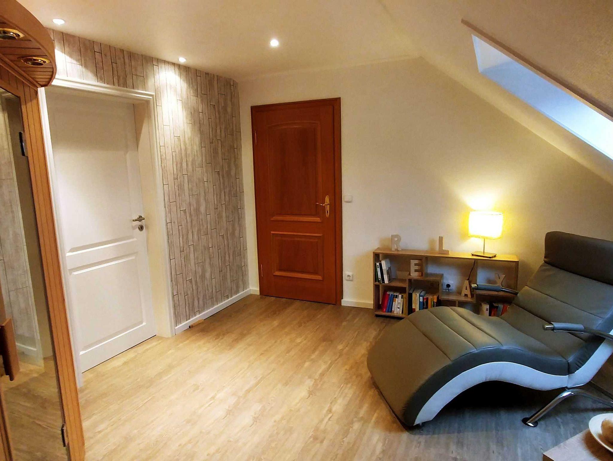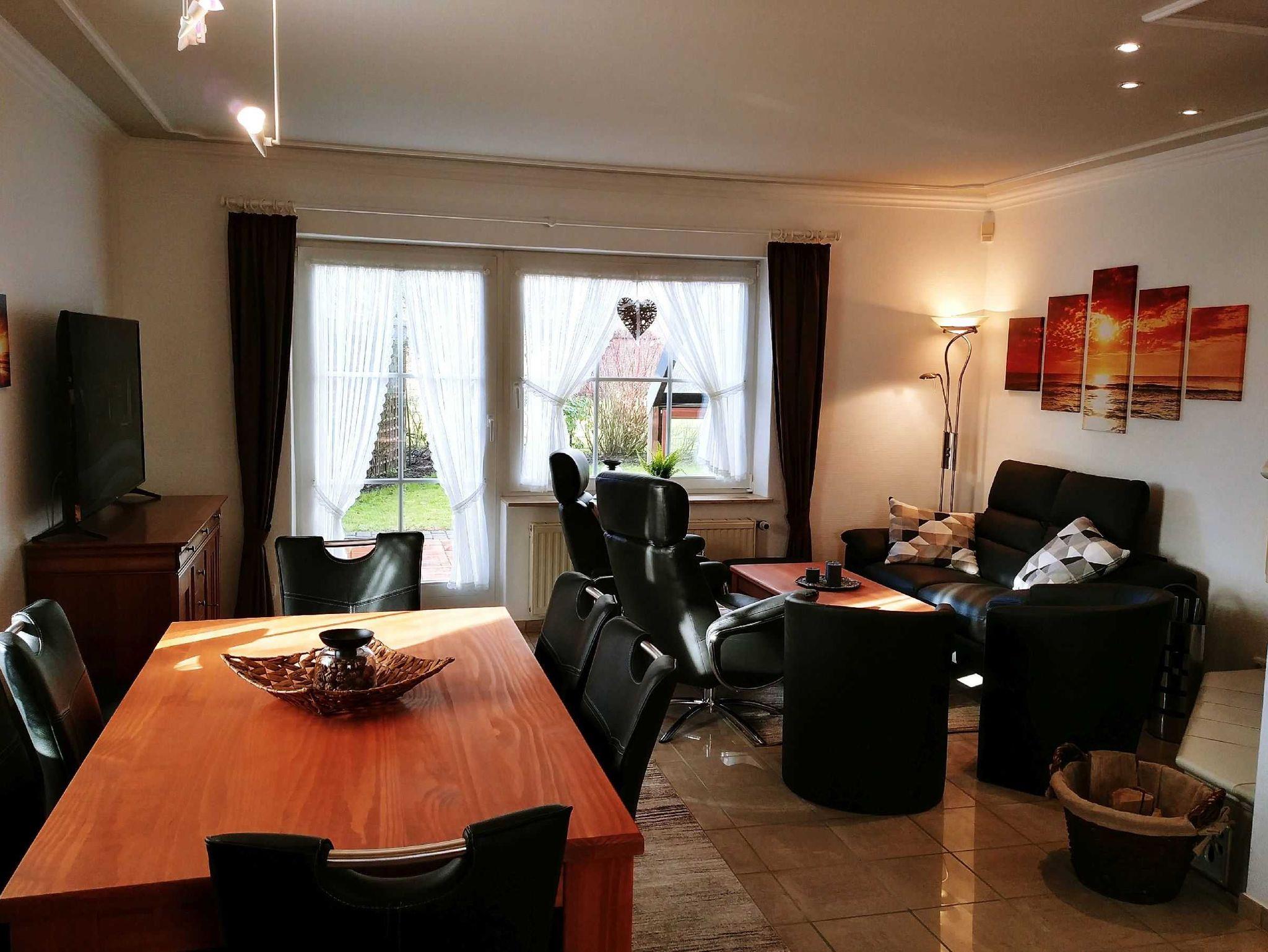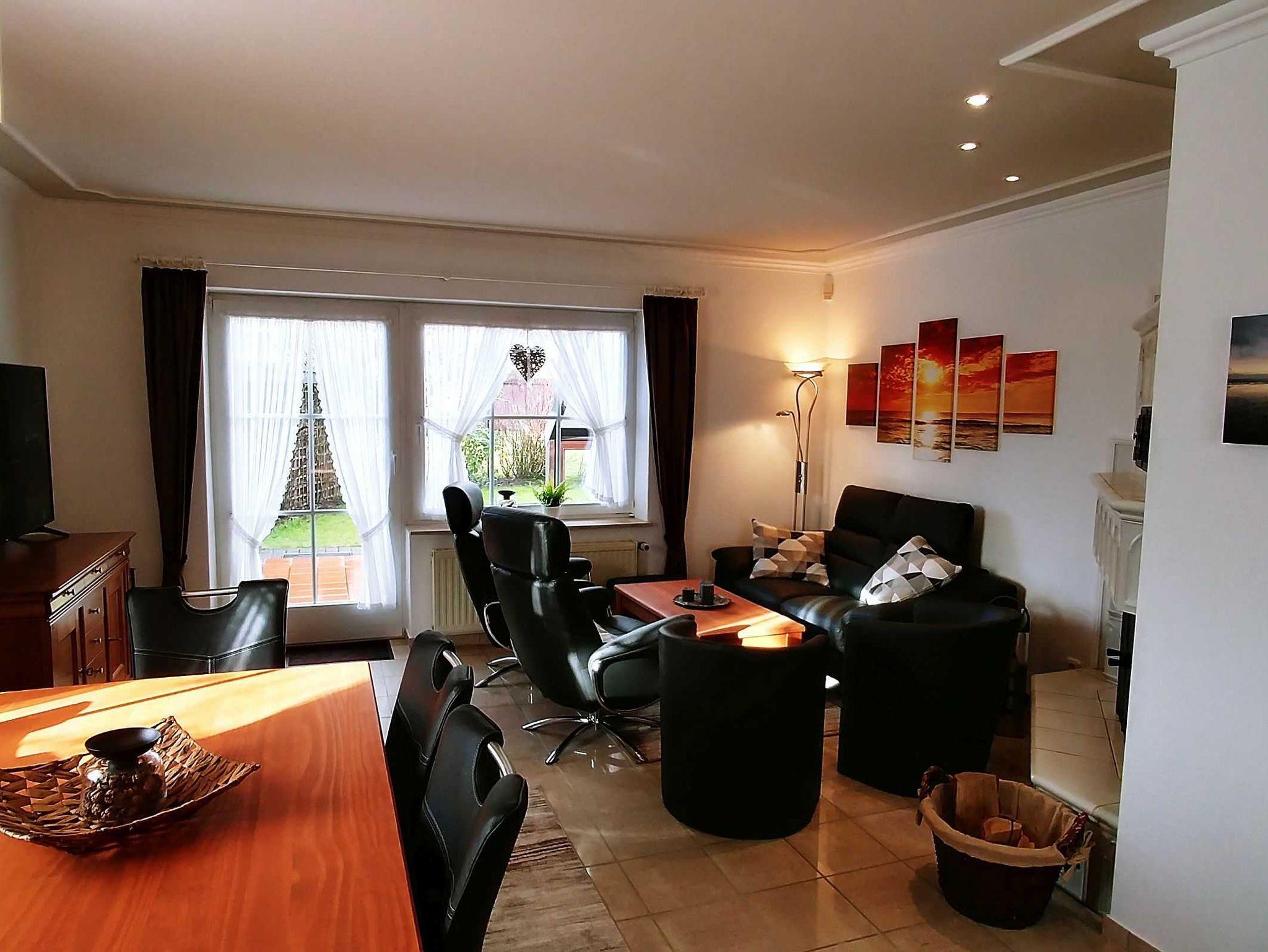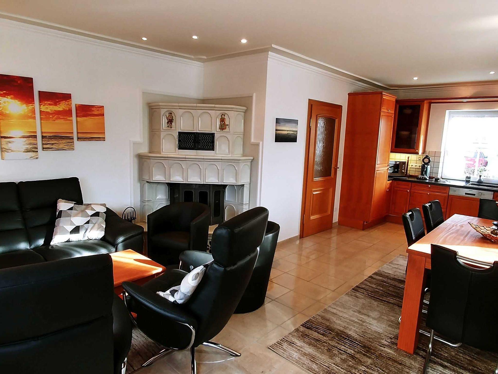 Der Wohnbereich lädt durch Leder-Relax-Sessel und eine Relax-Ledercouch zum Verweilen vor dem Kachel-Kamin ein. Ein 55-Zoll-Flachbildschirm ist ebenso wie eine neue moderne Kompaktanlage vorhanden. Vom Wohnzimmer aus gelangen Sie auf die Terrasse und in den Garten.