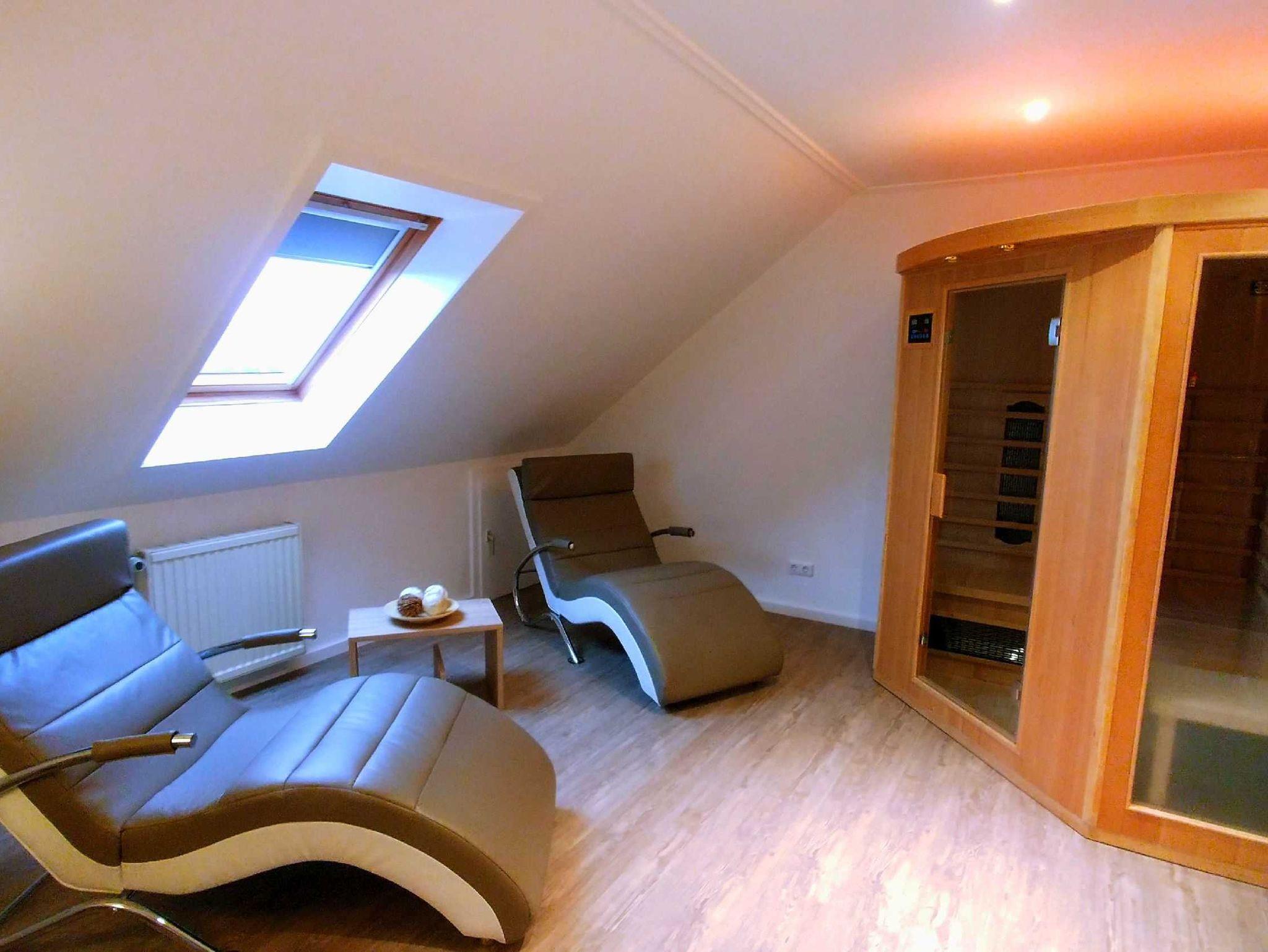 Die neue hochmoderne Biosauna verfügt als Vollspektrum über eine Infrarot-Wärmekabine mit Lichttherapie und Sternenhimmel über Platz bis 4 Personen und sorgt in besonderer Weise für Ihr Wohlbefinden. Bei entspannenden Klängen können Sie die wohltuende und gesundheitsfördernde behagliche Wärme genießen und anschließend auf den ebenfalls neuen hochwertigen Relaxliegen entspannen. Aus einer kleinen Bücherauswahl finden Sie den Lesestoff hierfür. Das Badezimmer mit Dusche und WC befindet sich gleich neben dem Wellness-Bereich.