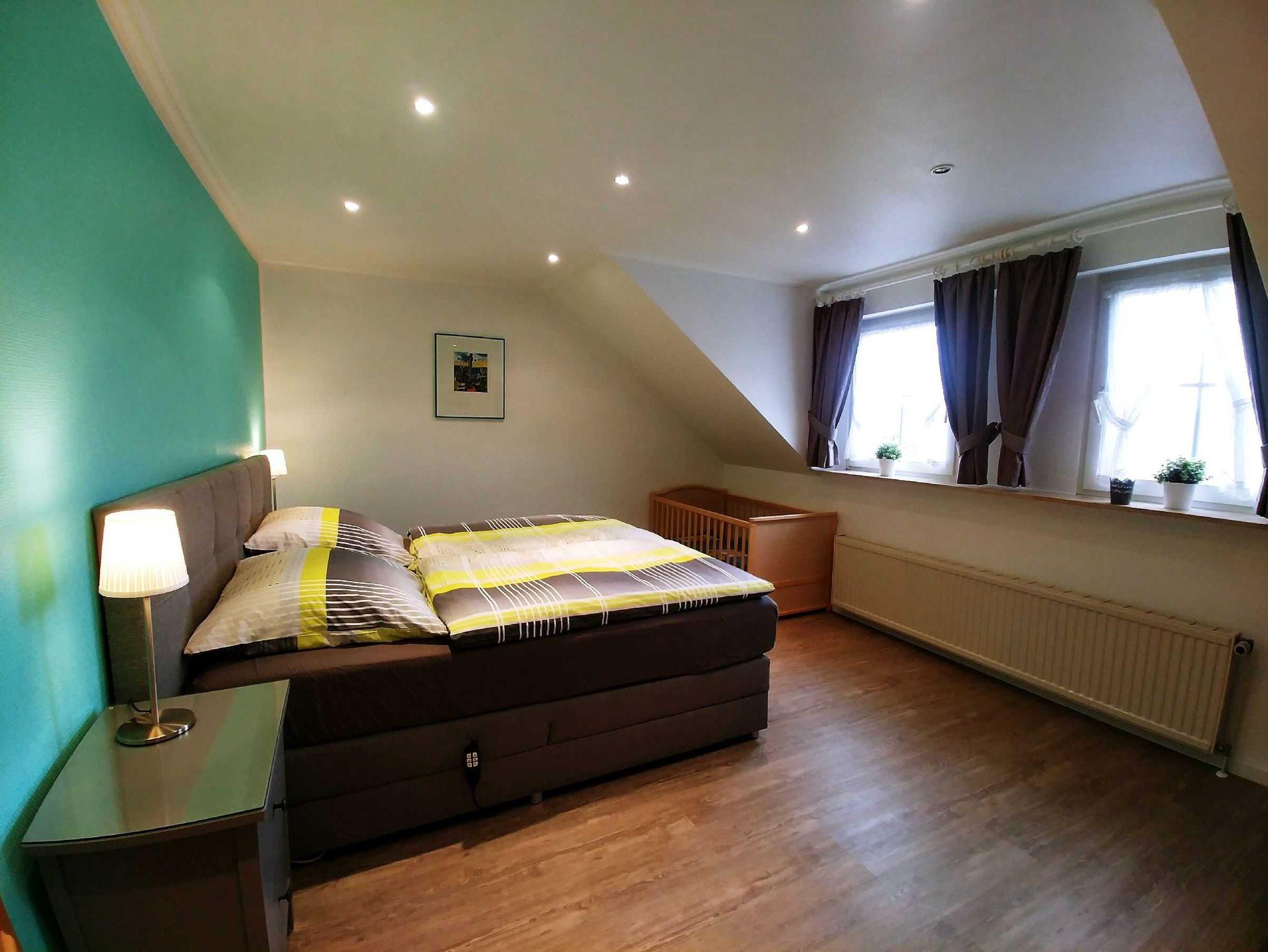 Die breite nicht zu steile Treppe führt in das Obergeschoss. Die Treppe können Sie bei Bedarf mit einem Treppengitter sichern. Von der oberen Diele gelangen Sie in das zweite große Schlafzimmer, welches sehr modern mit einem neuem elektrisch verstellbaren großen BOX-Springbett eingerichtet ist. Ein Babybettchen findet hier auch seinen Platz.