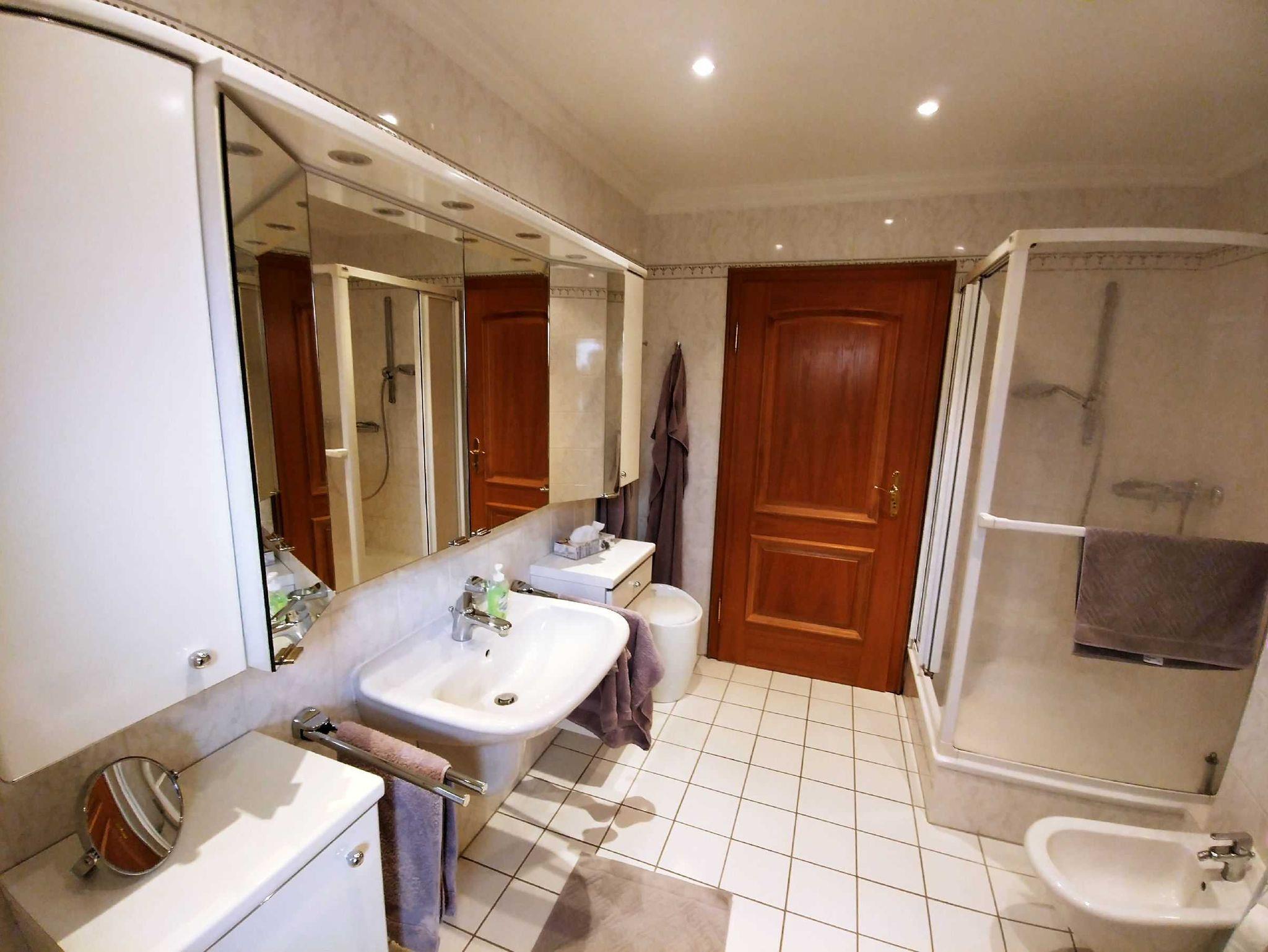 Ein geräumiges Schlafzimmer in Massivholz Mahagoni Ausführung und das Doppelbett mit erhöhter Matratze beschert Ihnen im EG einen lauschigen Schlafplatz. Daneben befindet sich das sehr geräumige Badezimmer mit großem Spiegelschrank, Dusche, WC und Bidet. Ein Sitzhocker und ein Föhn sind ebenfalls vorhanden.