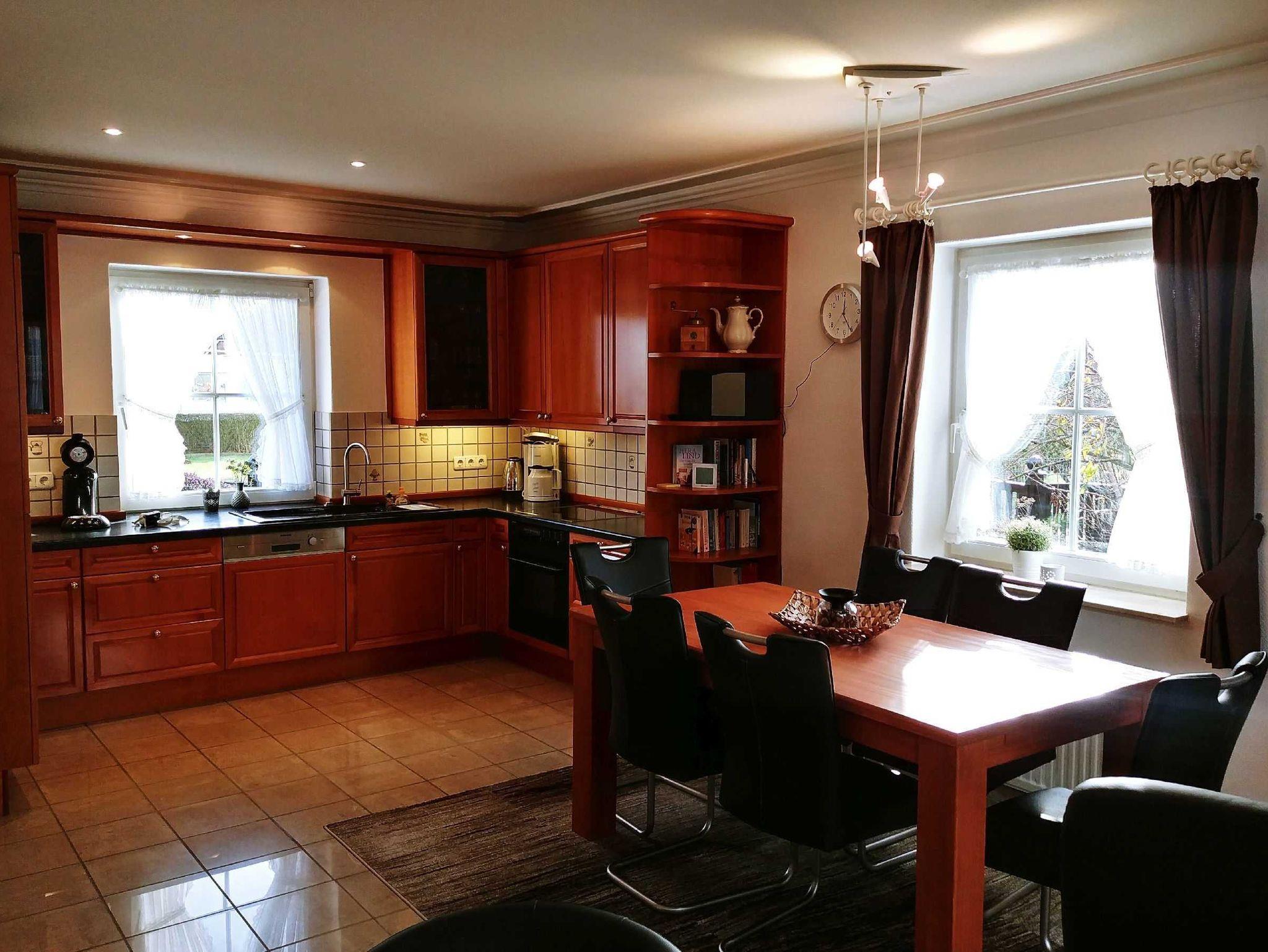Sie betreten das Haus durch die große Diele mit Einbauschrank und weiterer Garderobe. Von hier gelangen Sie in den Wohn-Essbereich mit hochwertiger moderner Einbauküche mit allen zeitgemäßen Elektrogeräten, Geschirr und allem was in die Küche gehört. Daran schließt sich der Essbereich mit Platz bis zu 6 Personen mit neuen Leder-Freischwinger-Stühlen und großem Esstisch an.