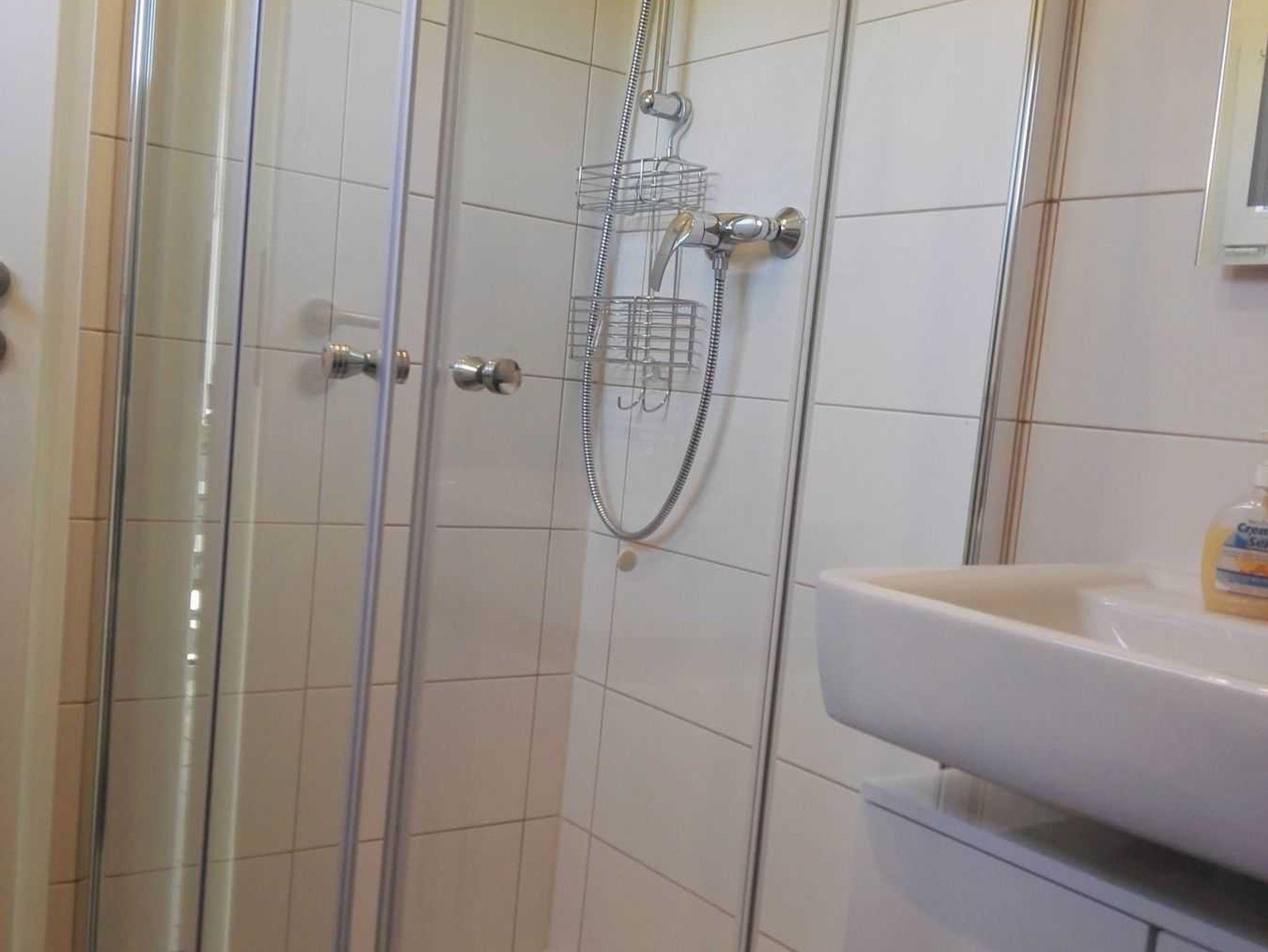 Neues Bad mit Dusche, Waschbecken ,WC und Haartrockner. Es gibt einen separaten kleinen Waschraum sowie einen Wäscheständer.