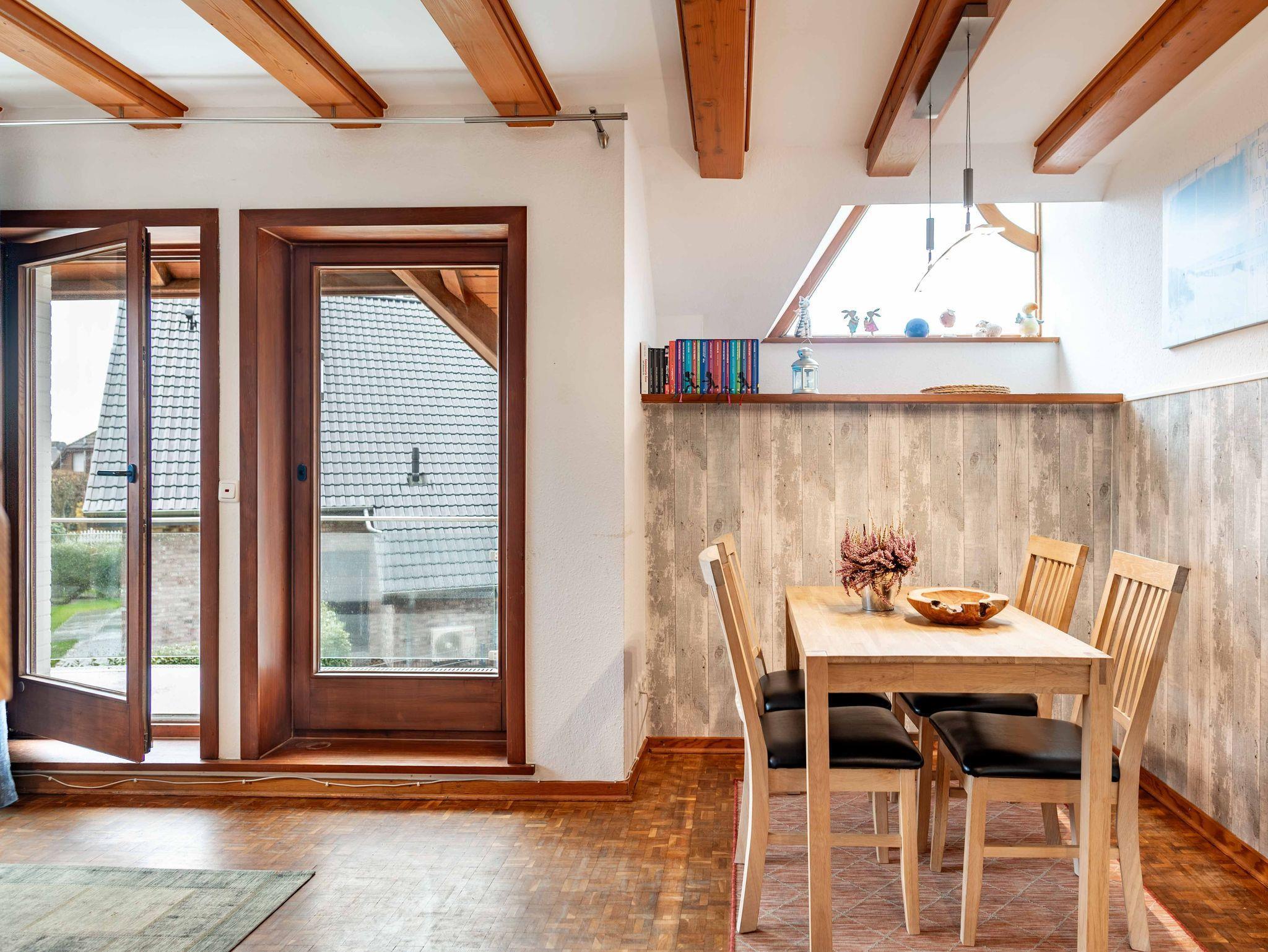 Die Ferienwohnung Achtern Diek ist ein zweistöckiges Apartement im Ober- und Dachgeschoss eines attraktiven Hauses mit maritimen Elementen.
