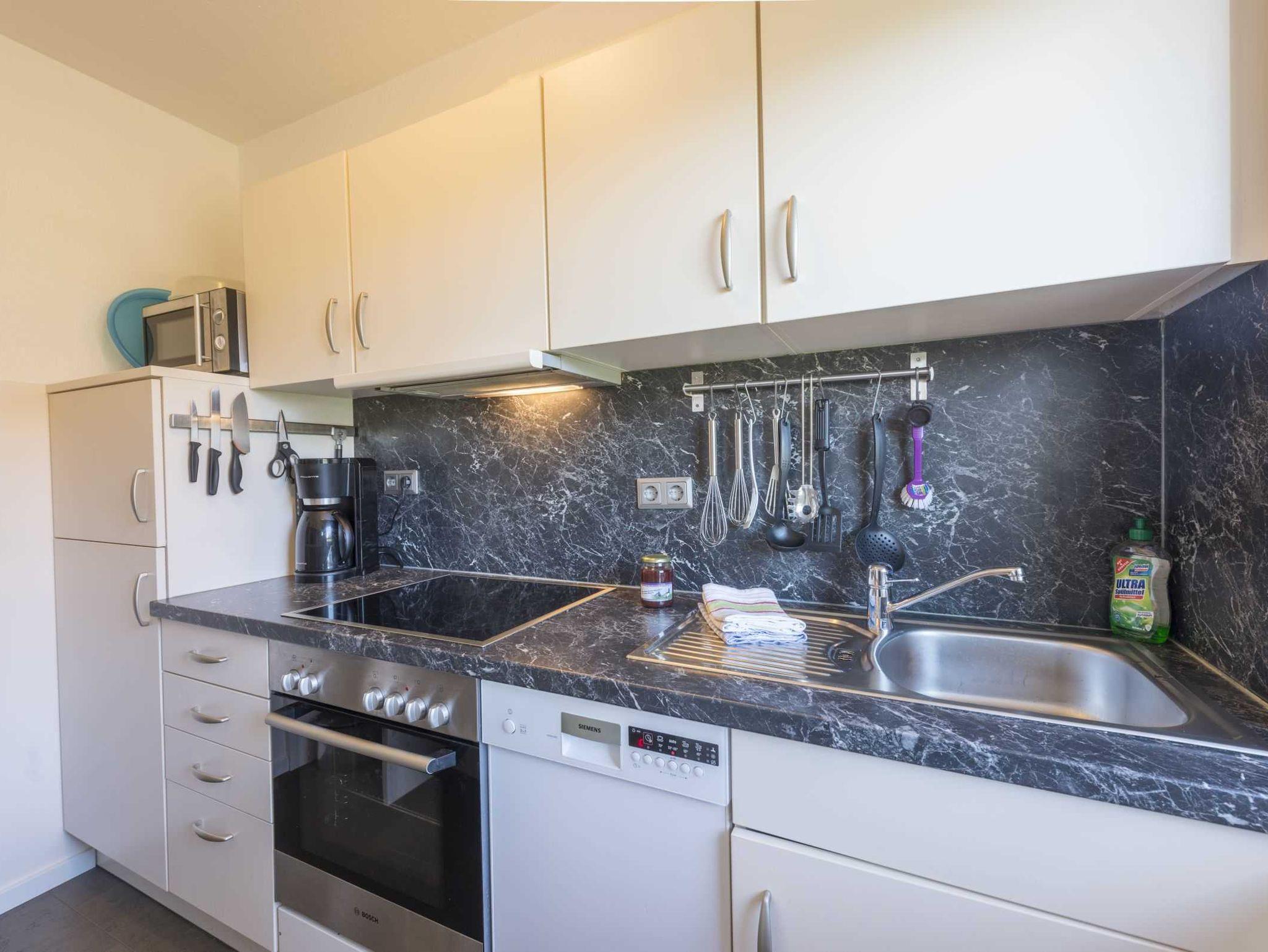 • kleine Küche mit Mikrowelle, E-Herd (4 Platten), Backofen, Gefrierfach und Geschirrspülmaschine