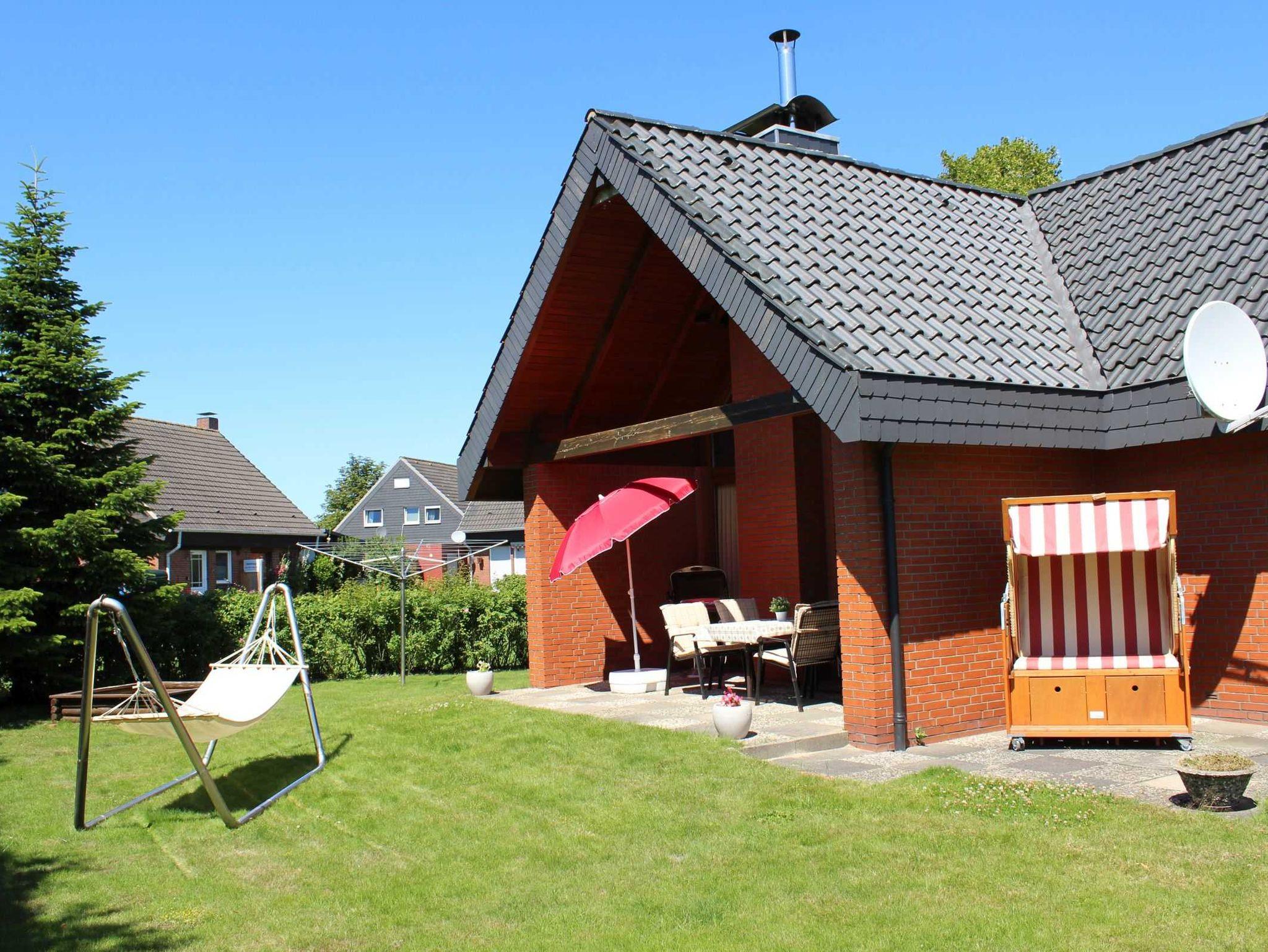 • überdachte Terrasse, Gartenmöbel, Strandkorb, Hängematte und Spielplatz