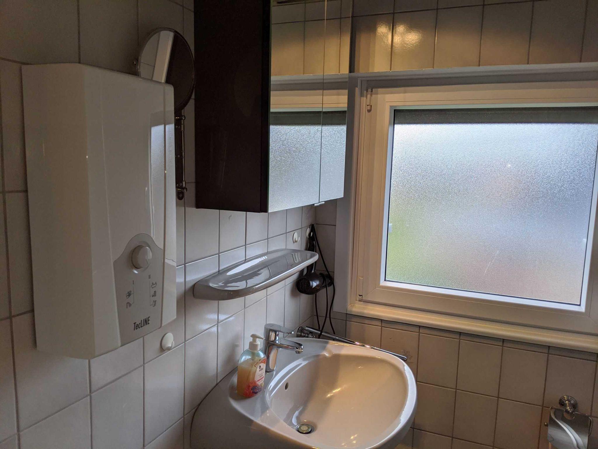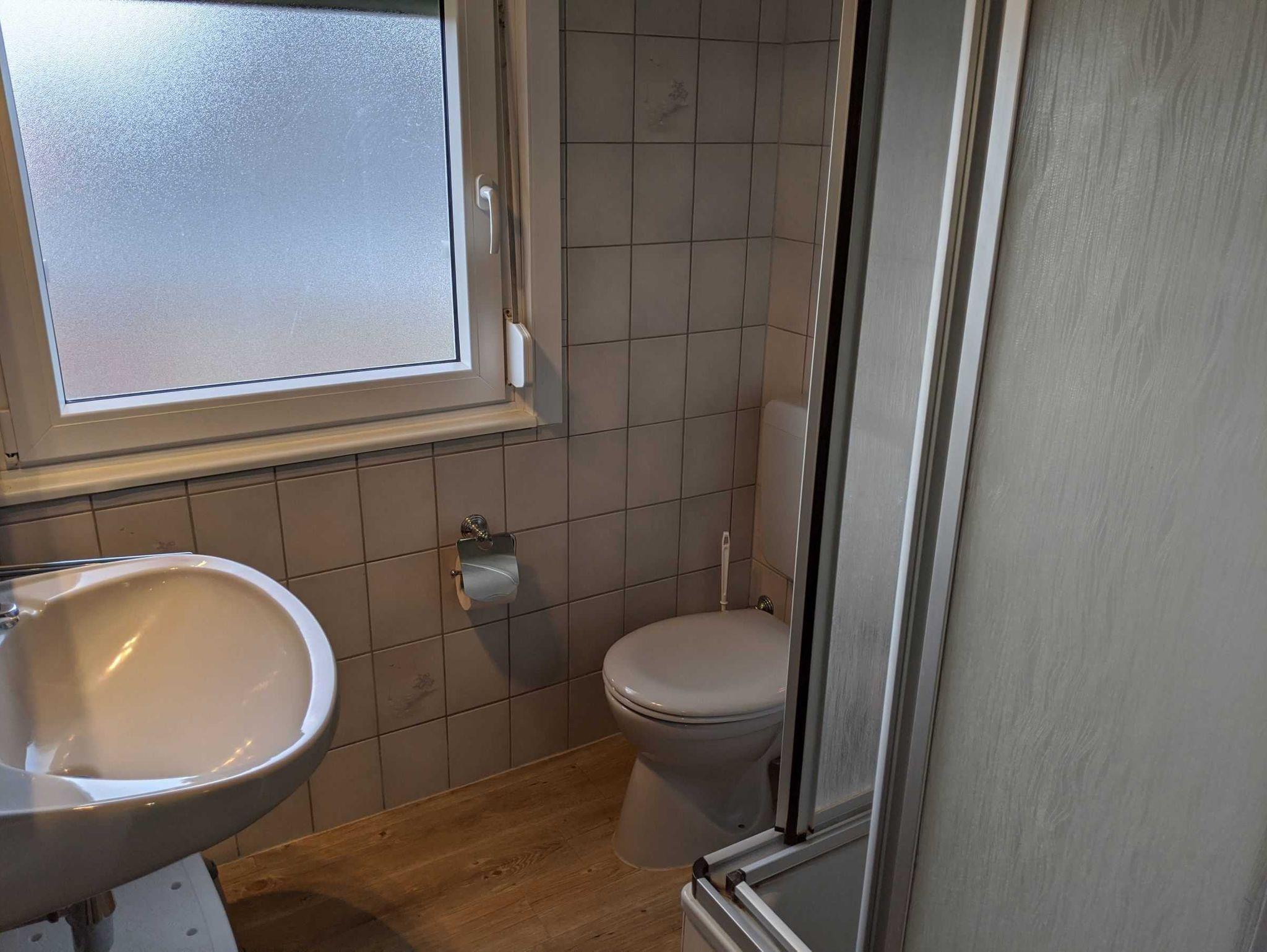 Im Obergeschoss befindet sich ein Tageslichtbad mit Dusche und WC. Wir stellen Ihnen Zahnputzbecher und einen Fön zur Verfügung. Im Erdgeschoss ist außerdem ein Gäste-WC vorhanden.