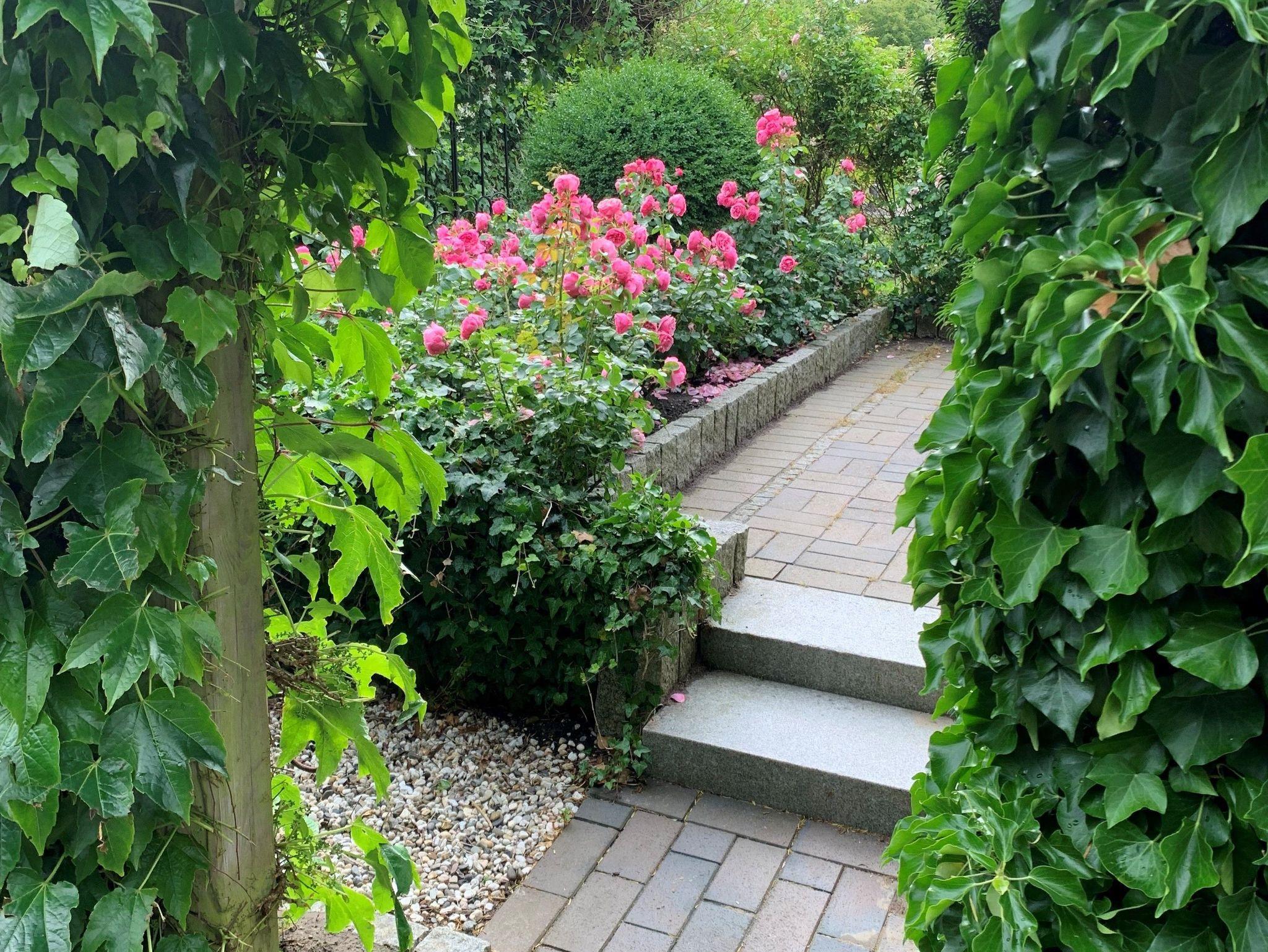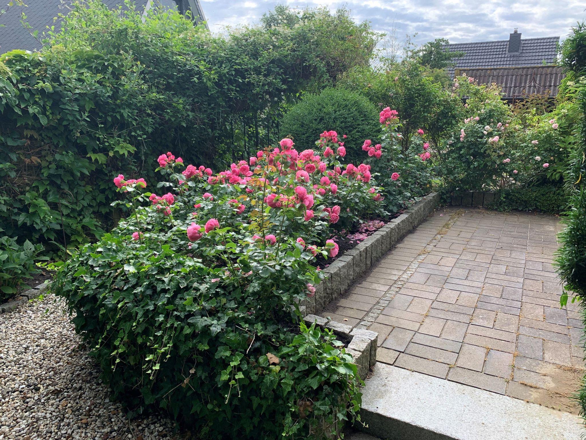 Auf der einladenden Terrasse im Rosengarten lädt eine Sitzgarnitur zum Verweilen ein. Zum Haus gehört eine Auffahrt mit Parkmöglichkeit und ein Geräteschuppen.