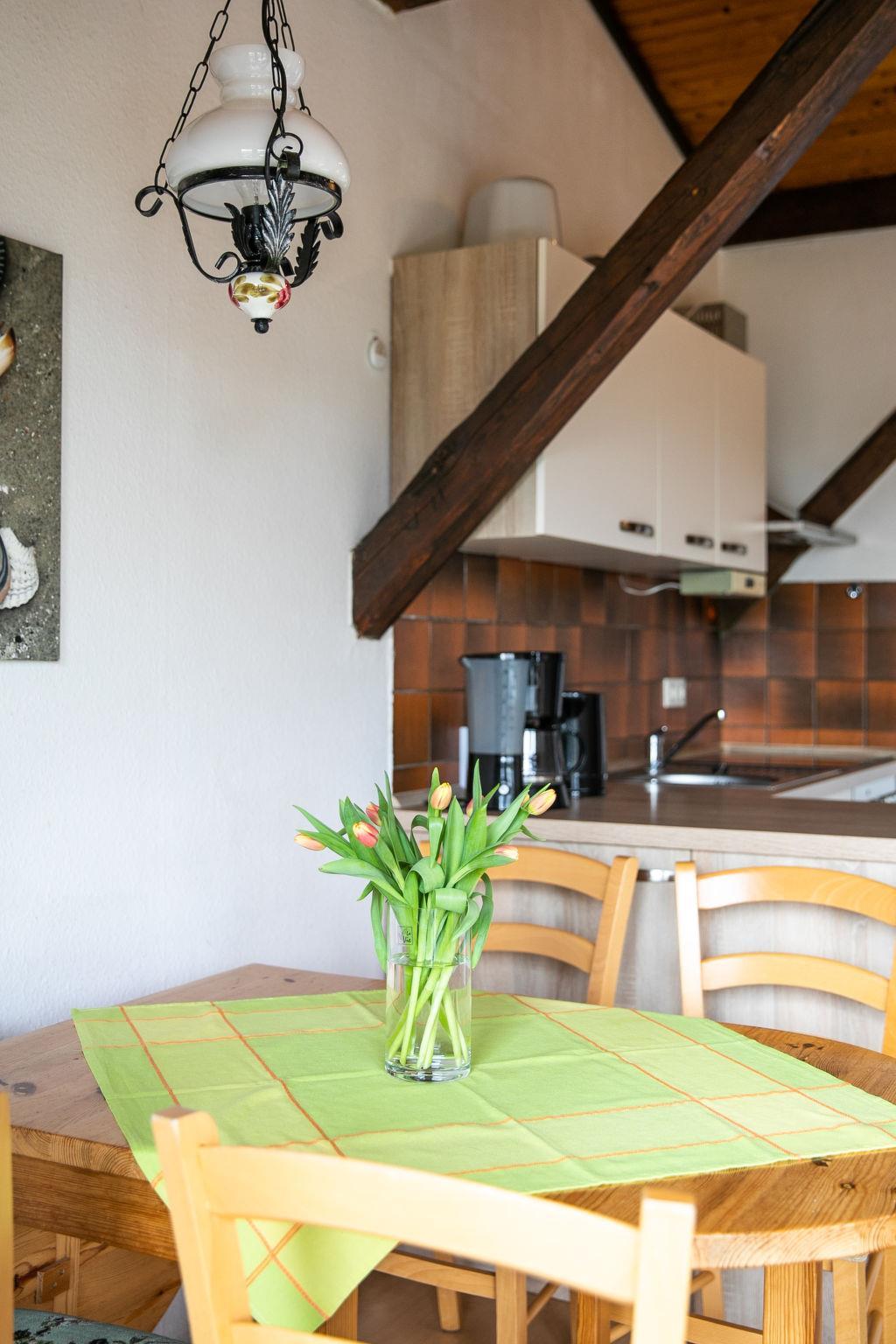 3-room apartment 40 m2 on 1st floor. Practical furnishings: living/dining room with satellite TV (flat screen), radio and DVD. Exit to the balcony. 1 room with 1 french bed (140 cm, length 200 cm). 1 room with 2 beds. Open kitchen (oven, 4 ceramic glass hob hotplates, toaster, kettle, electric coffee machine). Shower/WC. Balcony furniture. Panoramic view. Facilities: children's high chair. Internet (WiFi, free). Parking (1 car). Please note: non-smokers only. Smoke alarm, fire extinguisher. Access via external staircase and balcony. Bookings accepted for holiday purposes only.
