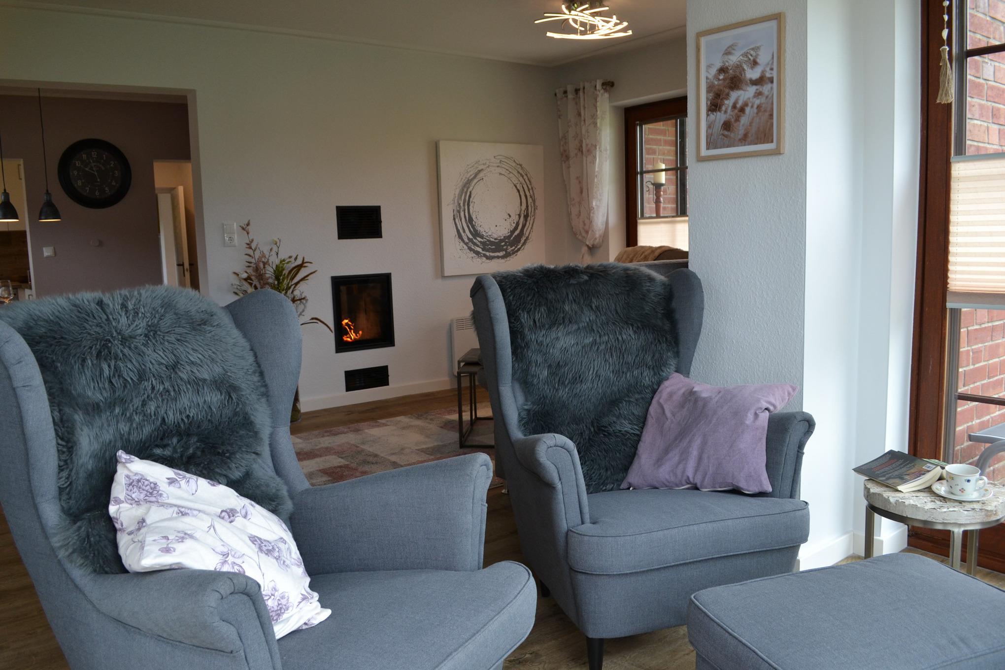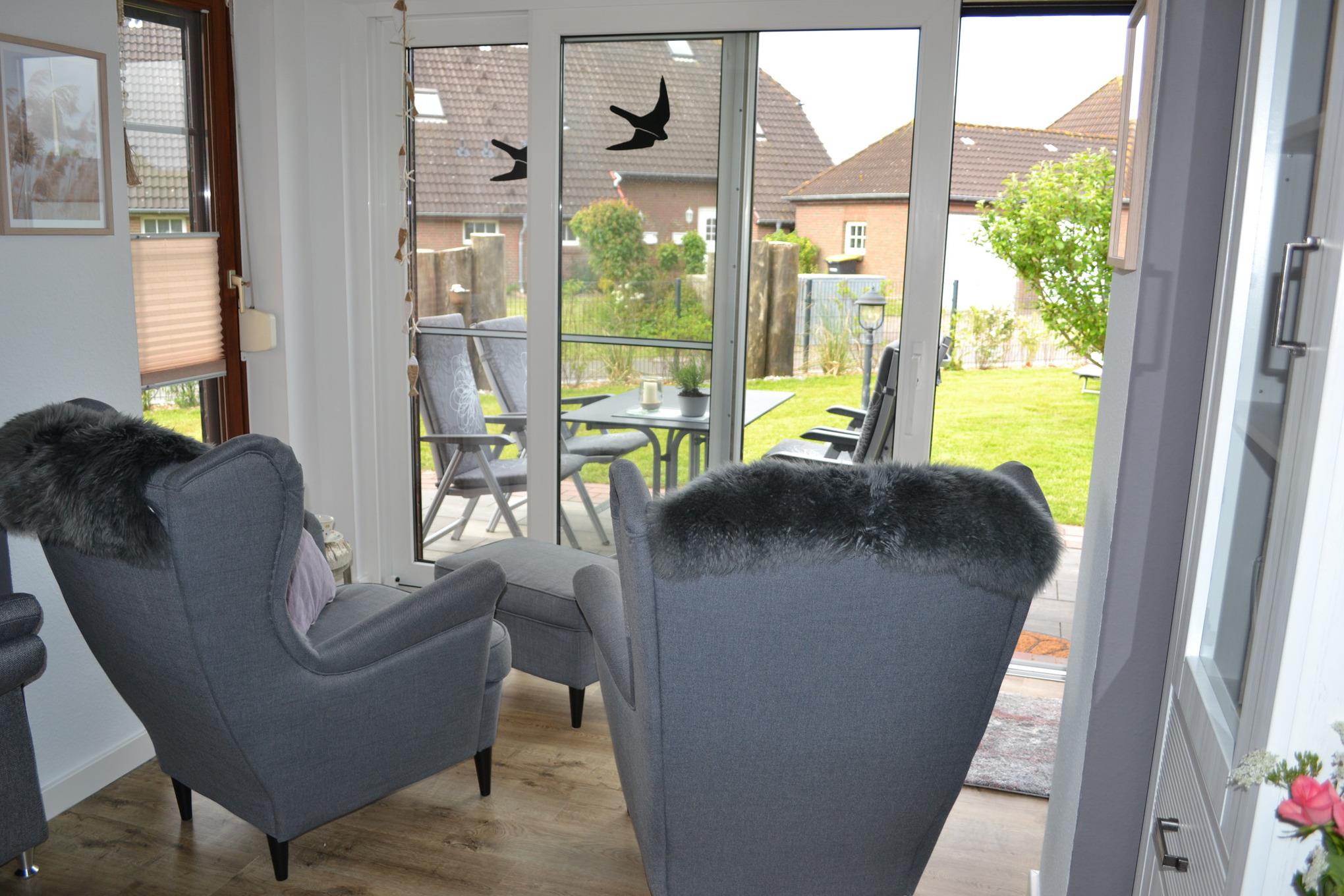 Im Ferienhaus "Nordseeruhe" erwartet Sie ab Juli 2023 ein gemütlicher Wohn- und Essbereich im offenen Stil. Die Küche ist räumlich abgetrennt und erstrahlt in neuem Glanz. Sie ist mit einem großen Kühlschrank, Backofen, Cerankochfeld, Spülmaschine und allen Küchenutensilien ausgestattet. Vom Wohnbereich aus gelangen Sie durch einen Wintergarten direkt auf die Terrasse. Die Terrasse ist überdacht und mit komfortablen Gartenmöbeln sowie einem eigenen Strandkorb ausgestattet, sodass gemütlichen Grillabenden an der frischen Nordseeluft nichts im Wege steht. An kälteren Tagen können Sie vor dem Kamin im Wohnbereich entspannte Stunden verbringen.