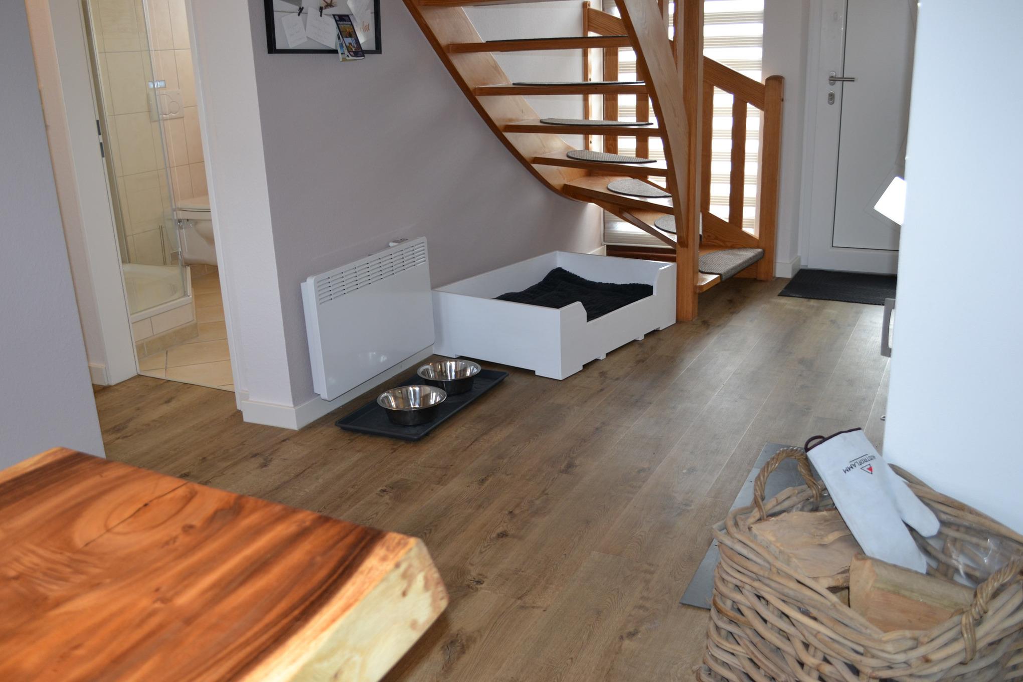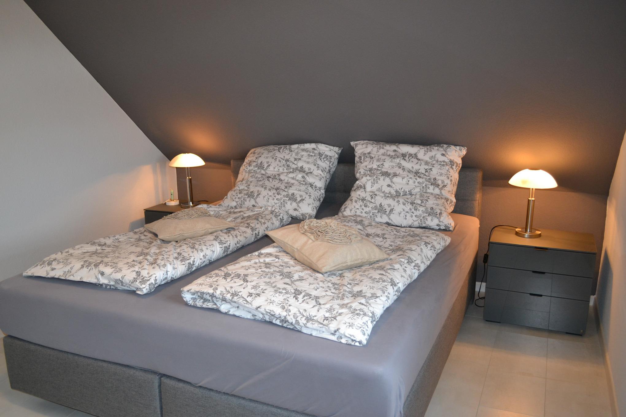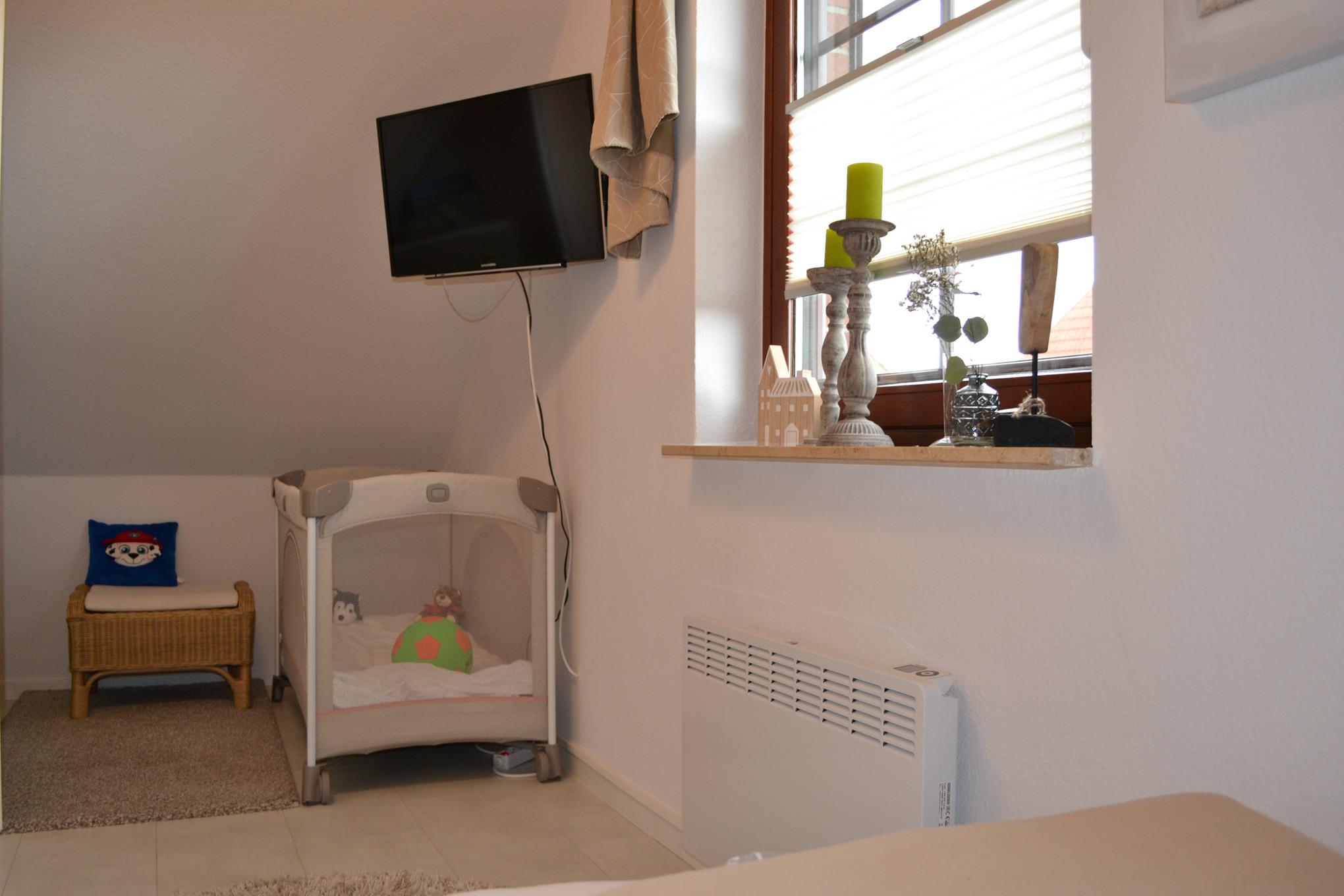 Im Obergeschoss des Ferienhauses bieten zwei Schlafzimmer mit Doppelbett und zwei Einzelbetten Platz für bis zu 4 Personen. Ein Kinderreisebett und ein Hochstuhl stehen unseren kleinen Gästen kostenlos zur Verfügung. Im Ferienhaus "Nordseeruhe" gibt es eine Toilette im Obergeschoss sowie ein modernes Badezimmer mit ebenerdiger Dusche im Untergeschoss. Eine Waschmaschine und ein Wäschetrockner stehen Ihnen zur freien Verfügung.