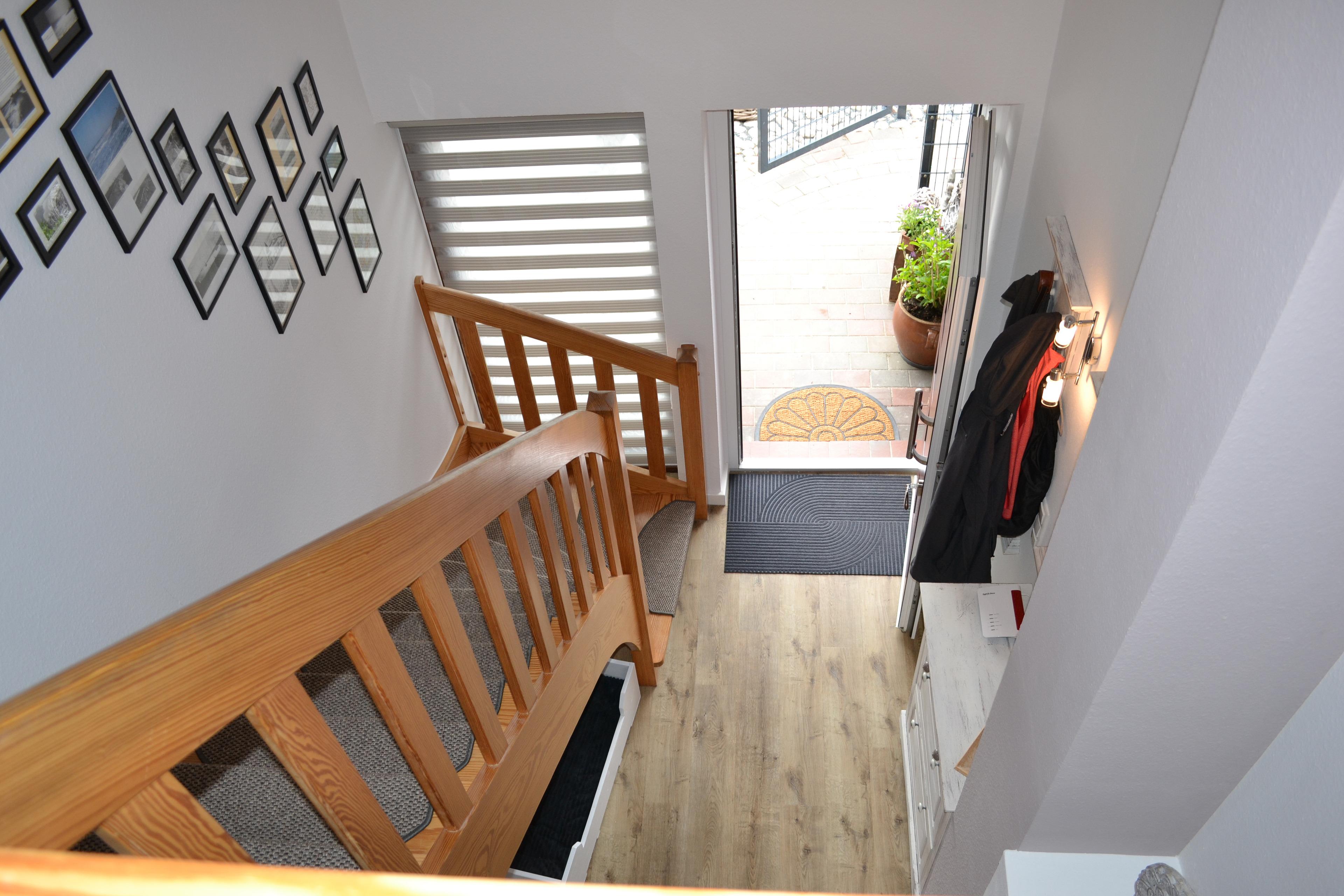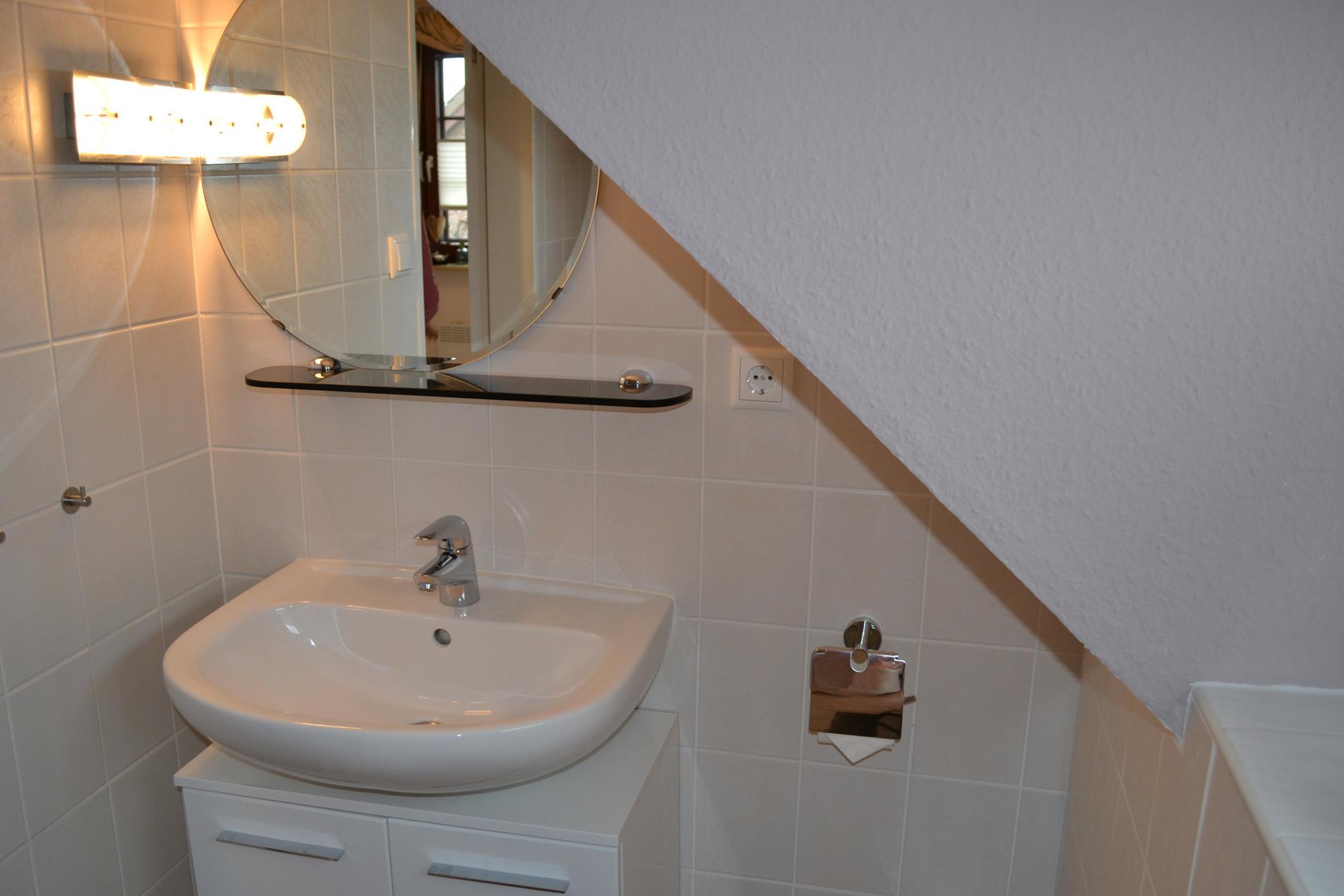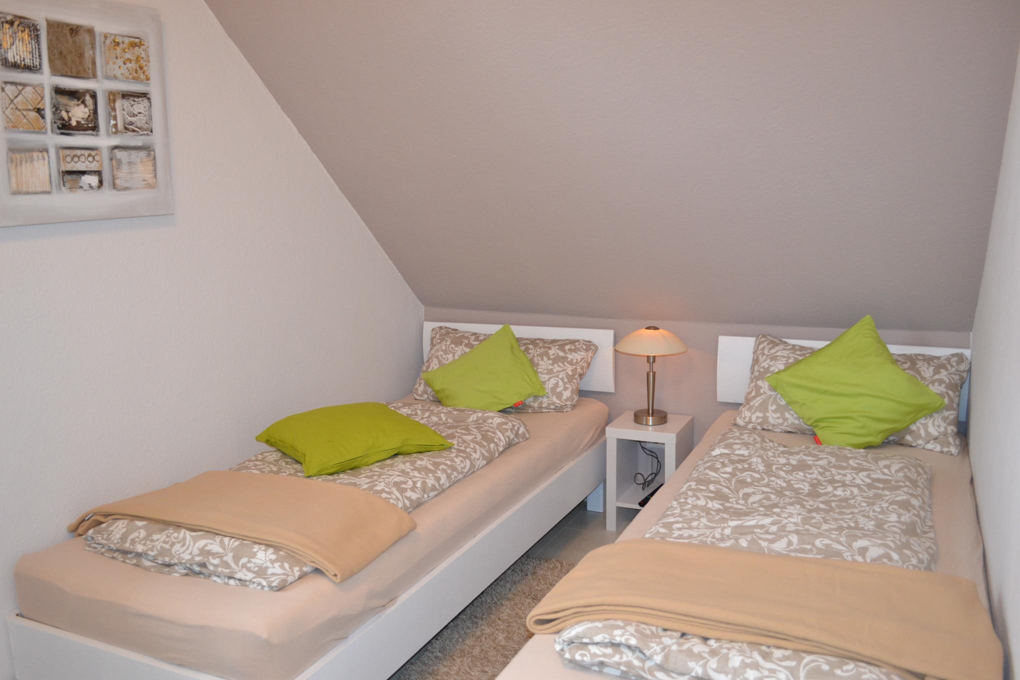 Im Obergeschoss des Ferienhauses bieten zwei Schlafzimmer mit Doppelbett und zwei Einzelbetten Platz für bis zu 4 Personen. Ein Kinderreisebett und ein Hochstuhl stehen unseren kleinen Gästen kostenlos zur Verfügung. Im Ferienhaus "Nordseeruhe" gibt es eine Toilette im Obergeschoss sowie ein modernes Badezimmer mit ebenerdiger Dusche im Untergeschoss. Eine Waschmaschine und ein Wäschetrockner stehen Ihnen zur freien Verfügung.