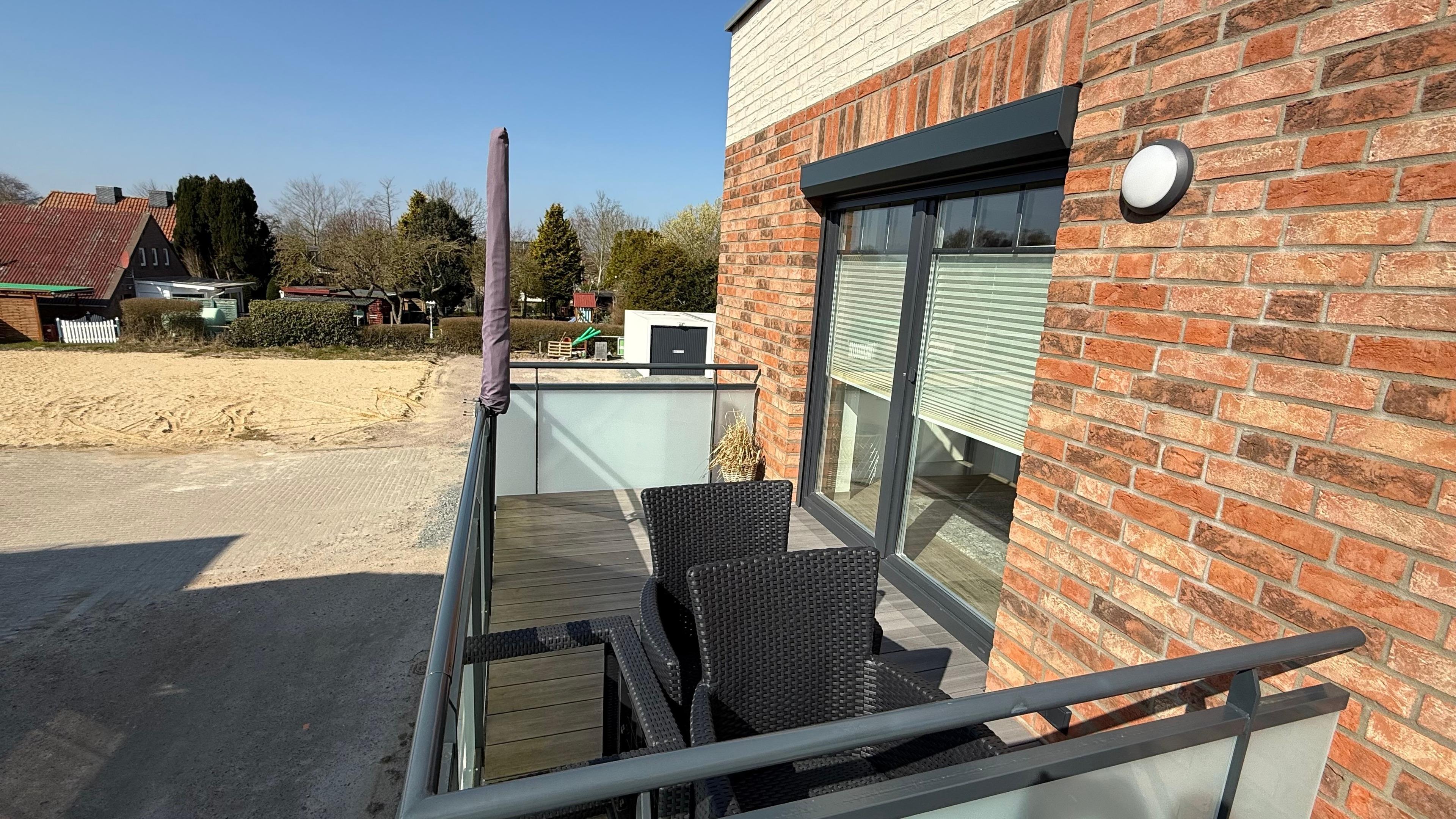 Einem Balkon mit gemütlichem Balkonmöbel.