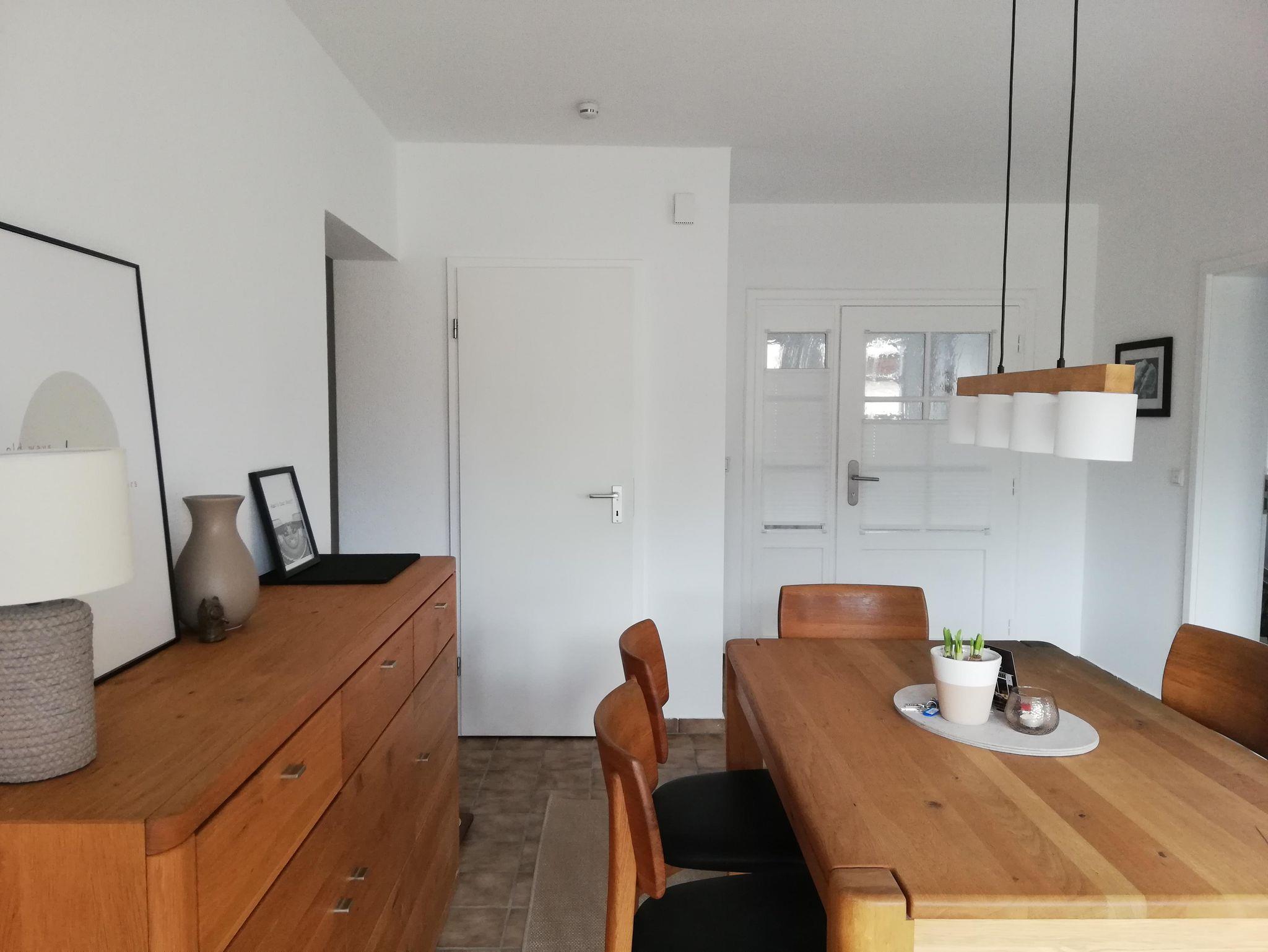 Die Ferienwohnung ist mit allen notwendigen Annehmlichkeiten eingerichtet, einschließlich einer voll ausgestatteten Küche mit Kühlschrank, Backofen, Geschirrspülmaschine, Kaffeemaschine und Geschirr. Hier können Sie schnell und einfach Ihr Lieblingsessen zubereiten oder sich ganz in Ruhe neuen Rezeptideen aus dem Norden widmen. Vorschläge dafür liegen für Sie bereit! Das zur Diele mit Esstisch hin offene und große Wohnzimmer bietet Ihnen ein gemütliches neues Ecksofa, einen Fernseher und einen gekachelten Kaminofen, der angenehme Wärme an kühlen Wintertagen verströmt. Entspannte Film- oder Leseabende sind hier garantiert!