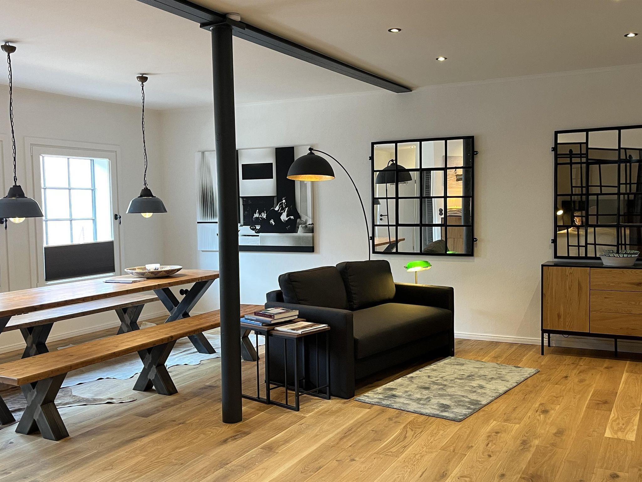 Das Loft verfügt über ein sehr schönes Schlafzimmer, daß vom Ess- und Wohn durch eine Glas/Stahlwand getrennt ist und abgedunkelt werden kann. Im Wohnbereich befindet sich ein Schlafsofa, auf dem ein bis zwei weitere Personen schlafen können. Am großzügigen Esstisch kann man arbeiten oder Mahlzeiten einnehmen.