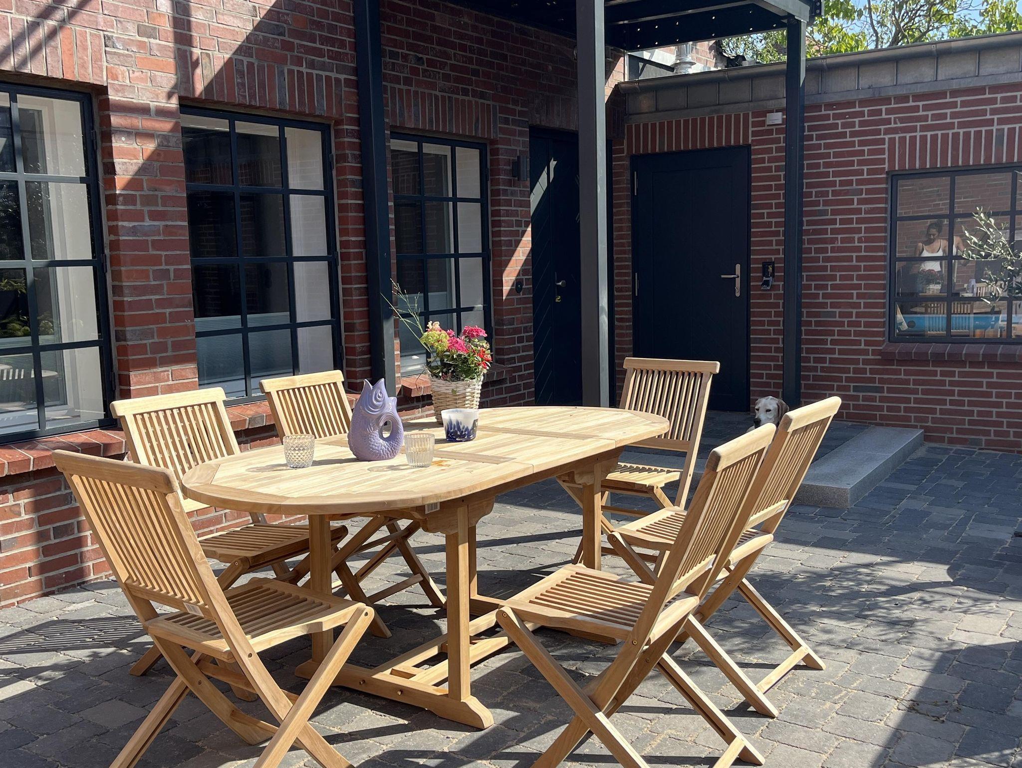 Bei schönem Wetter kann man auf der Sonnenterasse im Strandkorb sitzen oder am großen 6er Tisch arbeiten oder Mahlzeiten einnehmen.