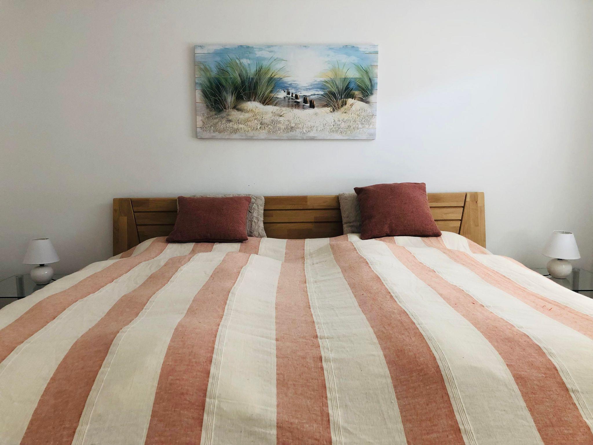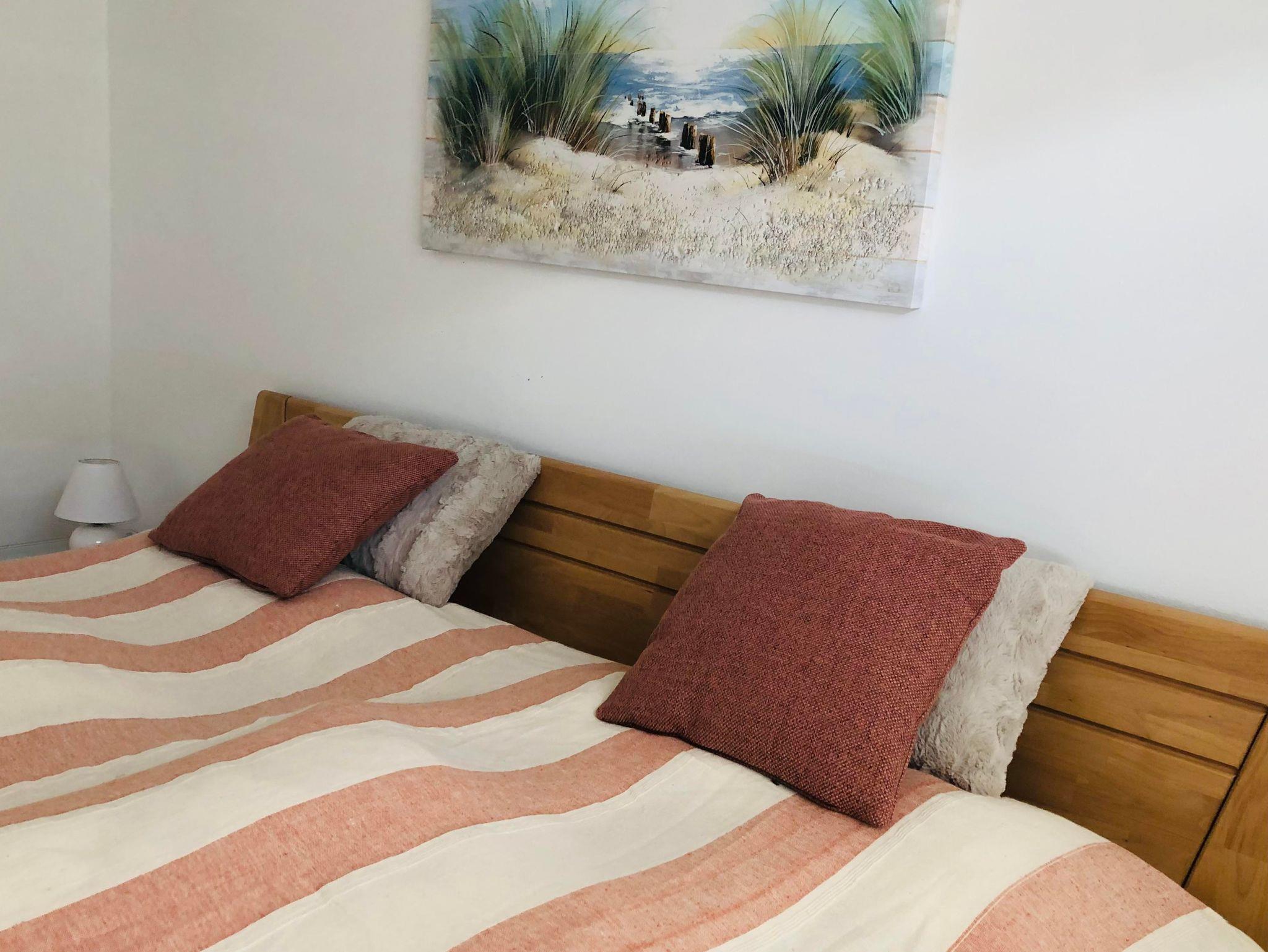 Großes, helles Wohnzimmer mit Essbereich und offenener Küche im EG. Von dort aus gelangt man in den Wintergarten des Ferienhauses mit Loungemöbeln sowie in den Hauswirtschaftsraum mit Gäste WC. Über eine Holztreppe in der Eingangsdiele erreicht man das Obergeschoß des Altstadthus mit einer Leseecke sowie einem modernen Duschbad und dem geräumigen, hellen Schlafzimmer.