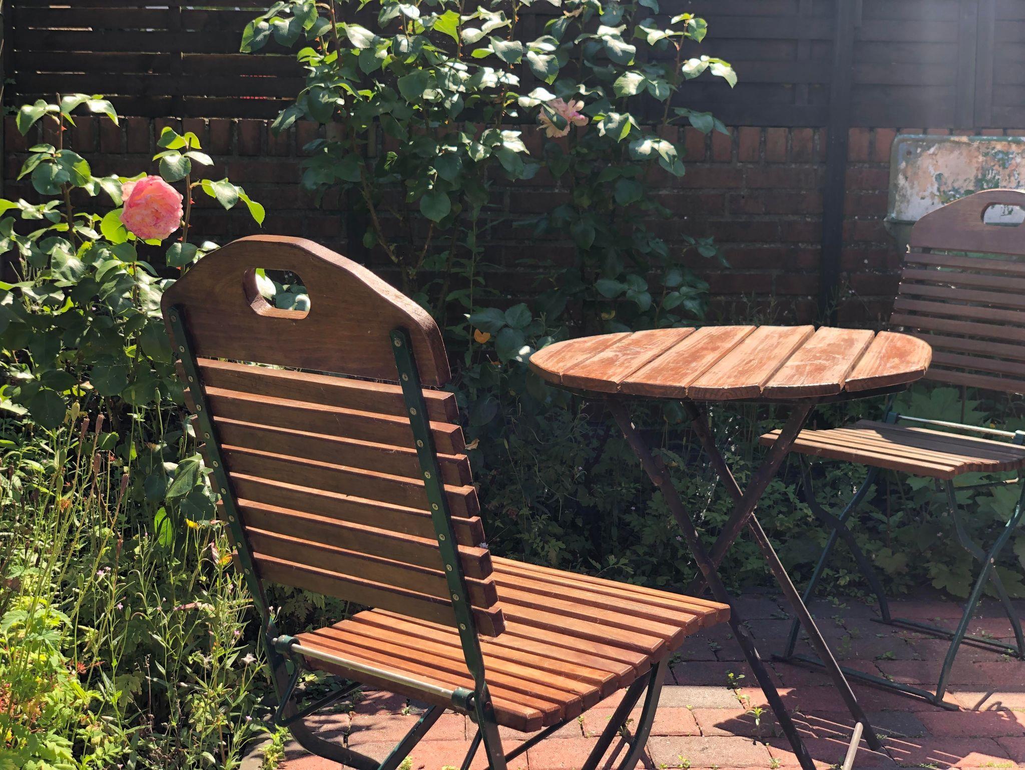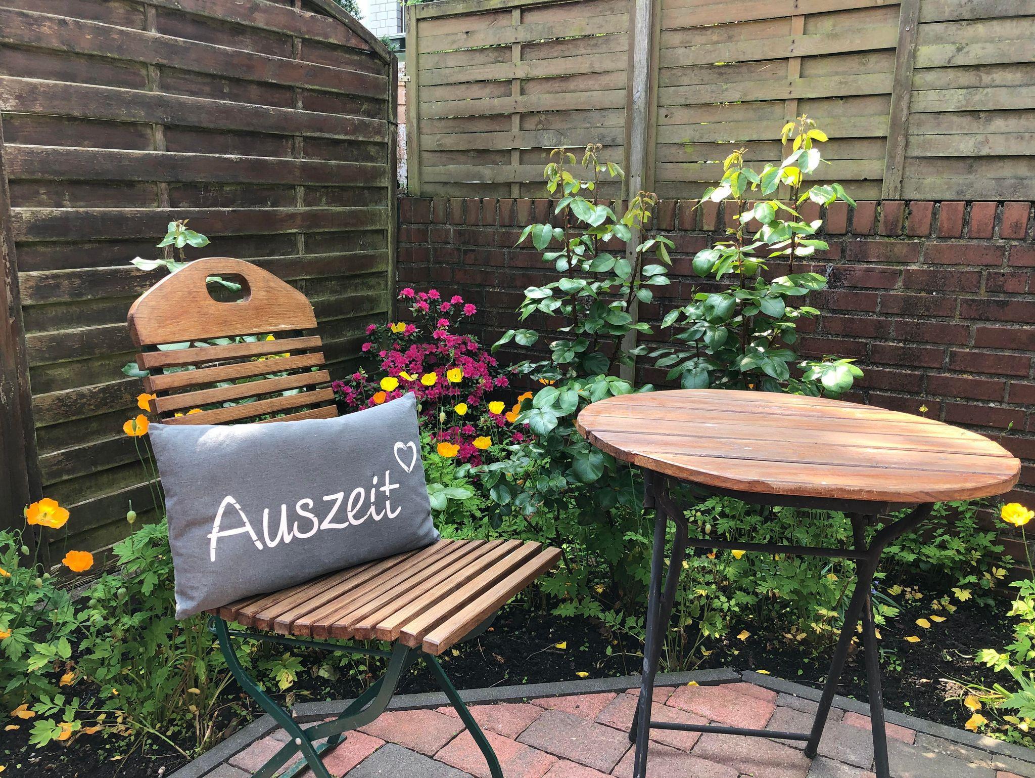 Weiterhin lädt der romantische kleine Garten mit Bistrotisch und Hochlehnerstühlen zum Entspannen und Sonne Tanken ein.