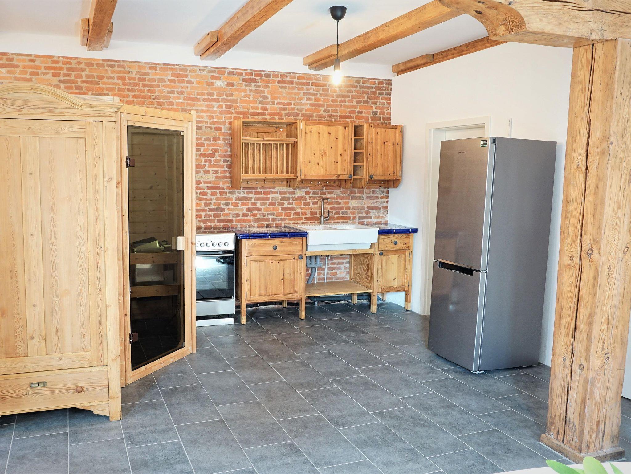 Im Erdgeschoss befindet sich ein großer Wohnbereich mit Sauna. Von dort aus geht es direkt in eine seperate Küche mit einem Kühlschrank, einem Backofen, einem Ceranfeld, einer Mikrowelle und einem Gefrierfach. Dort befinden sich auch zwei Einzelbetten.