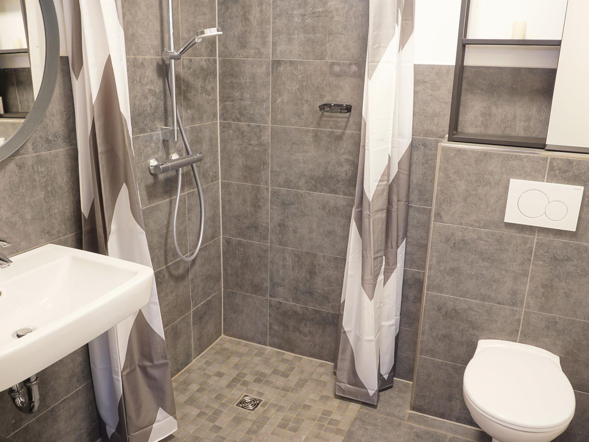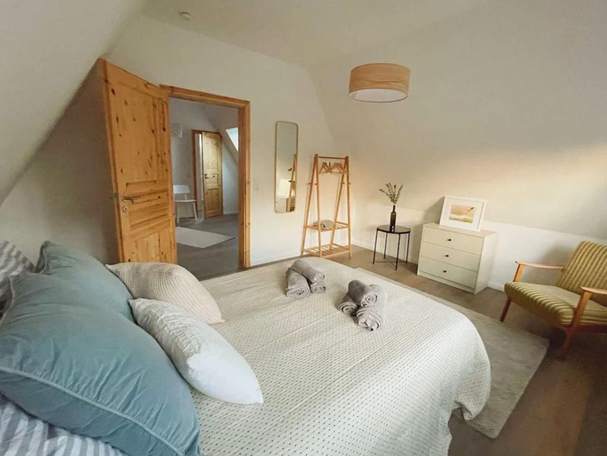 Auf 120m² finden bis zu 6 Personen Platz. Im Erdgeschoß befindet sich ein großer Wohnbereich mit Sauna und geht in eine separate Küche über. Eine weitere großzügige Küche befindet sich im 1. Obergeschoß. Warme Beigetöne vermitteln eine gemütliche Atmosphäre. Zwei Doppelbettzimmer und ein Zweibettzimmer (2 Einzelbetten) sowie zwei Duschbäder stehen den Gästen zur Verfügung.