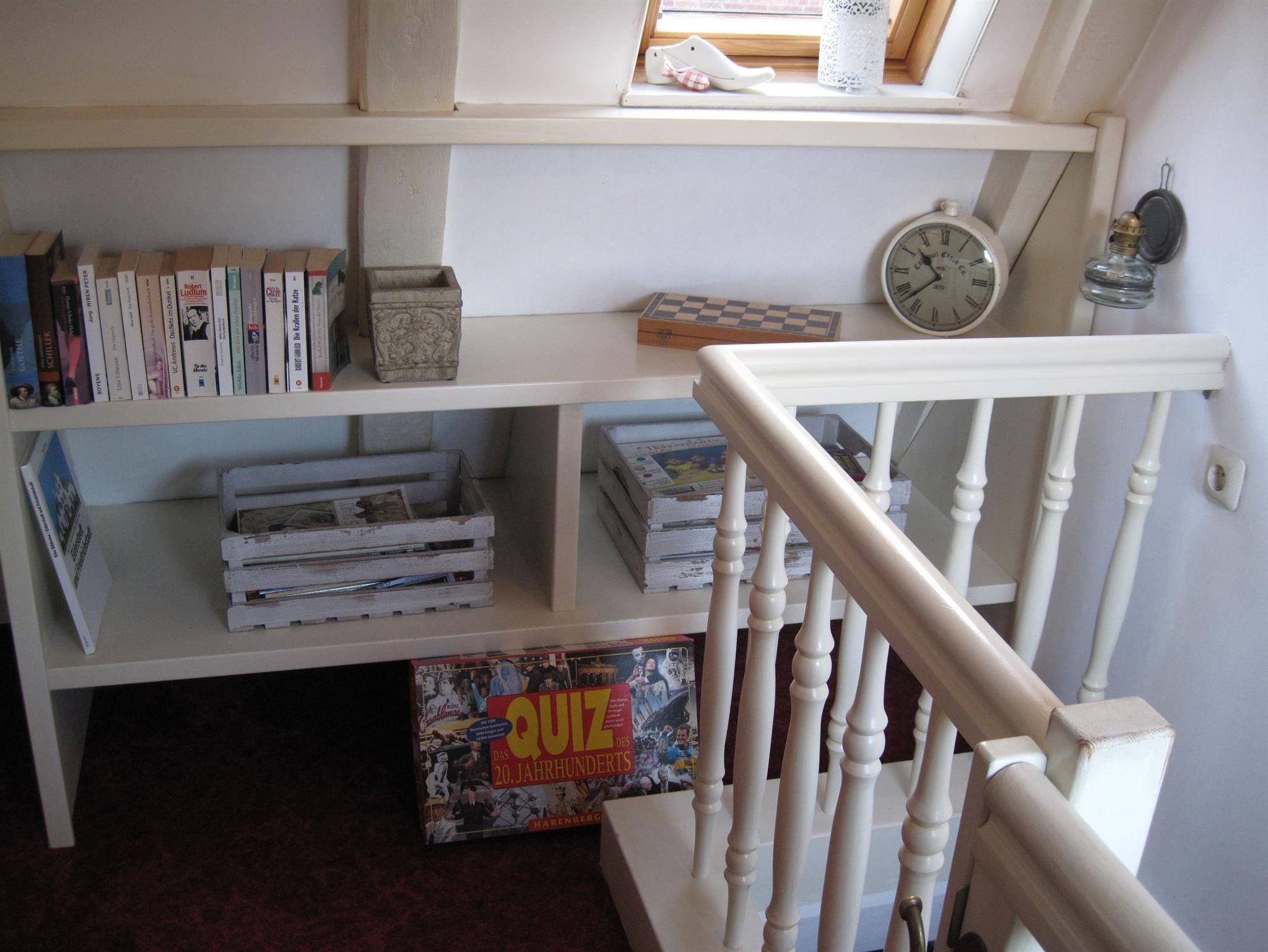 Im Obergeschoss liegt das Wohnzimmer mit Sessel und Schlafsofa, einem weiteren Esstisch mit Stühlen sowie einem kleinen Arbeitsplatz. Eine kleine aber feine Auswahl an DVDs, CDs, Büchern und Gesselschaftsspielen und ein kostenfreier Internetzugang über WLAN stehen den Gästen zur Verfügung.