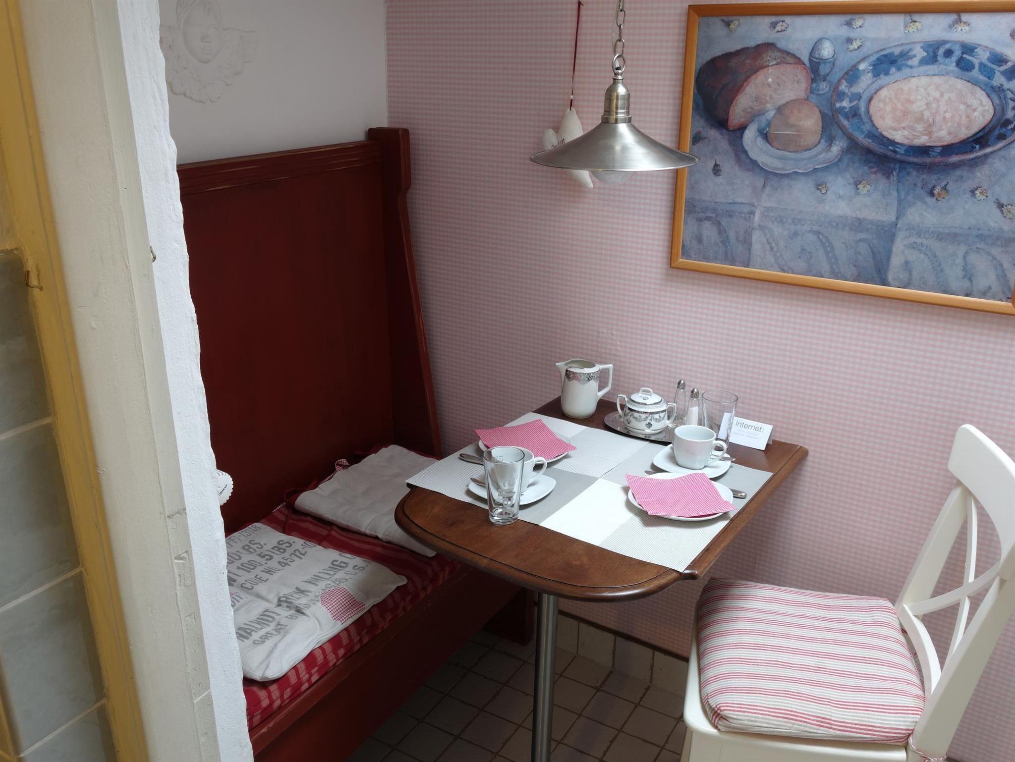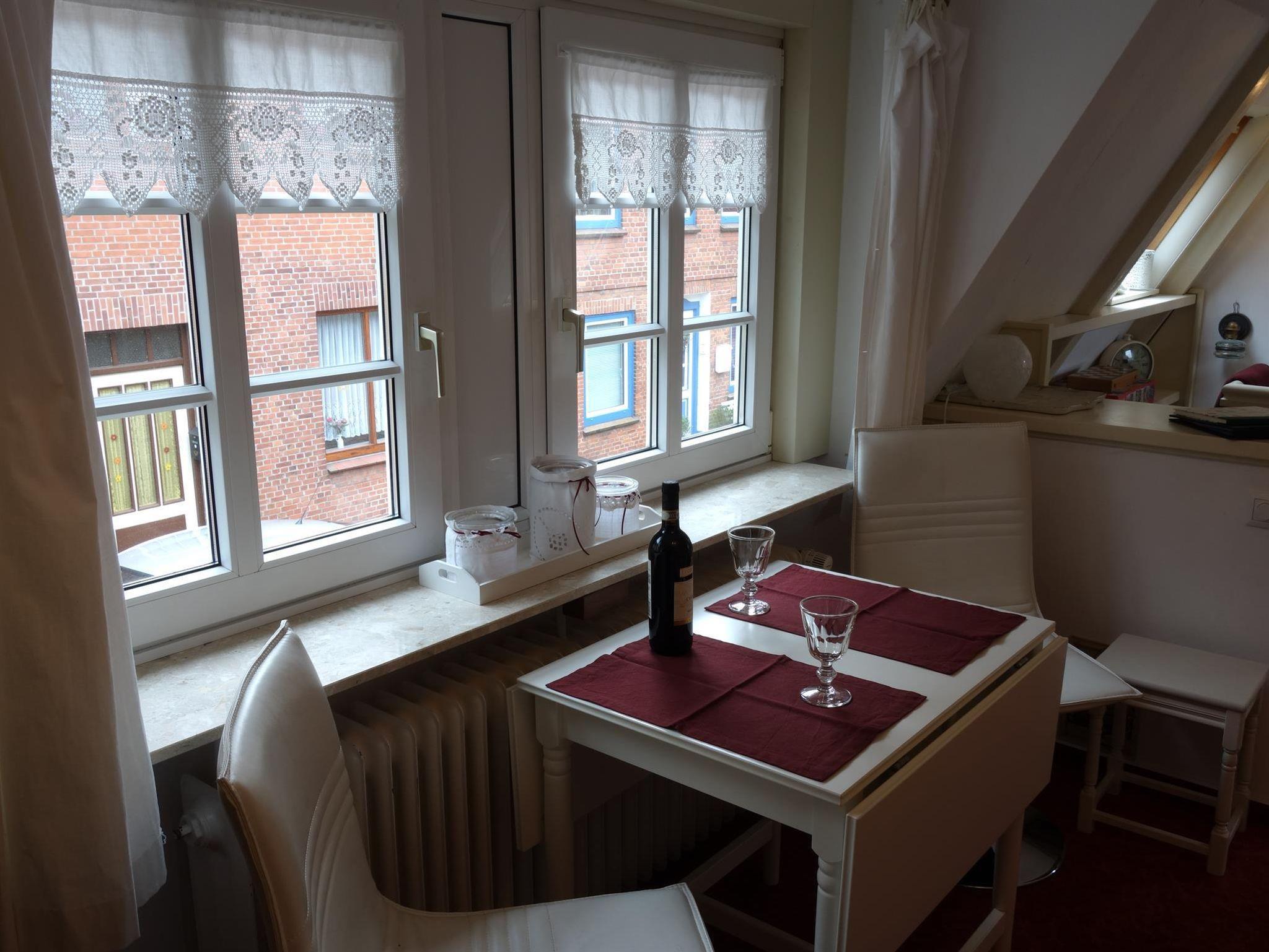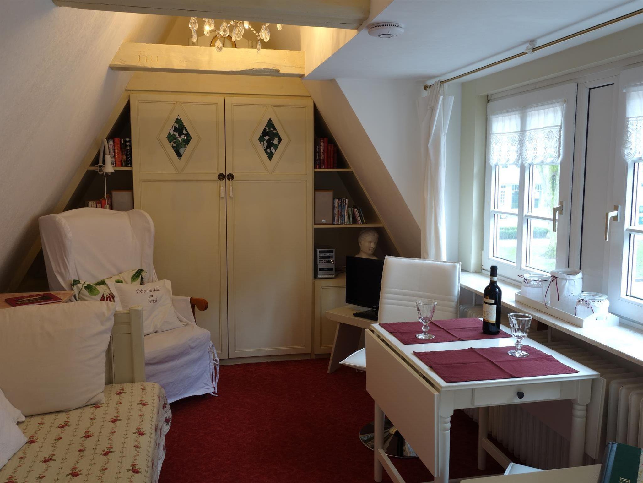 Unser kleines, mit Efeu bewachsenes Ferienhäuschen steht in der Altstadt von Nordfrieslands historischem Stadtdenkmal Friedrichstadt. Die Westerlilienstraße geht direkt von dem mit Rosen bepflanzten Stadtfeld und seinen hohen Bäumen ab. Zum zentralen Marktplatz mit seinen berühmten Giebelhäusern sind es nur 200 m. Sie können direkt vor dem Haus parken oder in einer der zahlreichen weiteren kostenlosen Parkmöglichkeiten in unserer Straße. Den Charme des alten Hauses bewahrend, sind die zwei Zimmer auf zwei Etagen (ca. 40 qm²) mit vielen ausgefallenen antiken Stücken und Accessoires möbeliert. Im Untergeschoss befindet sich der Flur, das Schlafzimmer mit Doppelbett, das Duschbad, die voll ausgestattete Küche mit Geschirrspüller und einer Sitzecke. Im Obergeschoss liegt das Wohnzimmer mit Sessel und Schlafsofa, einem weiteren Esstisch mit Stühlen sowie einem kleinen Arbeitsplatz. Eine kleine aber feine Auswahl an DVDs, CDs, Büchern und Gesselschaftsspielen und ein kostenfreier Internetzugang über WLAN stehen den Gästen zur Verfügung. Das Schlafsofa kann für eine dritte Person aufgebetet werden. Selbstverständlich ist es bei zwei Gästen auch möglich, dass eine Person im Wohnzimmer, die andere im Schlafzimmer nächtigt.